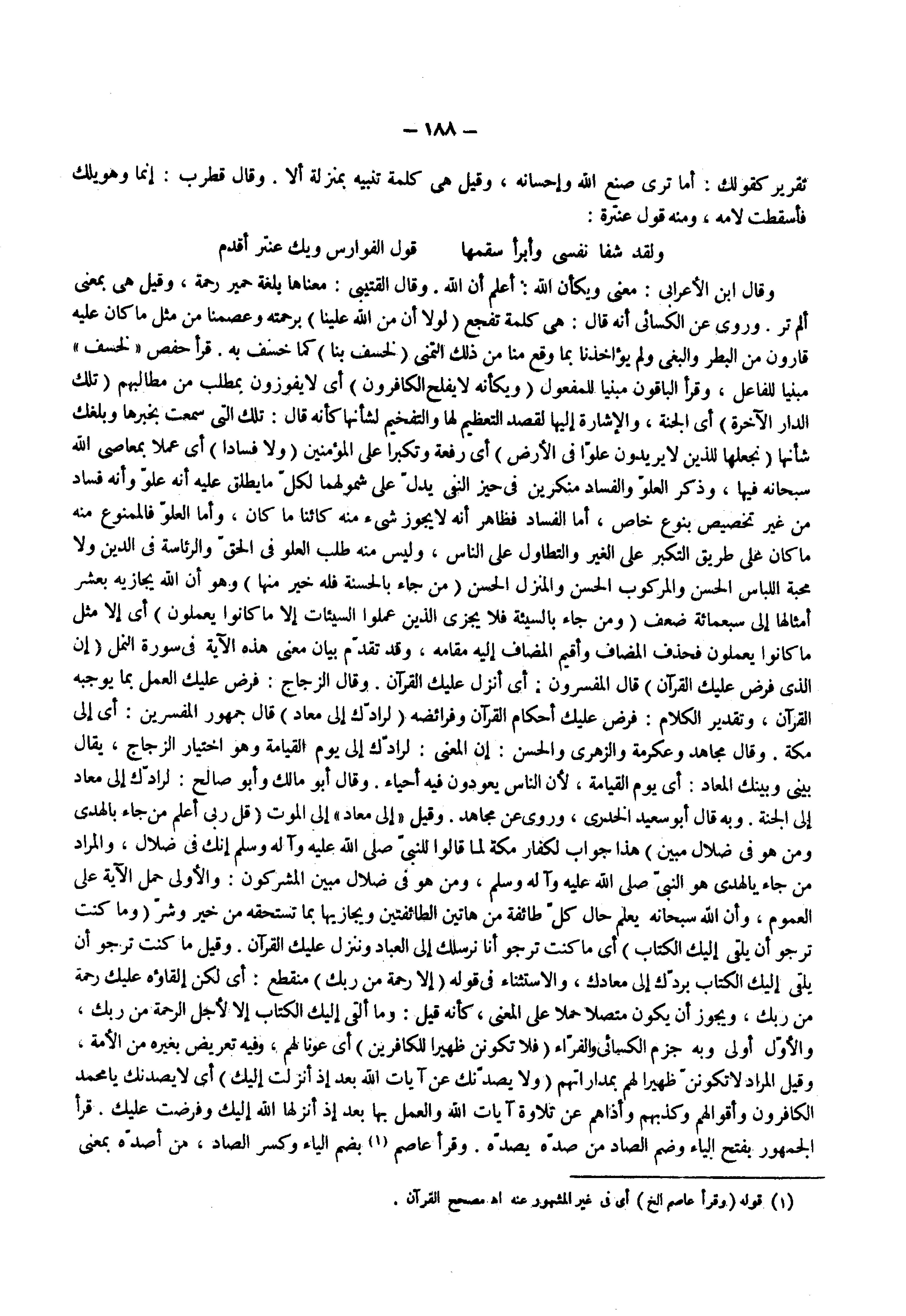 ) إن الذي فرض عليك القرآن ( قال المفسرون أي أنزل عليك القرآن وقال الزجاج فرض عليك العمل بما يوجبه القرآن وتقدير الكلام فرض عليك أحكام القرآن وفرائضه ) لرادك إلى معاد ( قال جمهور المفسرين إي إلى مكة وقال مجاهد وعكرمة والزهري والحسن إن المعنى لرادك إلى يوم القيامة وهو اختيار الزجاج يقال بيني وبينك المعاد أي يوم القيامة لأن الناس يعودون فيه أحياء وقال أبو مالك وأبو صالح لرادك إلى معاد إلى الجنة وبه قال أبو سعيد الخدري وروى عن مجاهد وقيل إلى معاد إلى الموت ) قل ربي أعلم من جاء بالهدى ومن هو في ضلال مبين ( هذا جواب لكفار مكة لما قالوا للنبي صلى الله عليه واله وسلم إنك في ضلال والمراد من جاء بالهدى هو النبي صلى الله عليه واله وسلم ومن هو في ضلال مبين المشركون والأولى حمل الآية على العموم وأن الله سبحانه يعلم حال كل طائفة من هاتين الطائفتين ويجازيها بما تستحقه من خير وشر