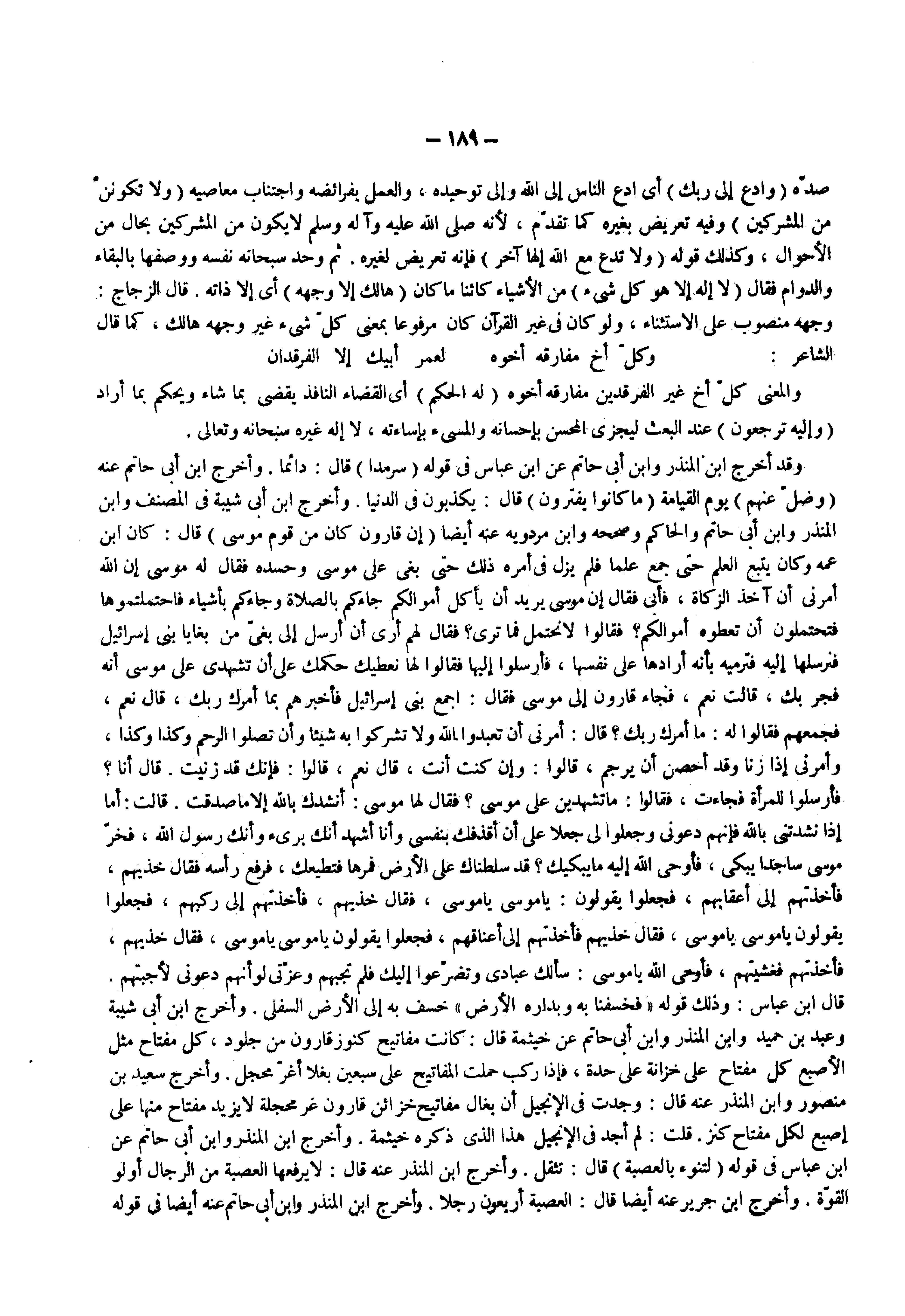 وقد أخرج ابن المنذر وابن أبي حاتم عن ابن عباس في قوله سرمدا قال دائما وأخرج ابن أبي حاتم عنه ) وضل عنهم ( يوم القيامة ) ما كانوا يفترون ( قال يكذبون في الدنيا وأخرج ابن أبي شيبة في المصنف وابن المنذر وابن أبي حاتم والحاكم وصححه وابن مردويه عنه أيضا ) إن قارون كان من قوم موسى ( قال كان ابن عمه وكان يتبع العلم حتى جمع علما فلم يزل في أمره ذلك حتى بغى على موسى وحسده فقال له موسى إن الله أمرني أن آخذ الزكاة فأبى فقال إن موسى يريد أن ياكل أموالكم جاءكم بالصلاة وجاءكم بأشياء فاحتملتموها فتحتملون أن تعطوه أموالكم فقالوا لا نحتمل فما ترى فقال لهم أرى أن أرسل إلى بغى من بغايا بني إسرائيل فنرسلها إليه فترميه بأنه أرادها على نفسها فأرسلوا إليها فقالوا لها نعطيك حكمك على أن تشهدى على موسى أنه فجر بك قالت نعم فجاء قارون إلى موسى فقال اجمع بني إسرائيل فأخبرهم بما أمرك ربك قال نعم فجمعهم فقالوا له ما أمرك ربك قال أمرني أن تعبدوا الله ولا تشركوا به شيئا وأن تصلوا الرحم وكذا وكذا وأمرني إذا زنا وقد أحصن أن يرجم قالوا وإن كنت أنت قال نعم قالوا فإنك قد زنيت قال أنا فأرسلوا للمرأة فجاءت فقالوا ما تشهدين على موسى فقال لها موسى أنشدك بالله إلا ما صدقت قالت أما إذا نشدتني بالله فإنهم دعوني وجعلوا لي جعلا على أن أقذفك بنفسي وأنا أشهد أنك برىء وأنك رسول الله فخر موسى ساجدا يبكي فأوحى الله إليه ما يبكيك قد سلطناك على الأرض فمرها فتعطيك فرفع رأسه فقال خذيهم فأخذتهم إلى أعقابهم فجعلوا يقولون يا موسى يا موسى فقال خذيهم فأخذتهم إلى ركبهم فجعلوا يقولون يا موسى يا موسى فقال خذيهم فأخذتهم إلى أعناقهم فجعلوا يقولون يا موسى يا موسى فقال خذيهم فأخذتهم فغشيتهم فأوحى الله يا موسى سألك عبادي وتضرعوا إليك فلم تجبهم وعزني لو أنهم دعوني لأجبتهم قال ابن عباس وذلك قوله فخسفنا به وبداره الأرض خسف به إلى الأرض السفلى وأخرج ابن أبي شيبة وعبد بن حميد وابن المنذر وابن أبي حاتم عن خيثمة قال كانت مفاتيح كنوز قارون من جلود كل مفتاح مثل الأصبع كل مفتاح على خزانة على حدة فإذا ركب حملت المفاتيح على سبعين بغلا أعز محجل وأخرج سعيد بن منصور وابن المنذر عنه قال وجدت في الإنجيل أن بغال مفاتيح خزائن قارون غر محجلة لا يزيد مفتاح منها على أصبع لكل مفتاح كنز قلت لم أجد في الإنجيل هذا الذي ذكره خيثمة وأخرج ابن المنذر وابن أبي حاتم عن ابن عباس في قوله ) لتنوء بالعصبة ( قال تثقل وأخرج ابن المنذر عنه قال لا يرفعها العصبة من الرجال أو لو القوة وأخرج ابن جرير عنه أيضا قال العصبة أربعون رجلا وأخرج ابن المنذر وابن أبي حاتم عنه أيضا في قوله