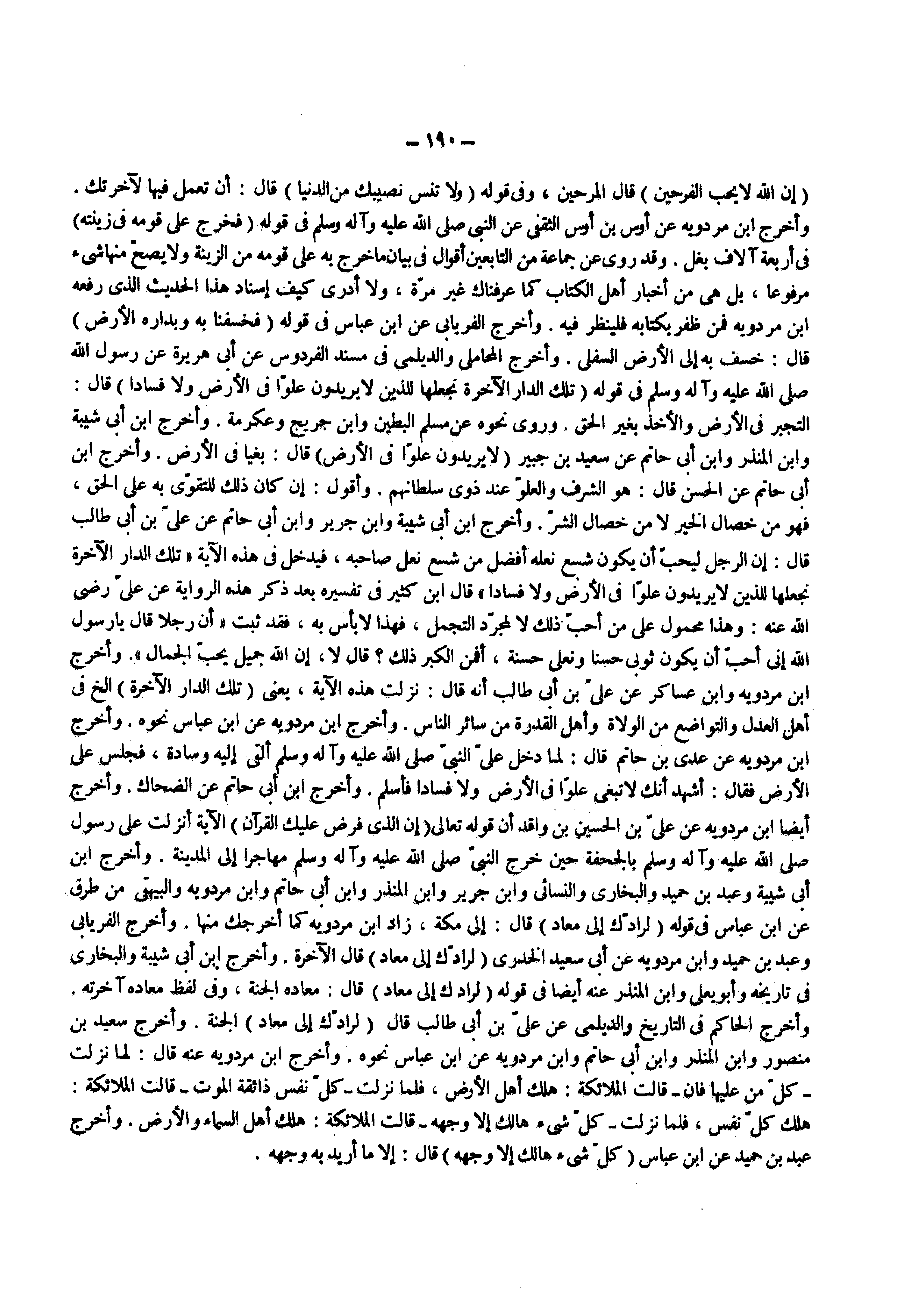 ) إن الله لا يحب الفرحين ( قال المرحين وفي قوله ) ولا تنس نصيبك من الدنيا ( قال أن تعمل فيها لاخرتك وأخرج ابن مردويه عن أوس بن أوس الثقفي عن النبي صلى الله عليه واله وسلم في قوله ) فخرج على قومه في زينته ( في أربعة آلاف بغل وقد روى عن جماعة من التابعين أقوال في بيان ما خرج به على قومه من الزينة ولا يصح منها شيء مرفوعا بل هي من أخبار أهل الكتاب كما عرفناك غير مرة ولا أدري كيف إسناد هذا الحديث الذي رفعه ابن مردويه فمن ظفر بكتابه فلينظر فيه وأخرج الفريابي عن ابن عباس في قوله ) فخسفنا به وبداره الأرض ( قال خسف به إلى الأرض السفلي وأخرج المحاملي والديلمي في مسند الفردوس عن أبي هريرة عن رسول الله صلى الله عليه واله وسلم في قوله ) تلك الدار الآخرة نجعلها للذين لا يريدون علوا في الأرض ولا فسادا ( قال التجبر في الأرض والأخذ بغير الحق وروى نحوه عن مسلم البطين وابن جريج وعكرمه وأخرج ابن أبي شيبة وابن المنذر وابن أبي حاتم عن سعيد بن جبير ) لا يريدون علوا في الأرض ( قال بغيا في الأرض وأخرج ابن أبي حاتم عن الحسن قال هو الشرف والعلو عند ذوي سلطانهم وأقول إن كان ذلك للتقوى به على الحق فهو من خصال الخير لا من خصال الشر وأخرج ابن أبن أبي شيبة وابن جرير وابن أبي حاتم عن علي بن أبي طالب قال إن الرجل ليحب أن يكون شسع نعله أفضل من شسع نعل صاحبه فيدخل في هذه الاية تلك الدار الاخرة نجعلها للذين لا يريدون علوا في الأرض ولا فسادا قال ابن كثير في تفسيره بعد ذكر هذه الرواية عن علي رضي الله عنه وهذا محمول على من أحب ذلك لا لمجرد التجمل فهذا لا بأس به فقد ثبت أن رجلا قال يا رسول الله إني أحب أن يكون ثوبى حسنا ونعلى حسنة أفمن الكبر ذلك قال لا إن الله جميل يحب الجمال وأخرج ابن مردويه وابن عساكر عن علي بن أبي طالب أنه قال نزلت هذه الاية يعني تلك الدار الاخرة الخ في أهل العدل والتواضع من الولاة وأهل القدرة من سائر الناس وأخرج ابن مردويه عن ابن عباس نحوه وأخرج ابن مردويه عن عدي بن حاتم قال لما دخل على النبي صلى الله عليه واله وسلم ألقى إليه وسادة فجلس على الأرض فقال أشهد أنك لا تبغى علوا في الأرض ولا فسادا فأسلم وأخرج ابن أبي حاتم عن الضحاك وأخرج أيضا ابن مردويه عن علي بن الحسين بن واقد أن قوله تعالى ) إن الذي فرض عليك القرآن ( الآية أنزلت على رسول الله صلى الله عليه واله وسلم بالجحفة حين خرج النبي صلى الله عليه واله وسلم مهاجرا إلى المدينة وأخرج ابن أبي شيبة وعبد بن حميد والبخاري والنسائي وابن جرير وابن المنذر وابن أبي حاتم وابن مردويه والبيهقي من طرق عن ابن عباس في قوله ) لرادك إلى معاد ( قال إلى مكة زاد ابن مردويه كما أخرجك منها وأخرج الفريابي وعبد بن حميد وابن مردويه عن أبي سعيد الخدري ) لرادك إلى معاد ( قال الاخرة وأخرج ابن أبي شيبة والبخاري في تاريخه وأبو يعلى وابن المنذر عنه أيضا في قوله ) لرادك إلى معاد ( قال معاده الجنة وفي لفظ معاده اخرته وأخرج الحاكم في التاريخ والديلمي عن علي بن أبي طالب قال ) لرادك إلى معاد ( الجنة وأخرج سعيد بن منصور وابن المنذر وابن أبى حاتم وابن مردويه عن ابن عباس نحوه وأخرج ابن مردويه عنه قال لما نزلت ) كل من عليها فان ( قالت الملائكة هلك أهل الأرض فلما نزلت ) كل نفس ذائقة الموت ( قالت الملائكة هلك كل نفس فلما نزلت كل شيء هالك إلا وجهه قالت الملائكة هلك أهل السماء والأرض وأخرج عبد بن حميد عن ابن عباس ) كل شيء هالك إلا وجهه ( قال إلا ما أريد به وجهه