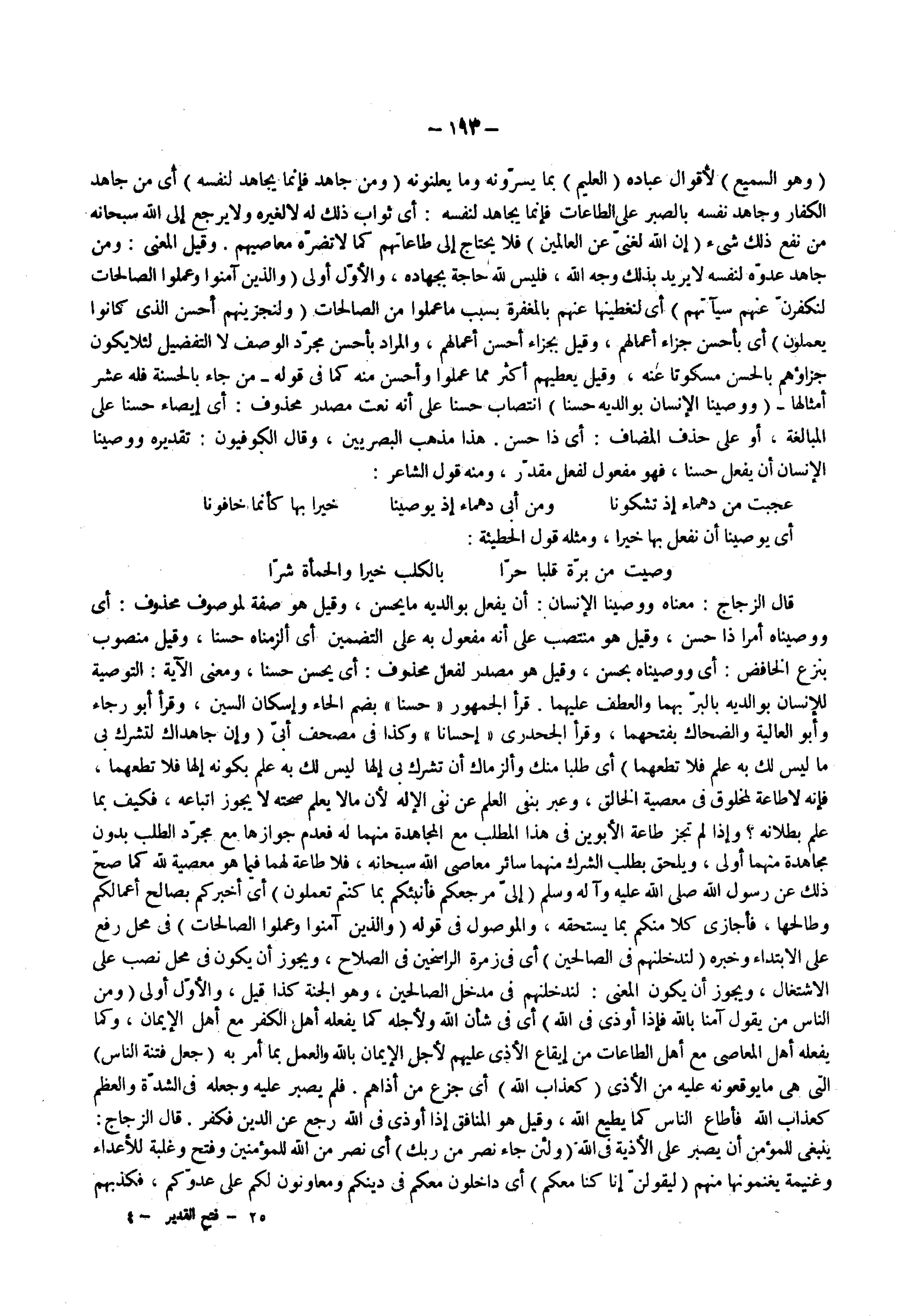 ) ووصينا الإنسان بوالديه حسنا ( انتصاب حسنا على أنه نعت مصدر محذوف أي إيصاء حسنا على المبالغة أو على حذف المضاف أي ذا حسن هذا مذهب البصريين وقال الكوفيون تقديره ووصينا الإنسان أن يفعل حسنا فهو مفعول لفعل مقدر ومنه قول الشاعر عجبت من دهماء إذ تشكونا