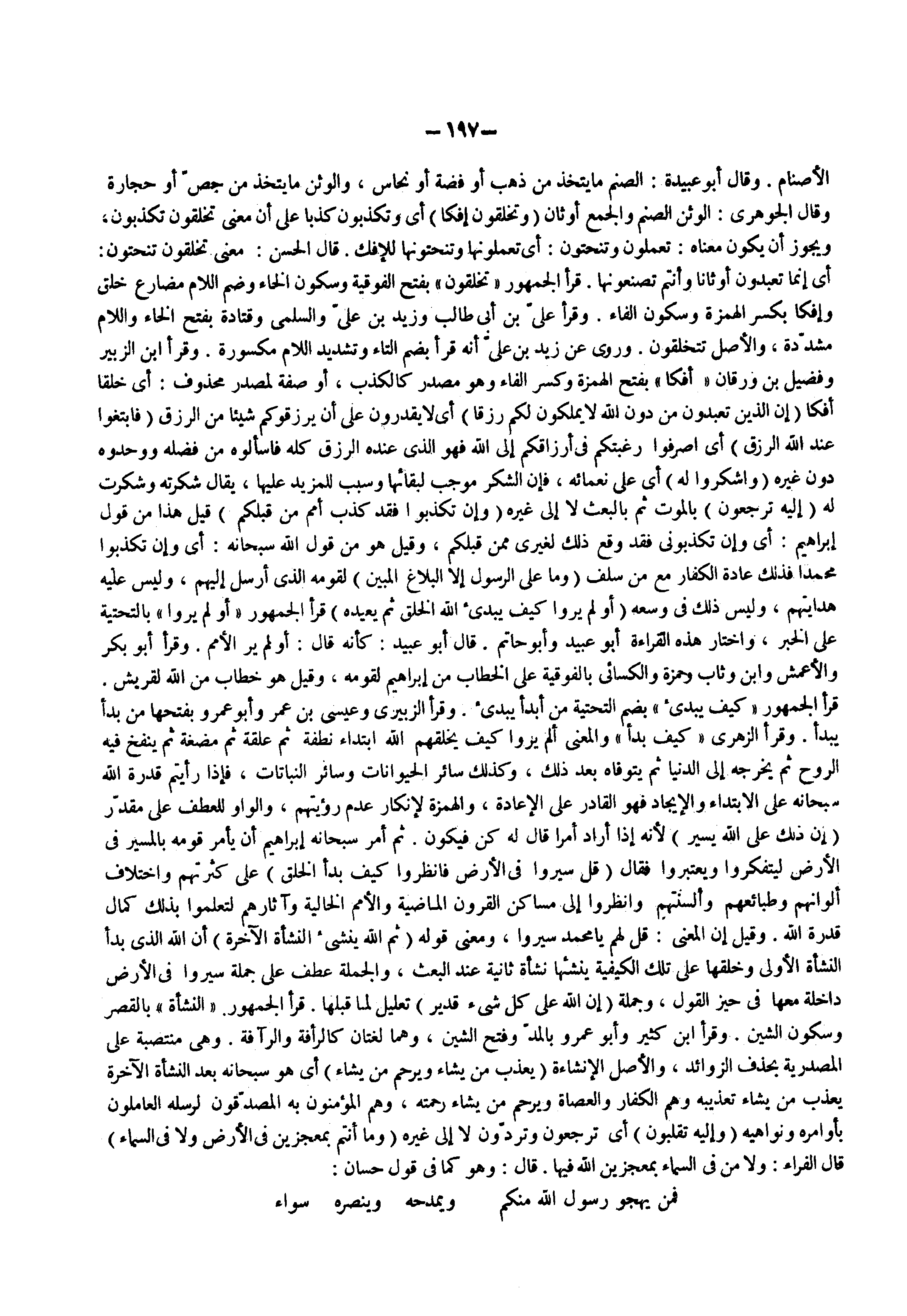 الأصنام وقال أبو عبيدة الصنم ما يتخذ من ذهب أو فضة أو نحاس والوثن ما يتخذ من جص أو حجارة وقال الجوهري الوثن الصنم والجمع أوثان ) وتخلقون إفكا ( أي وتكذبون كذبا على أن معنى تخلقون تكذبون ويجوز أن يكون معناه تعملون وتنحتون أي تعملونها وتنحتونها للإفك قال الحسن معنى تخلقون تنحتون أي إنما تعبدون أوثانا وأنتم تصنعونها قرأ الجمهور تخلقون بفتح الفوقية وسكون الخاء وضم اللام مضارع خلق وإفكا بكسر الهمزة وسكون الفاء وقرأ على بن أبي طالب وزيد بن علي والسلمي وقتادة بفتح الخاء واللام مشددة والأصل تتخلقون وروى عن زيد بن علي أنه قرأ بضم التاء وتشديد اللام مكسورة وقرأ ابن الزبير وفضيل بن ورقان أفكا بفتح الهمزة وكسر الفاء وهو مصدر كالكذب أو صفة لمصدر محذوف أي خلقا أفكا ) إن الذين تعبدون من دون الله لا يملكون لكم رزقا ( أي لا يقدرون على أن يرزقوكم شيئا من الرزق ) فابتغوا عند الله الرزق ( أي اصرفوا رغبتكم في أرزاقكم إلى الله فهو الذي عنده الرزق كله فاسألوه من فضله ووحدوه دون غيره ) واشكروا له ( أي على نعمائه فإن الشكر موجب لبقائها وسبب للمزيد عليها يقال شكرته وشكرت له ) إليه ترجعون ( بالموت ثم البعث لا إلى غيره
