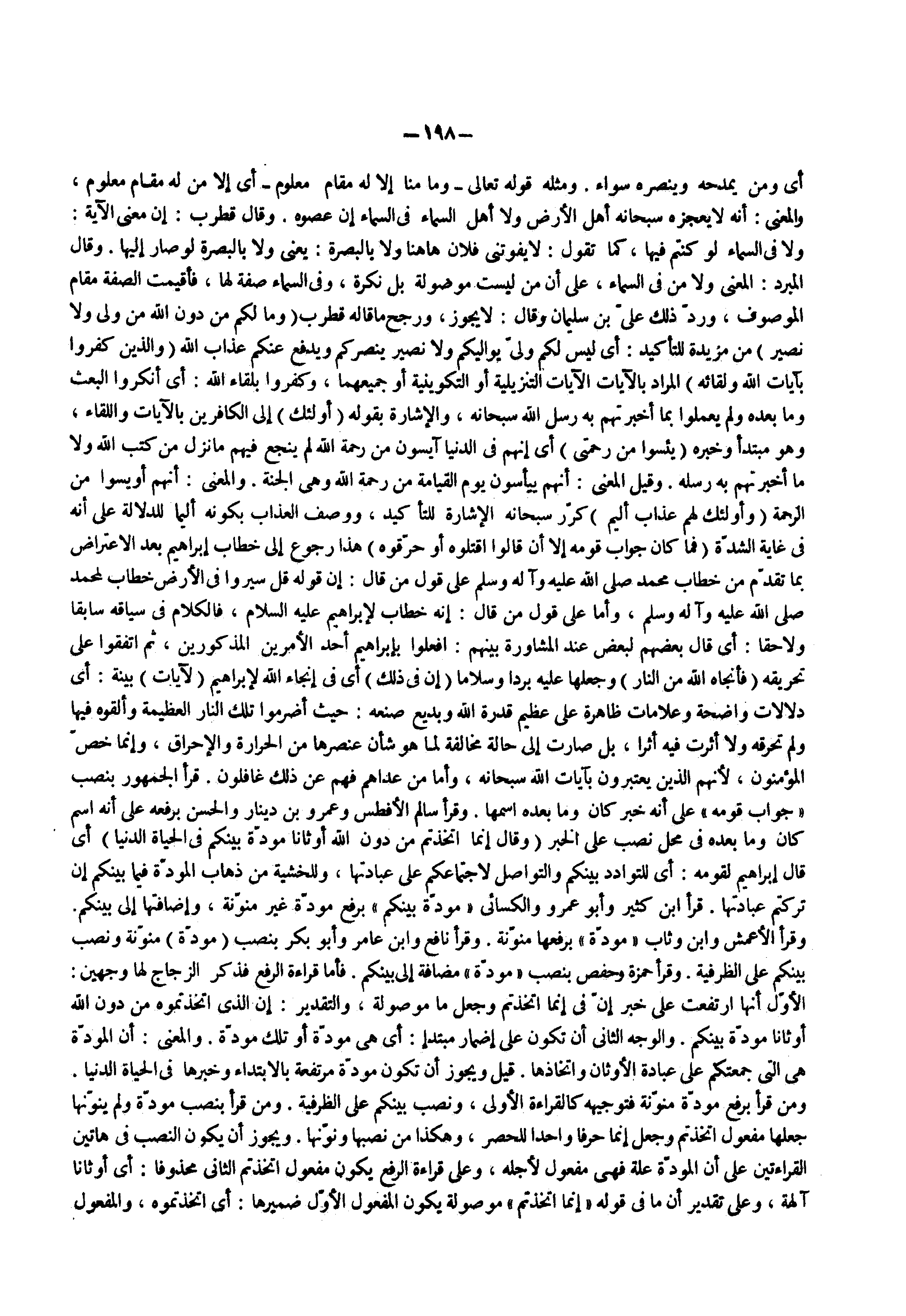 ) وقال إنما اتخذتم من دون الله أوثانا مودة بينكم في الحياة الدنيا ( أي قال إبراهيم لقومه أي للتوادد بينكم والتواصل لاجتماعكم على عبادتها وللخشية من ذهاب المودة فيما بينكم إن تركم عبادتها قرأ ابن كثير وأبو عمرو والكسائي مودة بينكم برفع مودة غير منونة وإضافتها إلى بينكم وقرأ الأعمش وابن وثاب مودة برفعها منونة وقرأ نافع وابن عامر وأبو بكر بنصب مودة منونة ونصب بينكم على الظرفية وقرأ حمزة وحفص بنصب مودة مضافة إلى بينكم فأما قراءة الرفع فذكر الزجاج لها وجهين الأول أنها ارتفعت على خبر إن في إنما اتخذتم وجعل ما موصولة والتقدير إن الذي اتخذتموه من دون الله أوثانا مودة بينكم والوجه الثاني أن تكون على إضمار مبتدإ أي هي مودة أو تلك مودة والمعنى أن المودة هي التي جمعتكم على عبادة الأوثان واتخاذها قيل ويجوز أن تكون مودة مرتفعة بالابتداء وخبرها في الحياة الدنيا ومن قرأ برفع مودة منونة فتوجيهه كالقراءة الأولى ونصب بينكم على الظرفية ومن قرأ بنصب مودة ولم ينونها جعلها مفعول اتخذتم وجعل إنما حرفا واحدا للحصر وهكذا من نصبها ونونها ويجوز أن يكون النصب في هاتين القراءتين على أن المودة علة فهي مفعول لأجله وعلى قراءة الرفع يكون مفعول اتخذتم الثاني محذوفا أي أوثانا الهة وعلى تقدير أن ما في قوله ) إنما اتخذتم ( موصولة يكون المفعول الأول ضميرها أي اتخذتموه والمفعول
