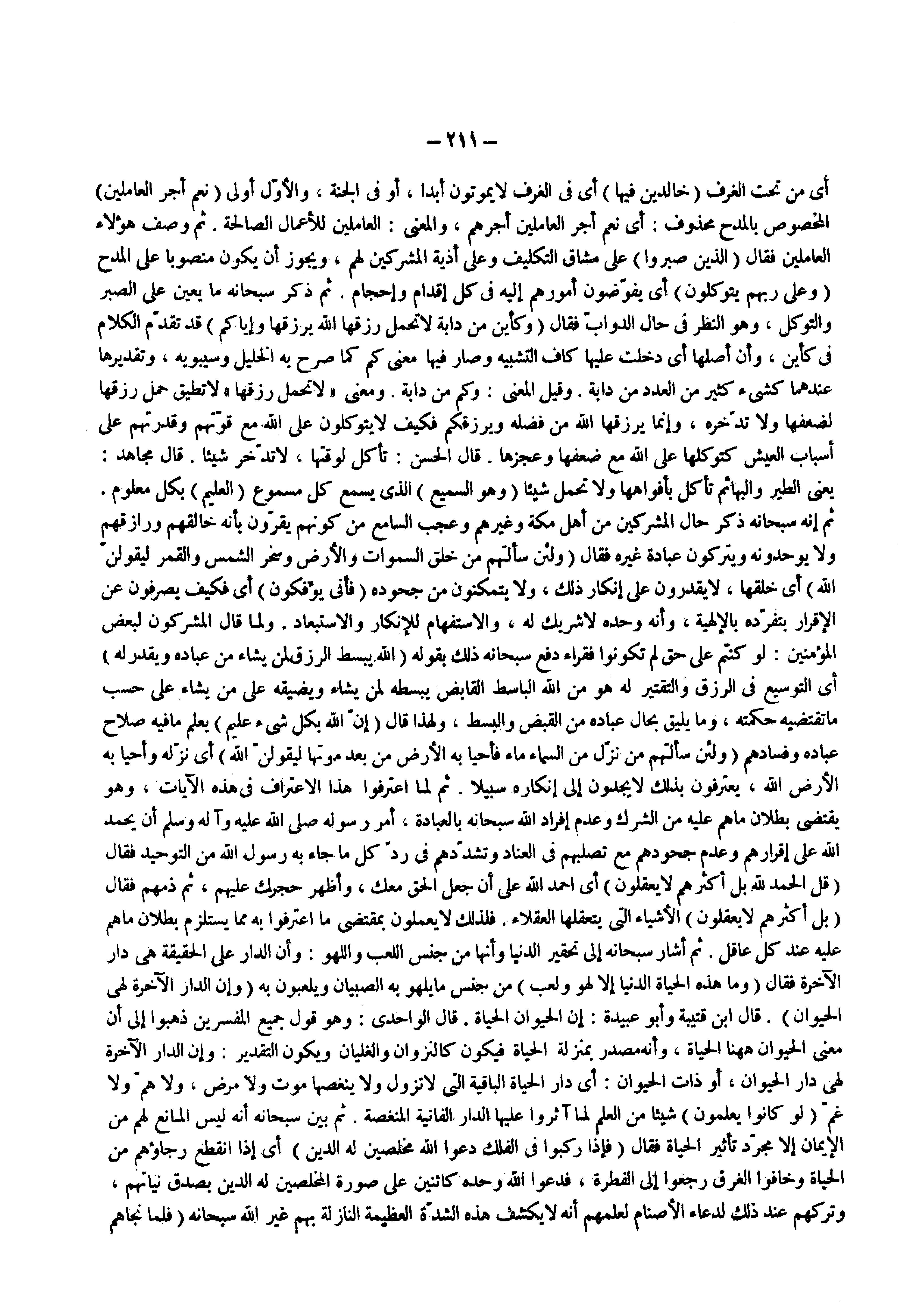 ) ولئن سألتهم من نزل من السماء ماء فأحيا به الأرض من بعد موتها ليقولن الله ( أي نزله وأحيا به الأرض الله يعترفون بذلك لا يجدون إلى إنكاره سبيلا ثم لما اعترفوا هذا الاعتراف في هذه الايات وهو يقتضي بطلان ما هم عليه من الشرك وعدم إفراد الله سبحانه بالعبادة أمر رسوله صلى الله عليه واله وسلم أن يحمد الله على إقرارهم وعدم جحودهم مع تصلبهم في العناد وتشددهم في رد كل ما جاء به رسول الله من التوحيد فقال ) قل الحمد لله بل أكثرهم لا يعقلون ( أي أحمد الله على أن جعل الحق معك وأظهر حجرك عليهم ثم ذمهم فقال ) بل أكثرهم لا يعقلون ( الأشياء التي يتعقلها العقلاء فلذلك لا يعملون بمقتضى ما اعترفوا به مما يستلزم بطلان ما هم عليه عند كل عاقل
