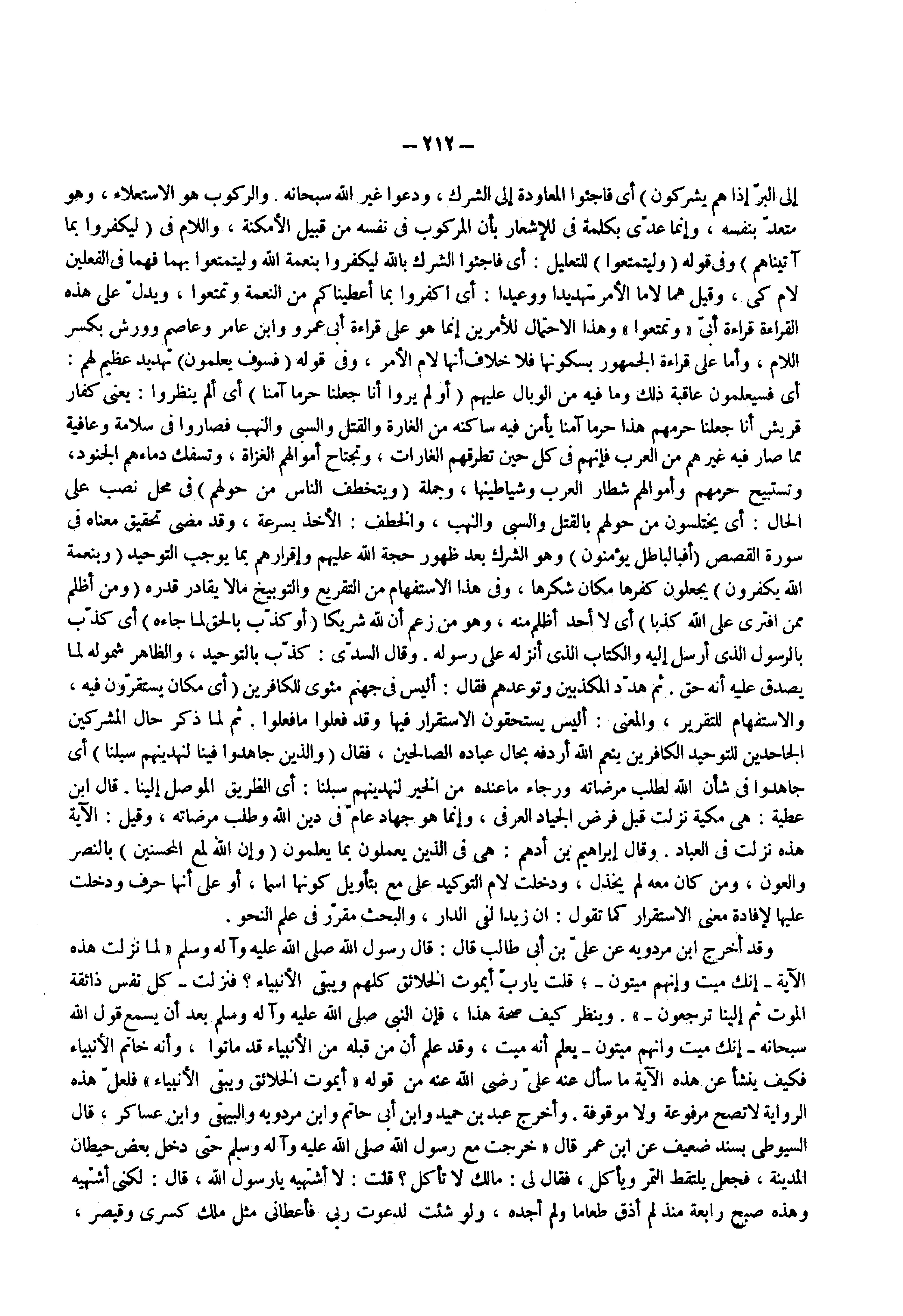 وقد أخرج ابن مردويه عن علي بن أبي طالب قال قال رسول الله صلى الله عليه واله وسلم لما نزلت هذه الاية ) إنك ميت وإنهم ميتون ( قلت يا رب أيموت الخلائق كلهم ويبقى الأنبياء فنزلت كل نفس ذائقة الموت ثم إلينا ترجعون وينظر كيف صحة هذا فإن النبي صلى الله عليه واله وسلم بعد أن يسمع قول الله سبحانه إنك ميت وانهم ميتون يعلم أنه ميت وقد علم أن من قبله من الأنبياء قد ماتوا وأنه خاتم الأنبياء فكيف ينشأ عن هذه الاية ما سأل عنه على رضى الله عنه من قوله أيموت الخلائق ويبقى الأنبياء فلعل هذه الرواية لا تصح مرفوعة ولا موقوفة وأخرج عبد بن حميد وابن أبي حاتم وابن مردويه والبيهقي وابن عساكر قال السيوطي بسند ضعيف عن ابن عمر قال خرجت مع رسول الله صلى الله عيه واله وسلم حتى دخل بعض حيطان المدينة فجعل يلتقط التمر ويأكل فقال لي مالك لا تأكل قلت لا أشتهيه يا رسول الله قال لكني أشتهيه وهذه صبح رابعة منذ لم أذق طعاما ولم أجده ولو شئت لدعوت ربي فأعطاني مثل ملك كسرى وقيصر