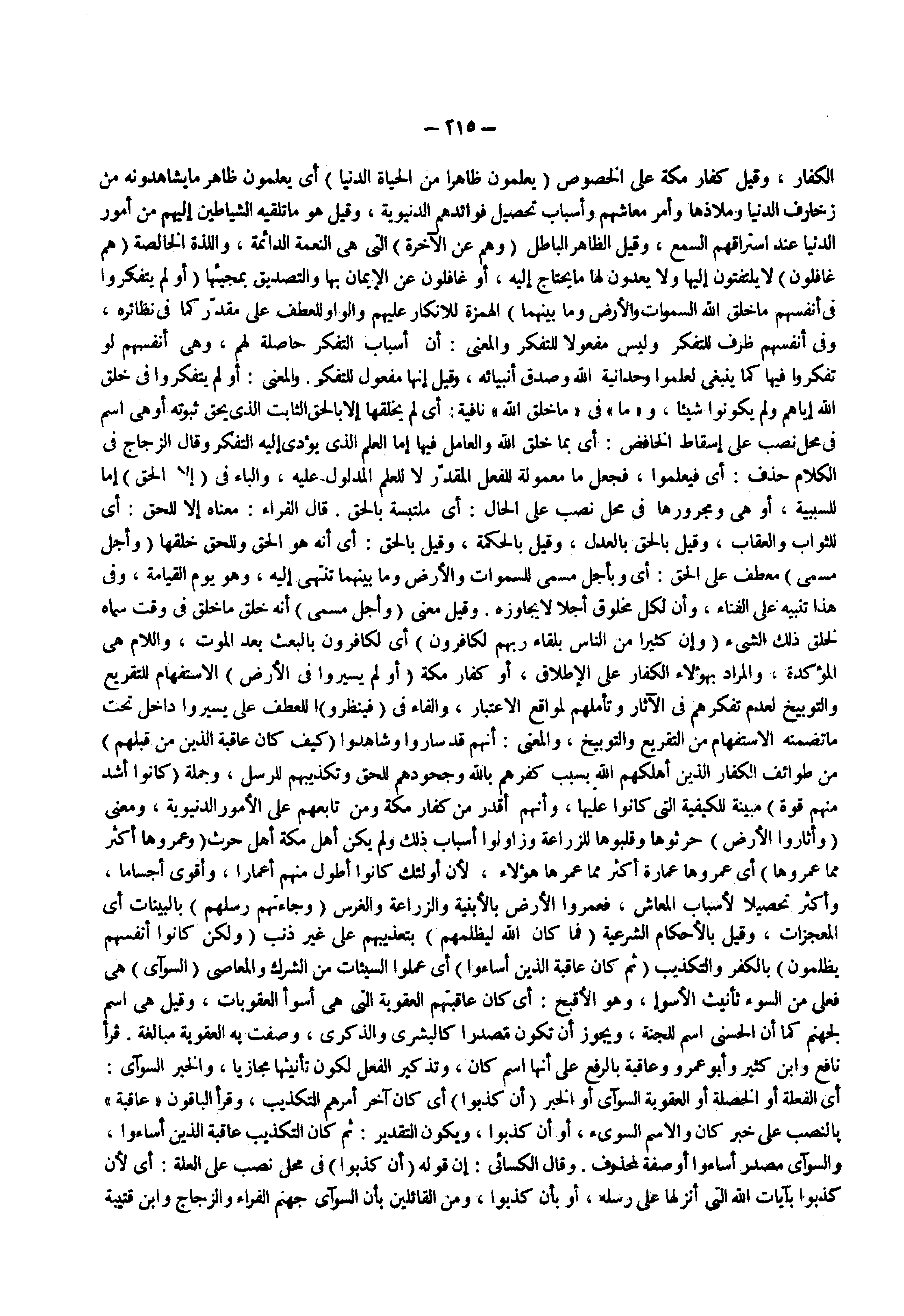 ) أو لم يتفكروا في أنفسهم ما خلق الله السماوات والأرض وما بينهما ( الهمزة للانكار عليهم والواو للعطف على مقدر كما في نظائره وفي أنفسهم ظرف للتفكر وليس مفعولا للتفكر والمعنى أن أسباب التفكر حاصلة لهم وهي أنفسهم لو تفكروا فيها كما ينبغي لعلموا وحدانية الله وصدق أنبيائه وقيل إنها مفعول للتفكر والمعنى أو لم يتفكروا في خلق الله إياهم ولم يكونوا شيئا وما في ما خلق الله نافية أي لم يخلقها إلا بالحق الثابت الذي يحق ثبوته أو هي اسم في محل نصب على إسقاط الخافض أي بما خلق الله والعامل فيها إما العلم الذي يؤدي إليه التفكر وقال الزجاج في الكلام حذف أي فيعلموا فجعل ما معمولة للفعل المقدر لا للعلم المدلول عليه والباء في ) إلا بالحق ( إما للسببية أو هي ومجرورها في محل نصب على الحال أي ملتبسة بالحق قال الفراء معناه إلا للحق أي للثواب والعقاب وقيل بالحق بالعدل وقيل بالحكمة وقيل بالحق أي أنه هو الحق وللحق خلقها ) وأجل مسمى ( معطف على الحق أي وبأجل مسمى للسموات والأرض وما بينهما تنتهي إليه وهو يوم القيامة وفي هذا تنبيه على الفناء وأن لكل مخلوق أجلا لا يجاوزه وقيل معنى ) وأجل مسمى ( أنه خلق ما خلق في وقت سماه لخلق ذلك الشيء ) وإن كثيرا من الناس بلقاء ربهم لكافرون ( أي لكافرون بالبعث بعد الموت واللام هي المؤكدة والمراد بهؤلاء الكفار على الإطلاق أو كفار مكة