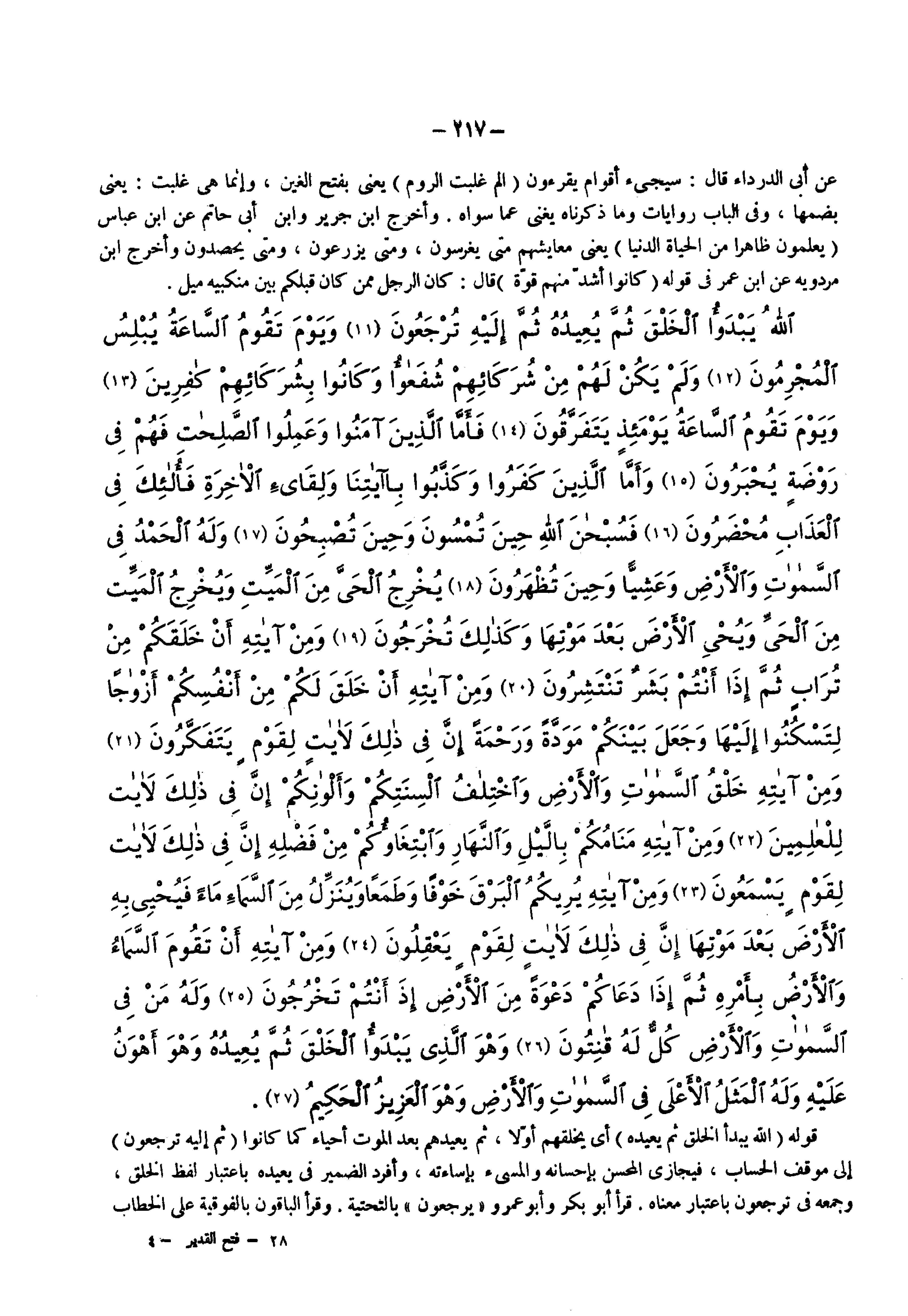 عن أبي الدرداء قال سيجىء أقوام يقرءون ) الم غلبت الروم ( يعني بفتح الغين وإنما هي غلبت يعني بضمها وفي الباب روايات وما ذكرناه يغنى عما سواه وأخرج ابن جرير وابن أبي حاتم عن ابن عباس ) يعلمون ظاهرا من الحياة الدنيا ( يعني معايشهم متى يغرسون ومتى يزرعون ومتى يحصدون وأخرج ابن مردويه عن ابن عمر في قوله ) كانوا أشد منهم قوة ( قال كان الرجل ممن كان قبلكم بين منكبيه ميل