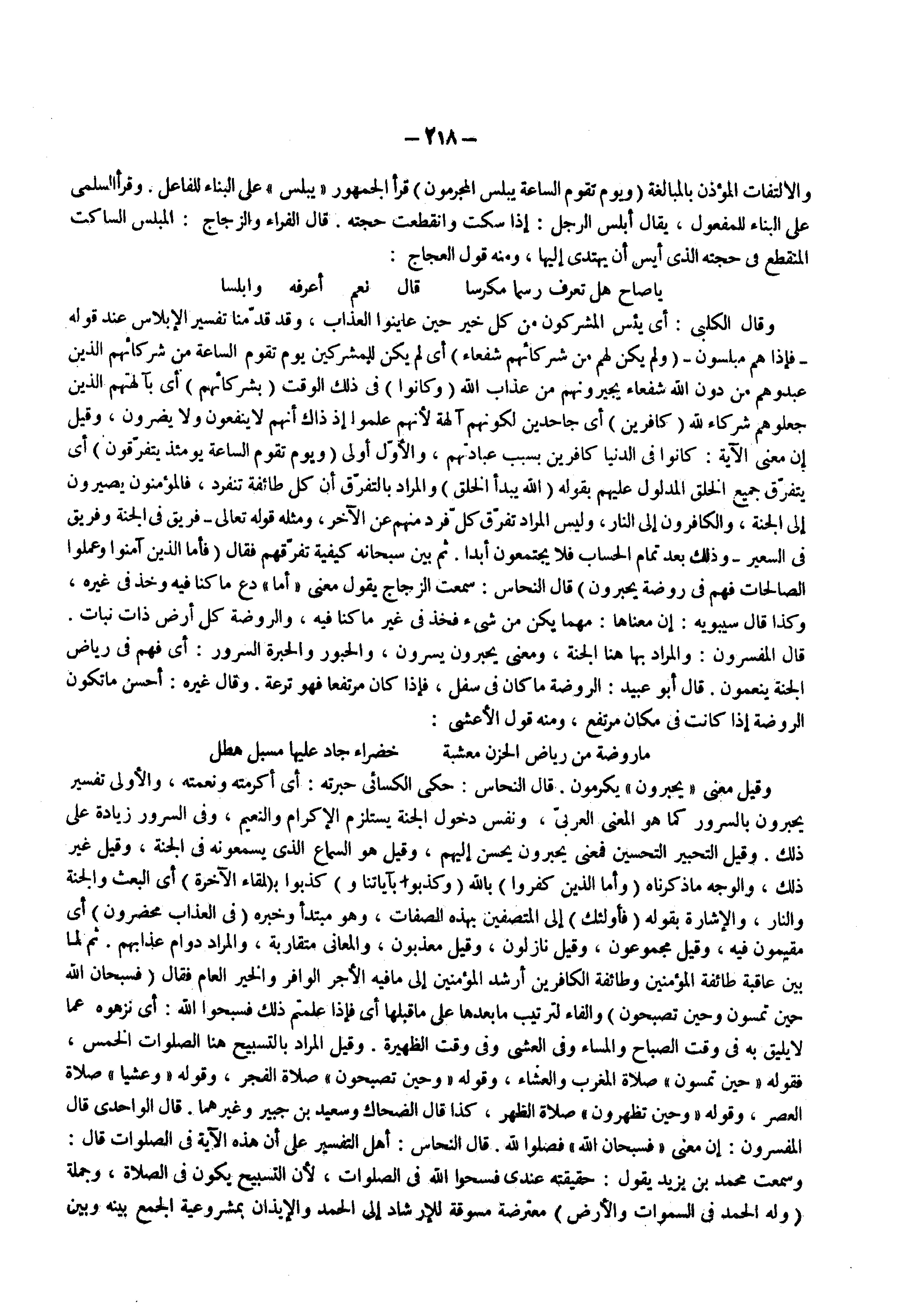 ثم لما بين عاقبة طائفة المؤمنين وطائفة الكافرين أرشد المؤمنين إلى ما فيه الأجر الوافر والخير العام فقال ) فسبحان الله حين تمسون وحين تصبحون ( والفاء لترتيب ما بعدها على ما قبلها أي فإذا علمتم ذلك فسبحوا الله أي نزهوه عما لا يليق به في وقت الصباح والمساء وفي العشى وفي وقت الظهيره وقيل المراد بالتسبيح هنا الصلوات الخمس فقوله حيت تمسون صلاة المغرب والعشاء وقوله وحين تصبحون صلاة الفجر وقوله وعشيا صلاة العصر وقوله وحين تظهرون صلاة الظهر كذا قال الضحاك وسعيد بن جبير وغيرهما قال الواحدي قال المفسرون إن معنى ) فسبحان الله ( فصلوا لله قال النحاس أهل التفسير على أن هذه الاية في الصلوات قال وسمعت محمد بن يزيد يقول حقيقته عندي فسبحوا الله في الصلوات لأن التسبيح يكون في الصلاة