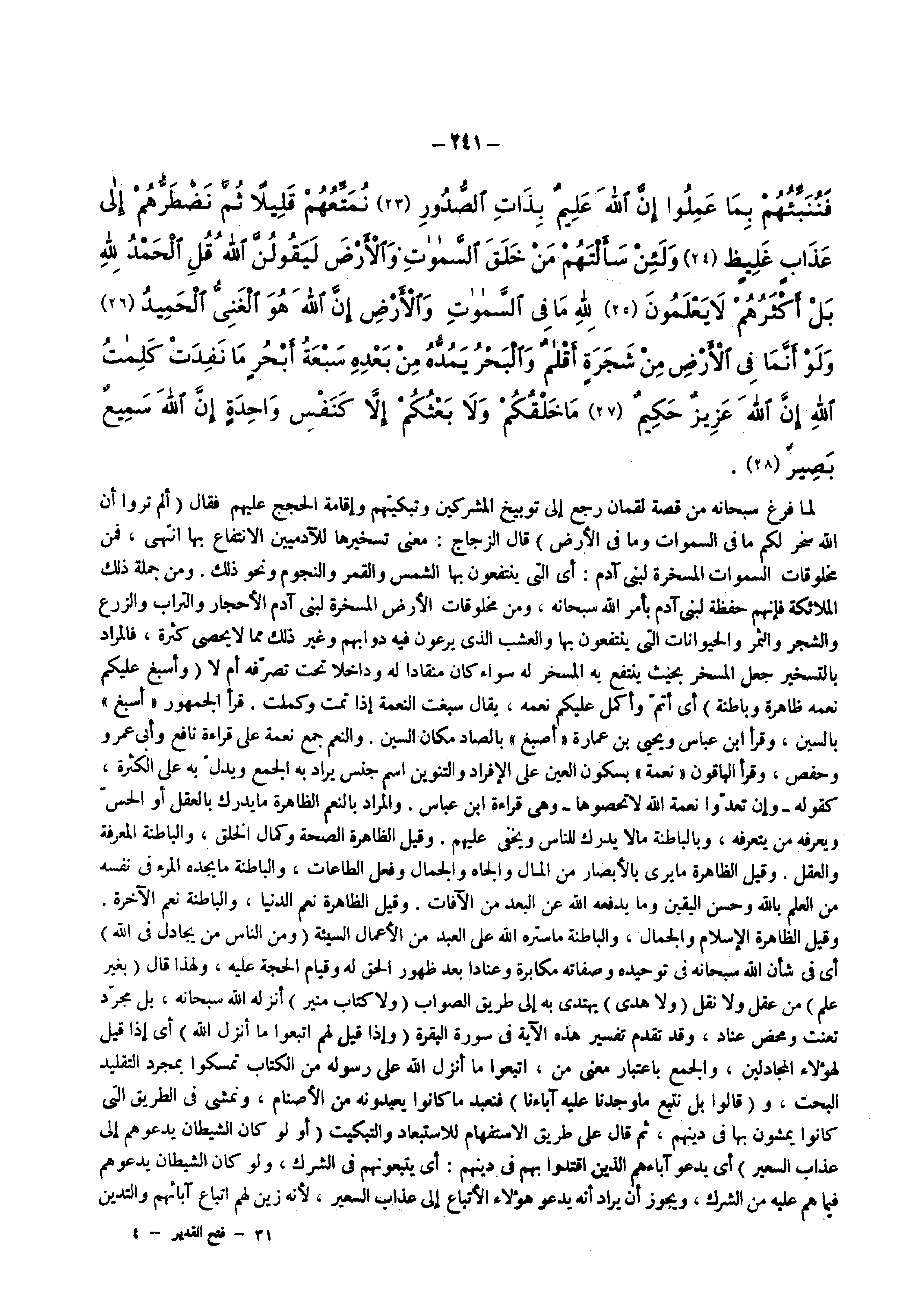 لما فرغ سبحانه من قصة لقمان رجع إلى توبيخ المشركين وتبكيتهم وإقامة الحجج عليهم فقال ) ألم تروا أن الله سخر لكم ما في السماوات وما في الأرض ( قال الزجاج معنى تسخيرها للادميين الانتفاع بها انتهى فمن مخلوقات السموات المسخرة لبني ادم أي التي ينتفعون بها الشمس والقمر والنجوم ونحو ذلك ومن جملة ذلك الملائكة فإنهم حفظة لبني ادم بأمر الله سبحانه ومن مخلوقات الأرض المسخرة لبني ادم الأحجار والتراب والزرع والشجر والثمر والحيوانات التي ينتفعون بها والشعب الذي يرعون فيه دوابهم وغير ذلك مما لا يحصى كثرة فالمراد بالتسخير جعل المسخر بحيث ينتفع به المسخر له سواء كان منقادا له وداخلا تحت تصرفه أم لا ) وأسبغ عليكم نعمه ظاهرة وباطنة ( أي أتم وأكمل عليكم نعمه يقال سبغت النعمة إذا تمت وكملت قرأ الجمهور ? أسبغ ? بالسين وقرأ ابن عباس ويحيى بن عمارة أصبغ بالصاد مكان السين والنعم جمع نعمة على قراءة نافع وأبي عمرو وحفص وقرأ الباقون نعمة بسكون العين على الإفراد والتنوين اسم جنس يراد به الجمع ويدل به على الكثرة كقوله ) وإن تعدوا نعمة الله لا تحصوها ( وهي قراءة ابن عباس والمراد بالنعم الظاهرة ما يدرك بالعقل أو الحس ويعرفه من يتعرفه وبالباطنة مالا يدرك للناس ويخفى عليهم وقيل الظاهرة الصحة وكمال الخلق والباطنة المعرفة والعقل وقيل الظاهرة ما يرى بالأبصار من المال والجاه والجمال وفعل الطاعات والباطنة ما يجده المرء في نفسه من العلم بالله وحسن اليقين وما يدفعه الله عن البعد من الافات وقيل الظاهرة نعم الدنيا والباطنة نعم الاخرة وقيل الظاهرة الإسلام والجمال والباطنة ما ستره الله على العبد من الأعمال السيئة ) ومن الناس من يجادل في الله ( أي في شأن الله سبحانه في توحيده وصفاته مكابرة وعنادا بعد ظهور الحق له وقيام الحجة عليه ولهذا قال ) بغير علم ( من عقل ولا نقل ) ولا هدى ( يهتدي به إلى طريق الصواب ) ولا كتاب منير ( أنزله الله سبحانه بل مجرد تعنت ومحض عناد وقد تقدم تفسير هذه الاية في سورة البقرة