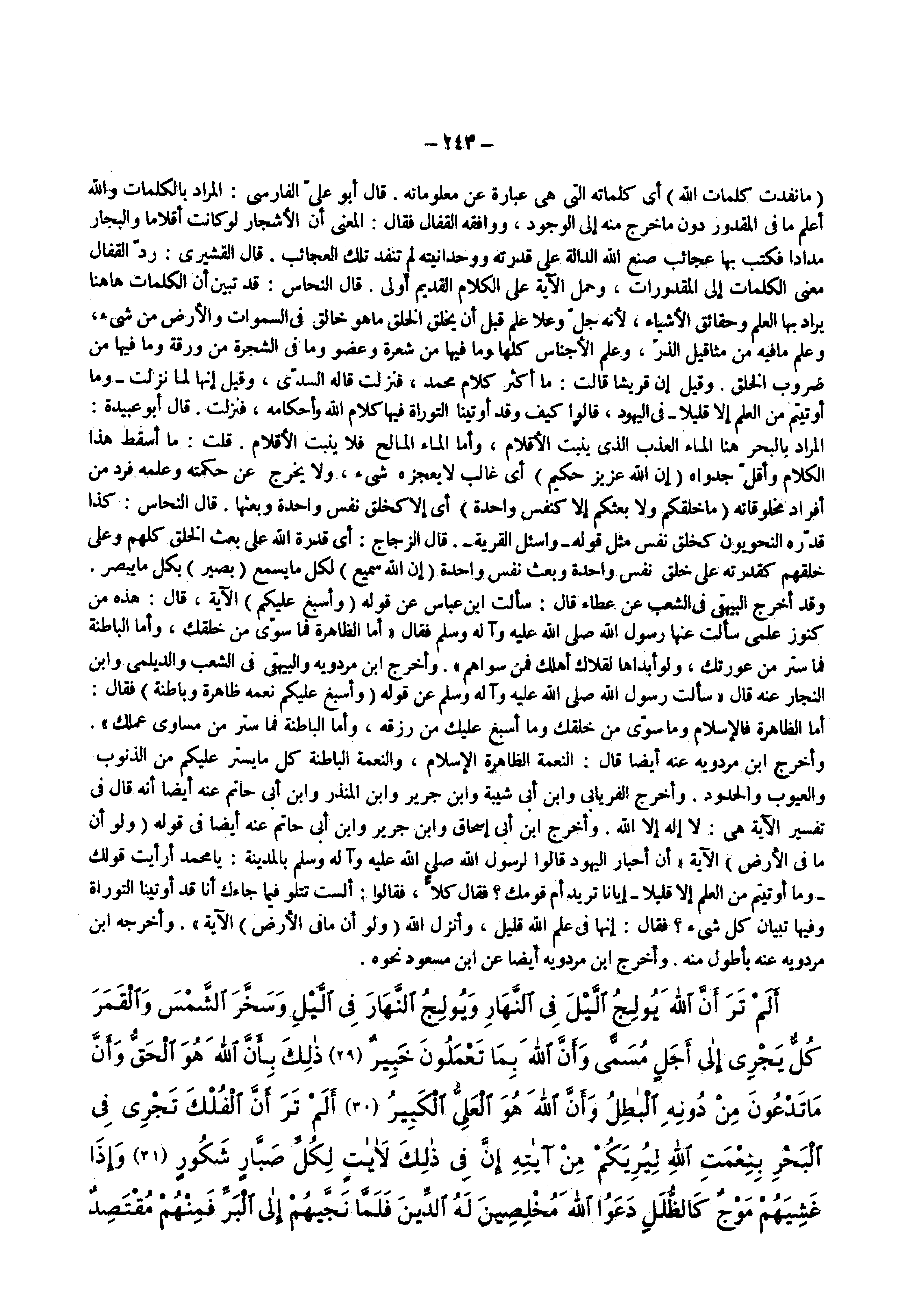 ) ما نفدت كلمات الله ( أى كلماته التى هى عبارة عن معلوماته قال أبو على الفارسى المراد بالكلمات والله أعلم مافى المقدور دون ماخرج منه إلى الوجود ووافقه القفال فقال المعنى أن الأشجار لو كانت أقلاما والبحار مداد فكتب بها عجائب صنع الله الدالة على قدرته ووحدانيته لم تنفذ تلك العجائب قال القشيرى رد القفال معنى الكلمات إلى المقدورات وحمل الآية على الكلام القديم أولى قال النحاس قد تبين أن الكمات هاهنا يراد بها العلم وحقائق الأشياء لأنه جل وعلا قبل أن يخلق الخلق ماهو خالق فى السموات والأرض من شىء وعلم مافيه من مثاقيل الذر وعلم الأجناس كلها وما فيها من شعرة وعضو وما فى الشجرة من ورقة وما فيها من ضروب الخلق وقيل إن قريشا قالت ما أكثر كلام محمد فنزلت قاله السدى وقيل إنها لما نزلت وما أوتيتم من العلم إلا قليلا فى اليهود قالوا كيف وقد أوتينا التوراة فيها كلام الله وأحكامه فنزلت قال أبو عبيدة المراد بالبحر هنا الماء العذب الذى ينبت الأقلام وأما الماء المالح فلا ينبت الأقلام قلت ما أسقط هذا الكلام وأقل جدواه ) أن الله عزيز حكيم ( أى غالب لايعجزه شىء ولايخرج عن حكمته وعلمه فرد من أفراد مخلوقاته
