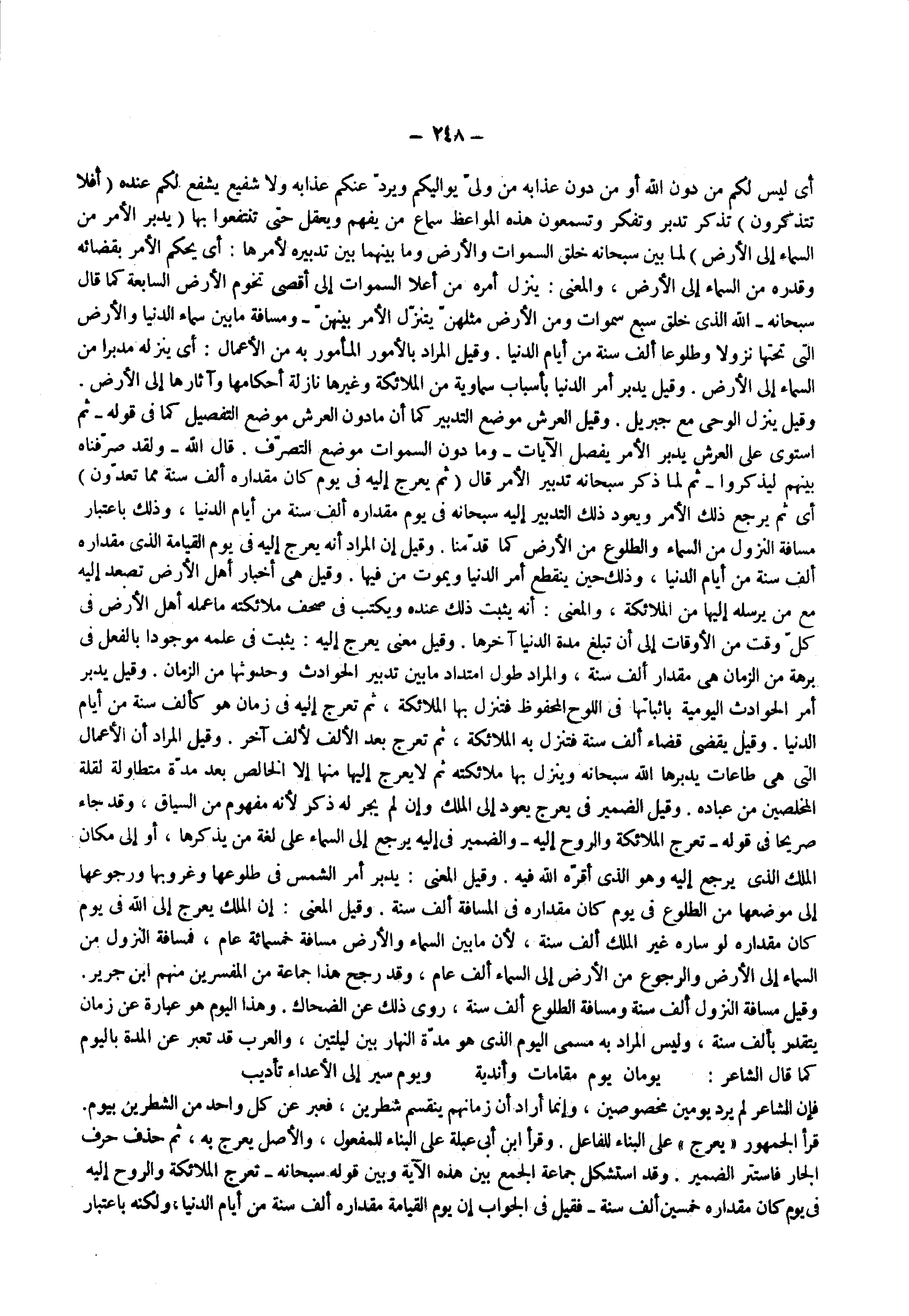 ) يدبر الأمر من السماء إلى الأرض ( لما بين سبحانه خلق السموات والأرض وما بينهما بين تدبيره لأمرها أى يحكم الأمر بقضائه وقدره من السماء إلى الأرض والمعنى ينزل أمره من أعلا السموات إلى أقصى تخوم الأرض السابعة كما قال سبحانه ) الله الذي خلق سبع سماوات ومن الأرض مثلهن يتنزل الأمر بينهن ( ومسافة ما بين السماء الدنيا والأرض التى تحتها نزولا وطلوعا ألف سبع سموات ومن الأرض مثلهن يتنزل الأمر بينهن ومسافة مابين سماء الدنيا والأرض التى تحتها نزولا وطلوعا ألف سنة من أيام الدنيا وقيل المراد بالأمور به من الأعمال أى ينزله مدبرا من السماء إلي الأرض وقيل يدبر أمر الدنيا بأسباب سماوية من الملائكة وغيرها نازلة أحكامها وآثارها إلى الأرض وقيل ينزل الوحى مع جبريل وقيل العرش موضع التدبير كما أن مادون العرش موضع التفصيل كما فى قوله ) ثم استوى على العرش يدبر الأمر ( يفصل الآيات وما دون السموات موضع التصرف قال الله ولقد صرفناه بينهم ليذكروا ثم لما ذكر سبحانه تدبير الأمر قال ) ثم يعرج إليه في يوم كان مقداره ألف سنة مما تعدون ( أى ثم يرجع ذلك الأمر ويعود ذلك التدبير إليه سبحانه فى يوم مقداره ألف سنة من أيام الدنيا وذلك باعتبار مسافة النزول من السماء والطلوع من الأرض كما قدمنا وقيل إن المراد أنه يعرج إليه فى يوم القيامة الذى مقداره ألف سنة من أيام الدنيا وذلك حين ينقطع أمر الدنيا ويموت من فيها وقيل هى أخبار أهل الأرض تصعد إليه مع من يرسله إليها من الملائكة والمعنى أنه يثبت ذلك عنده ويكتب في صحف ملائكته ما عمله أهل الأرض فى كل وقت من الأوقات إلى أن تبلغ مدة الدنيا آخرها وقيل معنى يعرج إليه يثبت فى علمه موجودا بالفعل فى برهة من الزمان هى مقدار ألف سنة والمراد طول امتداد مابين تدبير الحوادث وحدوثها من الزمان وقيل يدبر أمر الحوادث اليومية باثباتها فى اللوح المحفوظ فتنزل بها الملائكة ثم يعرج إليه فى زمان هو كألف سنة من أيام الدنيا وقيل يقضى قضاء ألف سنة فتنزل به الملائكة ثم تعرج بعد الألف لألف آخر وقيل المراد أن الأعمال التى هى طاعات يدبرها الله سبحانه وينزل بها ملائكته ثم لايعرج إليها منها إلا الخالص بعد مدة متطاولة لقلة المخلصين من عباده وقيل الضمير فى يعرج يعود إلى الملك وإن لم يجر له ذكر لأنه مفهوم من السياق وقد جاء صريحا فى قوله ) تعرج الملائكة والروح إليه ( والضمير فى إليه يرجع إلى السماء على لغة من يذكرها أو إلى مكان الملك الذى يرجع إليه وهو الذى أقره الله فيه وقيل المعنى يدبر أمر الشمس فى طلوعها وغروبها ورجوعها إلى موضعها من الطلوع فى يوم كان مقداره فى المسافة ألف سنة وقيل المعنى أن الملك يعرج إلى الله فى يوم كان مقداره لو ساره غير الملك ألف سنة لأن مابين السماء والأرض مسافة خمسائة عام فمسافة النزول من السماء إلى الأرض والرجوع من الأرض إلى السماء ألف عام وقد رجح هذا جماعة من المفسرين منهم ابن جرير وقيل مسافة النزول ألف سنة ومسافة الطلوع ألف سنة روى ذلك عن الضحاك وهذا اليوم هو عبارة عن زمان يتقدر بألف سنة وليس المراد به مسمى اليوم الذى هو مدة النهار بين ليلتين والعرب قد تعبر عن المدة باليوم كما قال الشاعر يومان يوم مقامات وأندية