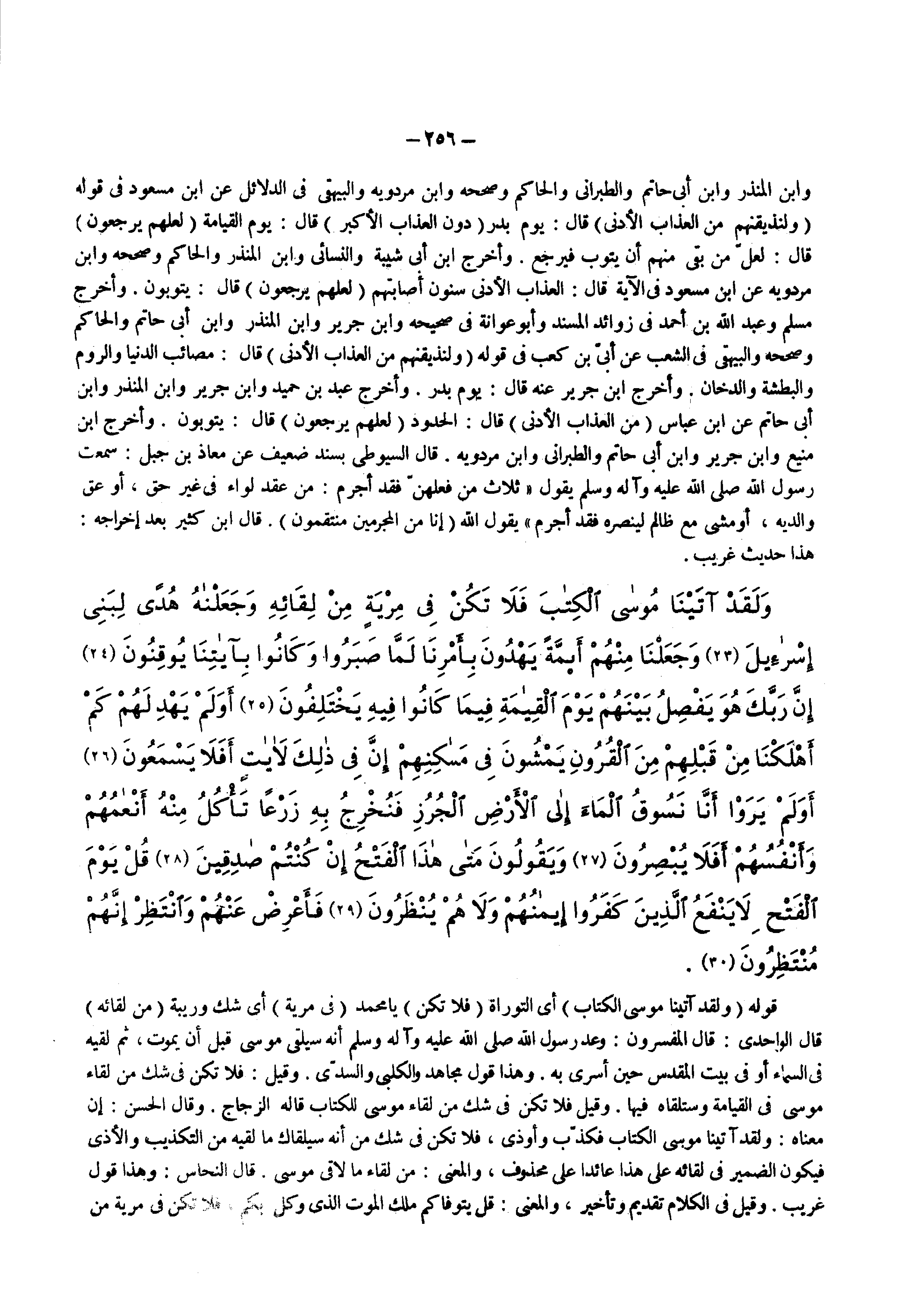 وابن المنذر وابن أبى حاتم والطبرانى والحاكم وصححه وابن مردويه والبيهقى فى الدلائل عن ابن مسعود فى قوله ) ولنذيقنهم من العذاب الأدنى ( قال يوم بدر ) دون العذاب الأكبر ( قال يوم القيامة ) لعلهم يرجعون ( قال لعل من بقى منهم أن يتوب فيرجع وأخرج ابن أبى شيبة والنسائى وابن المنذر والحاكم وصححه وابن مردويه عن ابن مسعود فى الآية قال العذاب الأدنى سنون أصابتهم ) لعلهم يرجعون ( قال يتوبون وأخرج مسلم وعبد الله بن أحمد فى زوائد المسند وأبو عوانة فى صحيحه وابن جرير وابن المنذر وابن أبى حاتم والحاكم وصححه والبيهقى فى الشعب عن أبي بن كعب فى قوله ) ولنذيقنهم من العذاب الأدنى ( قال مصائب الدنيا والروم والبطشة والدخان وأخرج ابن جرير عنه قال يوم بدر وأخرج عبد بن حميد وابن جرير وابن المنذر وابن أبى حاتم عن ابن عباس ) من العذاب الأدنى ( قال الحدود ) لعلهم يرجعون ( قال يتوبون وأخرج ابن منيع وابن جرير وابن أبى حاتم والطبرانى وابن مردويه قال السيوطى بسند ضعيف عن معاذ بن جبل سمعت رسول الله ( صلى الله عليه وسلم ) يقول ثلاث من فعلهن فقد أجرم من عقد لواء فى غير حق أو عق والديه أو مشى مع ظالم لينصره فقد أجرم يقول الله ) إنا من المجرمين منتقمون ( قال ابن كثير بعد إخراجه هذا حديث غريب