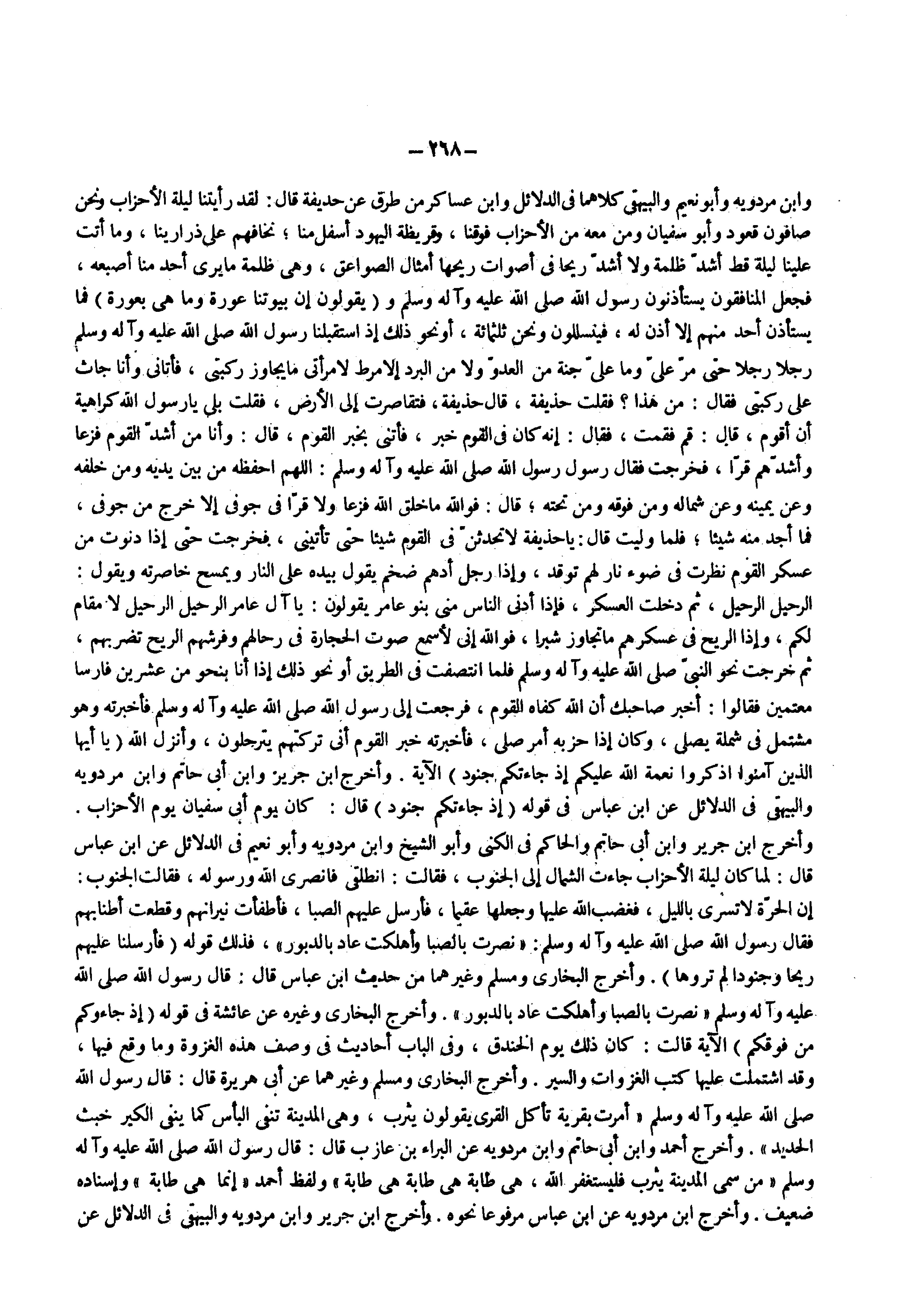 وابن مردويه وأبو نعيم والبيهقى كلاهما فى الدلائل وابن عساكر من طرق عن حذيفة قال لقد رأيتنا ليلة الأحزاب ونحن صافون قعود وأبو سفيان ومن معه من الأحزاب فوقنا وقريظة اليهود أسفل منا نخافهم على ذرارينا وما أتت علينا ليلة قط أشد ظلمة ولا أشد ريحا فى أصوات ريحها أمثال الصواعق وهى ظلمة ما يرى أحد منا أصبعه فجعل المنافقون يستأذنون رسول الله ( صلى الله عليه وسلم ) و ) يقولون إن بيوتنا عورة وما هي بعورة ( فما يستأذن أحد منهم إلا أذن له فينسللون ونحن ثلثمائة أو نحو ذلك إذ استقبلنا رسول الله ( صلى الله عليه وسلم ) رجلا رجلا حتى مر على وما على جنة من العدو ولا من البرد إلا مرط لامرأتى ما يجاوز ركبتى فأتانى وأنا جاث على ركبتى فقال من هذا فقلت حذيفة قال حذيفة فتقاصرت إلى الأرض فقلت بلى يا رسول الله كراهية أن أقوم قال ثم فقمت فقال إنه كان فى القوم خبر فأتنى بخبر القوم قال وأنا من أشد القوم فزعا وأشدهم قرا فخرجت فقال رسول الله ( صلى الله عليه وسلم ) اللهم احفظه من بين يديه ومن خلفه وعن يمينه وعن شماله ومن فوقه ومن تحته قال فوالله ما خلق الله فزعا ولا قرا فى جوفى إلا خرج من جوفى فما أجد منه شيئا فلما وليت قال يا حذيفة لا تحدثن فى القوم شيئا حتى تأتينى فخرجت حتى إذا دنوت من عسكر القوم نظرت فى ضوء نار لهم توقد وإذا رجل أدهم ضخم يقول بيده على النار ويمسح خاصرته ويقول الرحيل الرحيل ثم دخلت العسكر فإذا أدنى الناس منى بنو عامر يقولون يا آل عامر الرحيل الرحيل لا مقام لكم وإذا الريح فى عسكرهم ما تجاوز شبرا فو الله إنى لأسمع صوت الحجارة فى رحالهم وفرشهم الريح تضربهم ثم خرجت نحو النبى ( صلى الله عليه وسلم ) فلما انتصفت في الطريق أو نحو ذلك إذا أنا بنحو من عشرين فارسا معتمين فقالوا أخبر صاحبك أن الله كفاه القوم فرجعت إلى رسول الله ( صلى الله عليه وسلم ) فأخبرته وهو مشتمل فى شملة يصلى وكان إذا حزبه أمر صلى فأخبرته خبر القوم أنى تركتهم يترحلون وأنزل الله ) يا أيها الذين آمنوا اذكروا نعمة الله عليكم إذ جاءتكم جنود ( الآية وأخرج ابن جرير وابن أبى حاتم وابن مردويه والبيهقى فى الدلائل عن ابن عباس فى قوله ) إذ جاءتكم جنود ( قال كان يوم أبي سفيان يوم الأحزاب وأخرج ابن جرير وابن أبي حاتم والحاكم فى الكنى وأبو الشيخ وابن مردويه وأبو نعيم فى الدلائل عن ابن عباس قال لما كان ليلة الأحزاب جاءت الشمال إلى الجنوب فقالت انطلقي فانصرى الله ورسوله فقالت الجنوب إن الحرة لاتسرى بالليل فغضب الله عليها وجعلها عقيما فأرسل عليهم الصبا فأطفأت نيرانهم وقطعت أطنابهم فقال رسول الله ( صلى الله عليه وسلم ) نصرت بالصبا وأهلكت عاد بالدبور فذلك قوله ) فأرسلنا عليهم ريحا وجنودا لم تروها ( وأخرج البخارى ومسلم وغيرهما من حديث ابن عباس قال قال رسول الله ( صلى الله عليه وسلم ) نصرت بالصبا وأهلكت عاد بالدبور وأخرج البخارى وغيره عن عائشة فى قوله ) إذ جاؤوكم من فوقكم ( الآية قالت كان ذلك يوم الخندق وفى الباب أحاديث فى وصف هذه الغزوة وما وقع فيها وقد اشتملت عليها كتب الغزوات والسير وأخرج البخارى ومسلم وغيرهما عن أبى هريرة قال قال رسول الله ( صلى الله عليه وسلم ) أمرت بقرية تأكل القرى يقولون يثرب وهى المدينة تنفى البأس كما ينفى الكير خبث الحديد وأخرج أحمد وابن أبى حاتم وابن مردويه عن البراء بن عازب قال قال رسول الله ( صلى الله عليه وسلم ) من سمى المدينة يثرب فليستغفر الله هي طابة هى طابة هى طابة ولفظ أحمد إنما هى طابة وإسناده ضعيف وأخرج ابن مردويه عن ابن عباس مرفوعا نحوه وأخرج ابن جرير وابن مردويه والبيهقى فى الدلائل عن