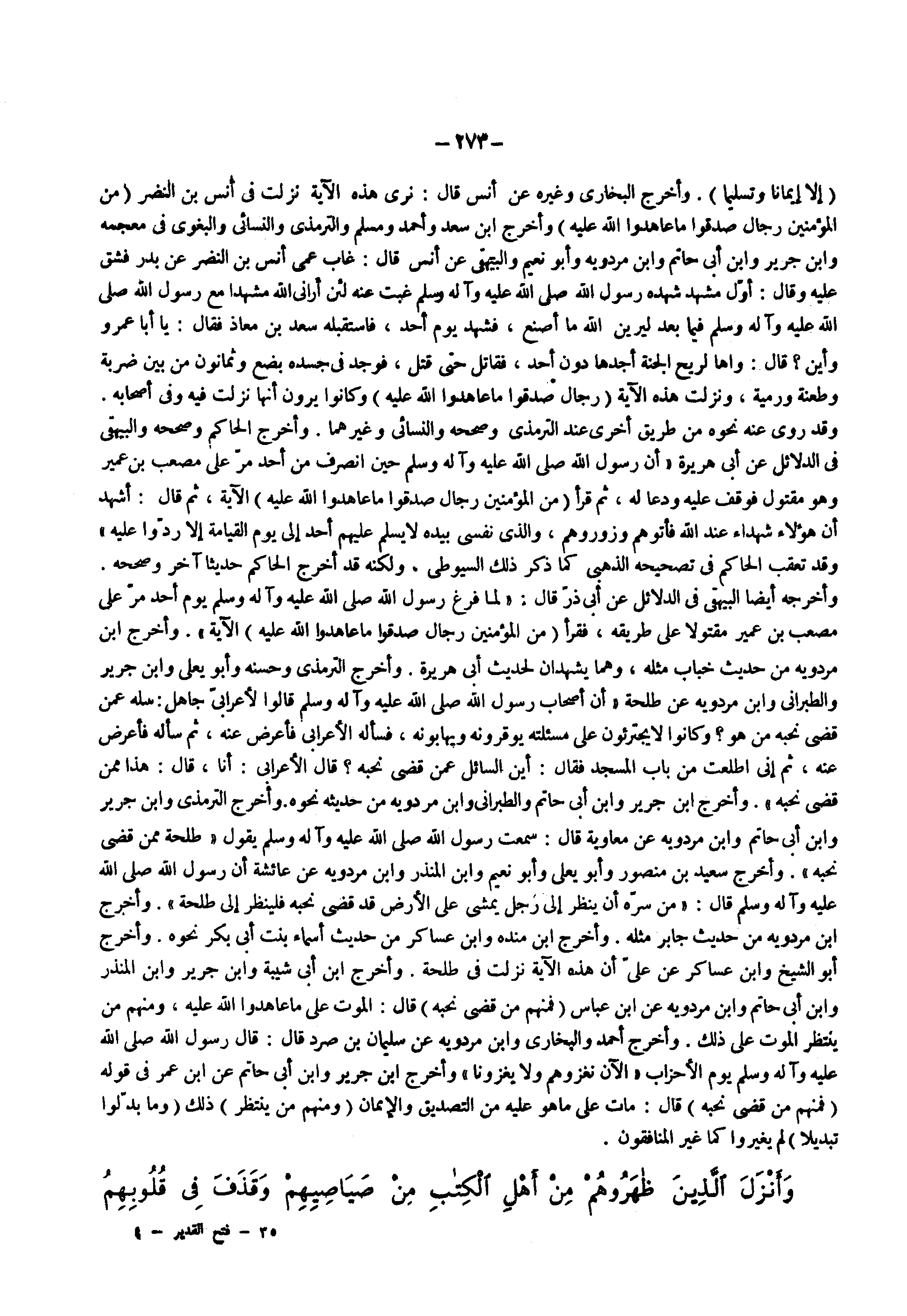 ) إلا إيمانا وتسليما ( وأخرج البخارى وغيره عن أنس قال نرى هذه الآية نزلت فى أنس بن النضر ) من المؤمنين رجال صدقوا ما عاهدوا الله عليه ( وأخرج ابن سعد وأحمد ومسلم والترمذى والنسائى والبغوى فى معجمه وابن جرير وابن أبى حاتم وابن مردويه وأبو نعيم والبيهقى عن أنس قال غاب عمى أنس بن النضر عن بدر فشق عليه وقال أول مشهد شهده رسول الله ( صلى الله عليه وسلم ) غبت عنه لئن أرانى الله مشهدا مع رسول الله ( صلى الله عليه وسلم ) فيما بعد ليرين الله ما أصنع فشهد يوم أحد فاستقبله سعد بن معاذ فقال يا أبا عمرو وأين قال واها لريح الجنة أجدها دون أحد فقاتل حتى قتل فوجد فى جسده بضع وثمانون من بين ضربة وطعنة ورمية ونزلت هذه الآية ) رجال صدقوا ما عاهدوا الله عليه ( وكانوا يرون أنها نزلت فيه وفى أصحابه وقد روى عنه نحوه من طريق أخرى عند الترمذى وصححه والنسائى وغيرهما وأخرج الحاكم وصححه والبيهقى فى الدلائل عن أبي هريرة أن رسول الله ( صلى الله عليه وسلم ) حين انصرف من أحد مر على مصعب بن عمير وهو مقتول فوقف عليه ودعا له ثم قرأ ) من المؤمنين رجال صدقوا ما عاهدوا الله عليه ( الآية ثم قال أشهد أن هؤلاء شهداء عند الله فأتوهم وزوروهم والذى نفسى بيده لا يسلم عليهم أحد إلى يوم القيامة إلا ردوا عليه وقد تعقب الحاكم في تصحيحه الذهبى كما ذكر ذلك السيوطى ولكنه قد أخرج الحاكم حديثا آخر وصححه وأخرجه أيضا البيهقى فى الدلائل عن أبي ذر قال لما فرغ رسول الله ( صلى الله عليه وسلم ) يوم أحد مر على مصعب بن عمير مقتولا على طريقة فقرأ ) من المؤمنين رجال صدقوا ما عاهدوا الله عليه ( الآية وأخرج ابن مردويه من حديث خباب مثله وهما يشهدان لحديث أبى هريرة وزخرج الترمذى وحسنه وأبو يعلى وابن جرير والطبرانى وابن مردويه عن طلحة أن أصحاب رسول الله ( صلى الله عليه وسلم ) قالوا لأعرابى جاهل سله عمن قضى نحبه من هو وكانوا لا يجترئون على مسئلته يوقرونه ويهابونه فسأله الأعرابى فأعرض عنه ثم سأله فأعرض عنه ثم إنى اطلعت من باب المسجد فقال أين السائل عمن قضى نحبه قال الأعرابي أنا قال هذا ممن قضى نحبه وأخرج ابن جرير وابن أبى حاتم والطبرانى وابن مردويه من حديثه نحوه وأخرج الترمذى وابن جرير وابن أبى حاتم وابن مردويه عن معاوية قال سمعت رسول الله ( صلى الله عليه وسلم ) يقول طلحة ممن قضى نحبه وأخرج سعيد بن منصور وأبو يعلى وأبو نعيم وابن المنذر وابن مردويه عن عائشة أن رسول الله ( صلى الله عليه وسلم ) قال من سره أن ينظر إلى رجل يمشى على الأرض قد قضى نحبه فلينظر إلى طلحة وأخرج ابن مردويه من حديث جابر مثله وأخرج ابن منده وابن عساكر من حديث أسماء بنت أبى بكر نحوه وأخرج أبو الشيخ وابن عساكر عن على أن هذه الآية نزلت فى طلحة وأخرج ابن أبى شيبة وابن جرير وابن المنذر وابن أبى حاتم وابن مردويه عن ابن عباس ) فمنهم من قضى نحبه ( قال الموت على ما عاهدوا الله عليه ومنهم من ينتظر الموت على ذلك وأخرج أحمد والبخارى وابن مردويه عن سليمان بن صرد قال قال رسول الله ( صلى الله عليه وسلم ) يوم الأحزاب الآن نغزوهم ولا يغزونا وأخرج ابن جرير وابن أبى حاتم عن ابن عمر فى قوله ) فمنهم من قضى نحبه ( قال مات على ما هو عليه من التصديق والإيمان ) ومنهم من ينتظر ( ذلك ) وما بدلوا تبديلا ( لم يغيروا كما غير المنافقون