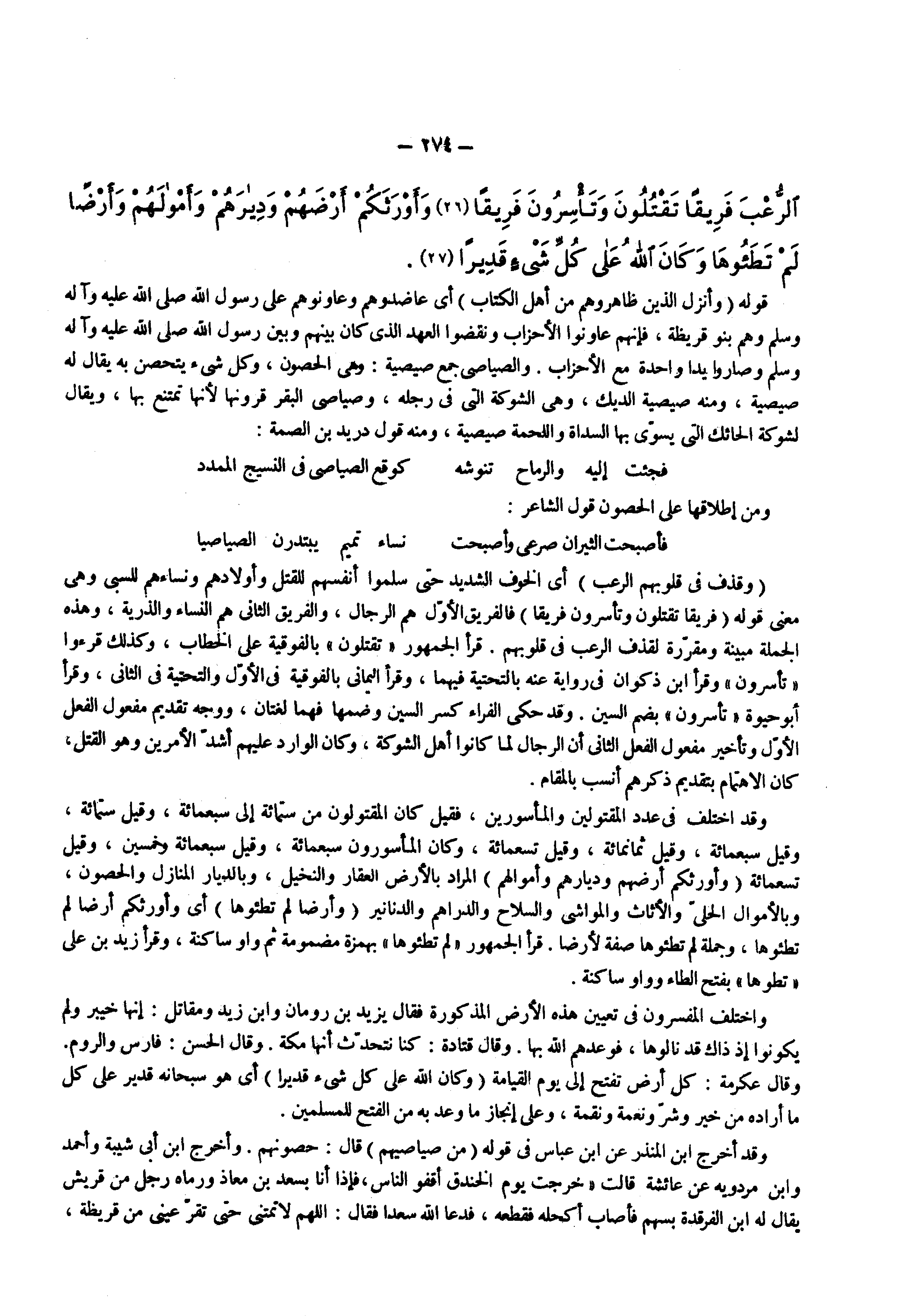 قوله ) وأنزل الذين ظاهروهم من أهل الكتاب ( أى عاضدوهم وعاونوهم على رسول الله ( صلى الله عليه وسلم ) وهم بنو قريظة فإنهم عاونوا الأحزاب ونقضوا العهد الذى كان بينهم وبين رسول الله ( صلى الله عليه وسلم ) وصاروا يدا واحدة مع الأحزاب والصياصى جمع صيصية وهى الحصون وكل شىء يتحصن به يقال له صيصية ومنه صيصية الديك وهى الشوكة التى فى رجله وصياصى البقر قرونها لأنها تمتنع بها ويقال لشوكة الحائك التى يسوى بها السداة واللحمة صيصية ومنه قول دريد بن الصمة فجئت إليه والرماح تنوشه