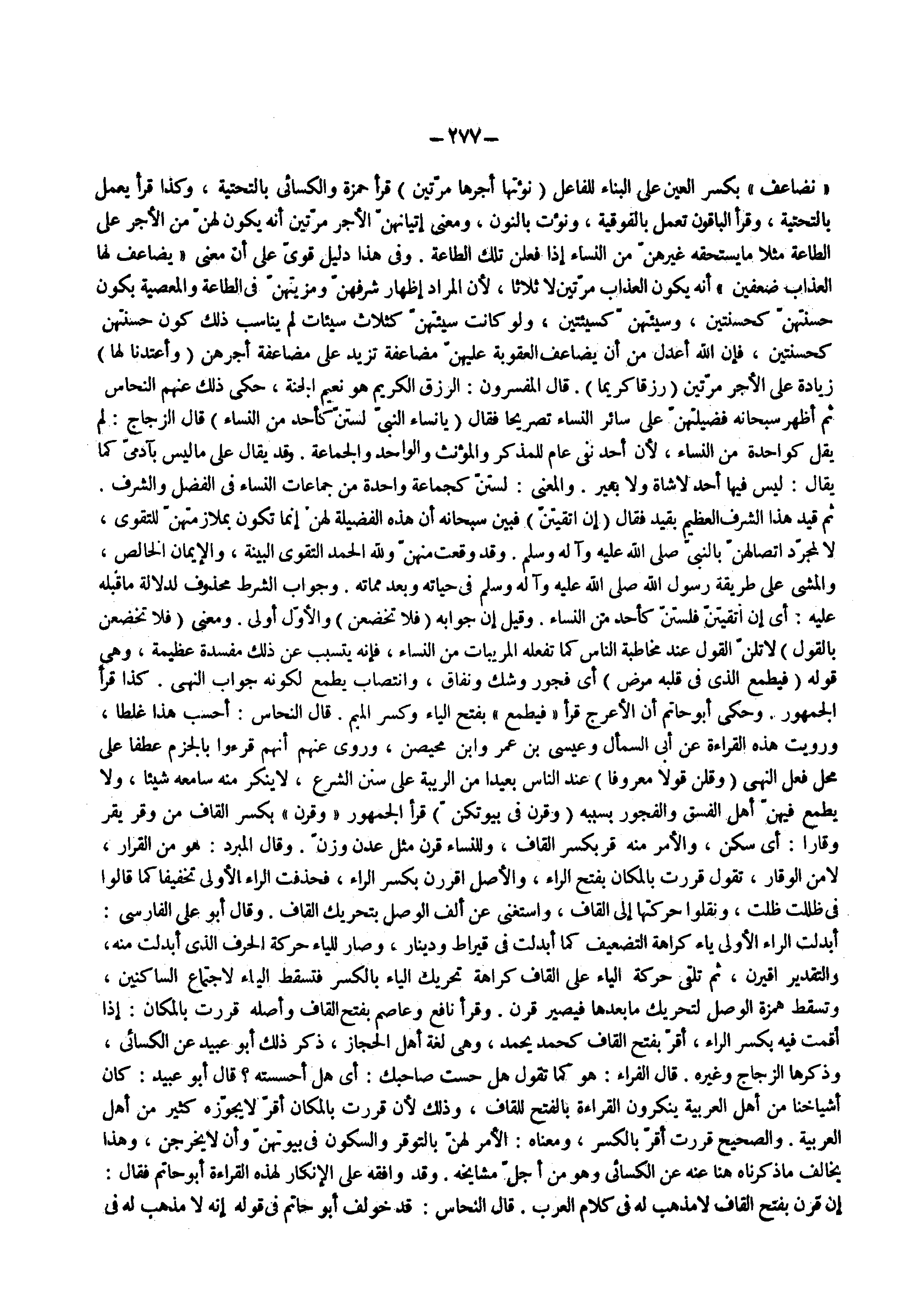 ) وقرن في بيوتكن ( قرأ الجمهور وقرن بكسر القاف من وقر يقر وقارا أى سكن والأمر منه قر بكسر القاف وللنساء قرن مثل عدن وزن وقال المبرد هو من القرار لا من الوقار تقول قررت بالمكان بفتح الراء والأصل اقررن بكسر الراء فحذفت الراء الأولى تخفيفا كما قالوا فى ظللت ظلت ونقلوا حركتها إلى القاف واستغنى عن ألف الوصل بتحريك القاف وقال أبو على الفارسي أبدلت الراء الأولى ياء كراهة التضعيف كما أبدلت فى قيراط ودينار وصار للياء حركة الحرف الذى أبدلت منه والتقدير اقيرن ثم تلقى حركة الياء على القاف كراهة تحريك الياء بالكسر فتسقط الياء لاجتماع الساكنين وتسقط همزة الوصل لتحريك مابعدها فيصير قرن وقرأ نافع وعاصم بفتح القاف وأصله قررت بالمكان إذا أقمت فيه بكسر الراء أقر بفتح القاف كحمد يحمد وهى لغة أهل الحجاز ذكر ذلك أبو عبيد عن الكسائى وذكرها الزجاج وغيره قال الفراء هو كما تقول هل حست صاحبك أى هل أحسسته قال أبو عبيد كان أشياخنا من أهل العربية ينكرون القراءة بالفتح للقاف وذلك لأن قررت بالمكان أقر لايجوزه كثير من أهل العربية والصحيح قررت أقر بالكسر ومعناه الأمر لهن بالتوقر والسكون فى بيوتهن وأن لا يخرجن وهذا يخالف ما ذكرناه هنا عنه عن الكسائى وهو من أجل مشايخه وقد وافقه على الإنكار لهذه القراءة أبو حاتم فقال إن قرن بفتح القاف لا مذهب له من فى كلام العرب قال النحاس قد خولف أبو حاتم فى قوله إنه لا مذهب له فى