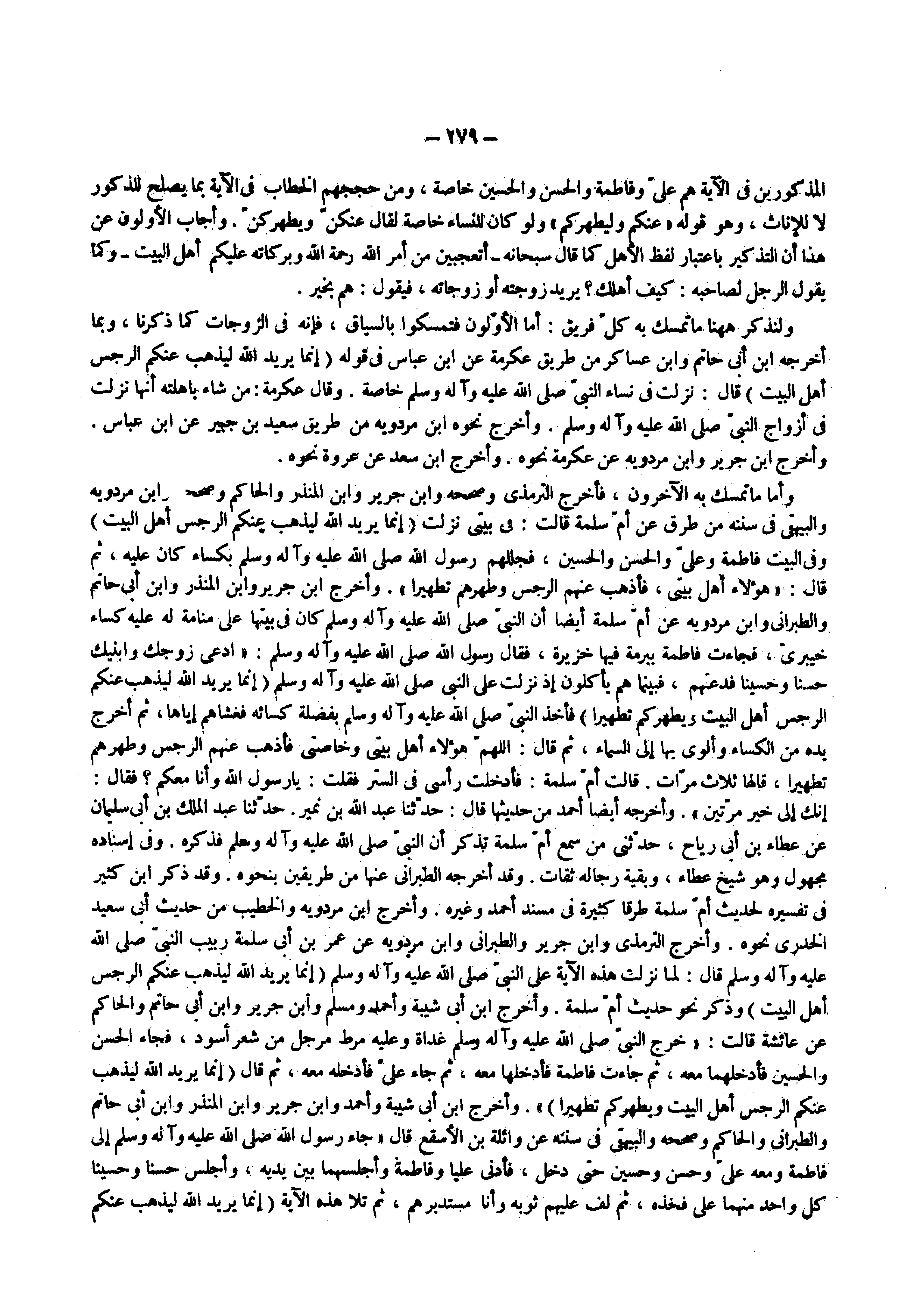 المذكورين فى الآية هم على وفاطمة والحسن والحسين خاصة ومن حججهم الخطاب فى الآية بما يصلح للذكور لا للإناث وهو قوله ) عنكم الرجس أهل البيت ويطهركم ( ولو كان للنساء خاصة لقال عنكن ويطهركن وأجاب الأولون عن هذا أن التذكير باعتبار لفظ الأهل كما قال سبحانه أتعجبين من أمر الله رحمة الله وبركاته عليكم أهل البيت وكما يقول الرجل لصاحبه كيف أهلك يريد زوجته أو زوجاته فيقول هم بخير