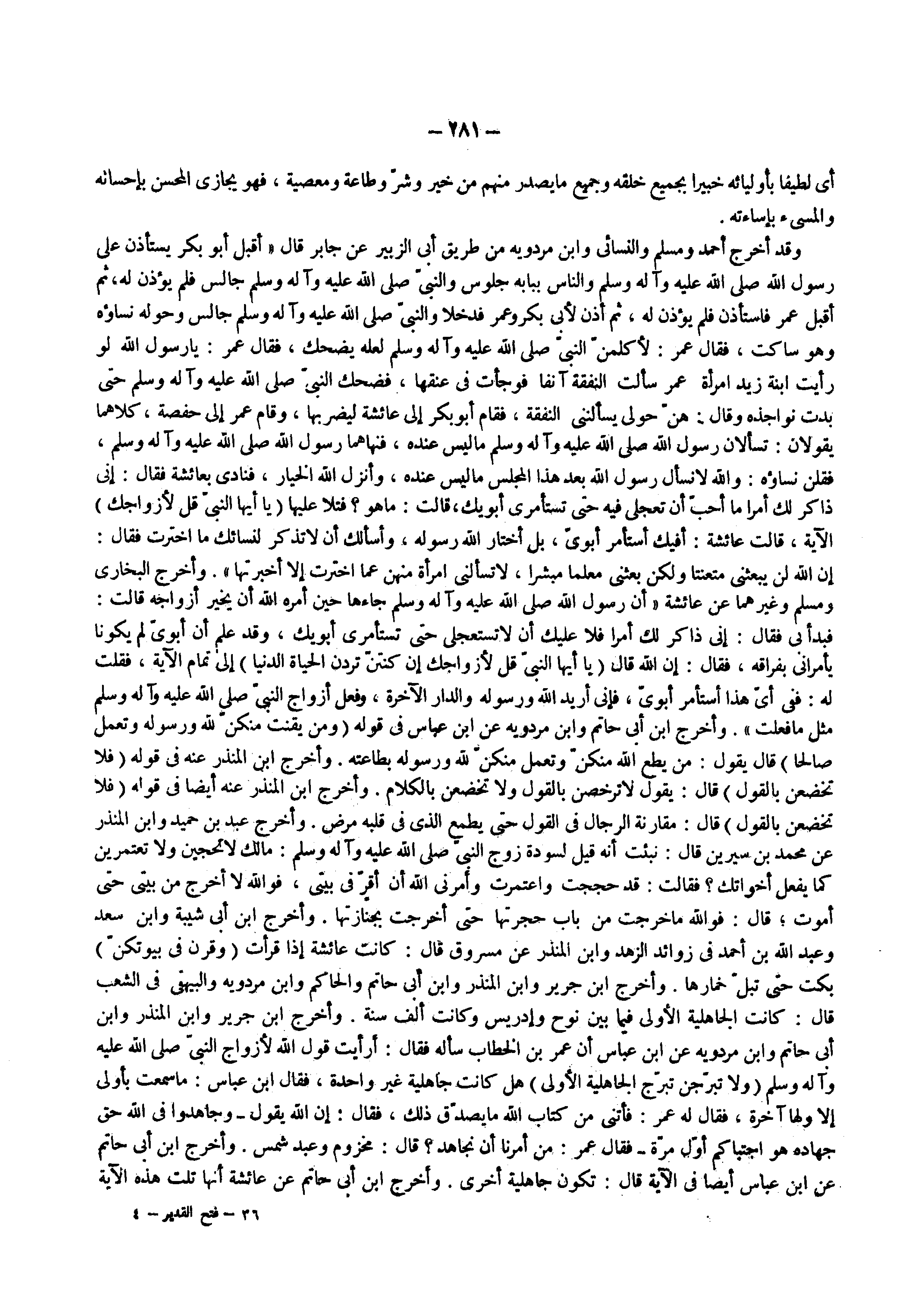 وقد أخرج أحمد ومسلم والنسائى وابن مردويه من طريق أبى الزبير عن جابر قال أقبل أبو بكر يستأذن على رسول الله ( صلى الله عليه وسلم ) والناس ببابه جلوس والنبى ( صلى الله عليه وسلم ) جالس فلم يؤذن له ثم أقبل عمر فاستأذن فلم يؤذن له ثم أذن لأبى بكر وعمر فدخلا والنبى ( صلى الله عليه وسلم ) جالس وحوله نساؤه وهو ساكت فقال عمرت لأكملن النبى ( صلى الله عليه وسلم ) لعله يضحك فقال عمر يا رسول الله لو رأيت ابنة زيد امرأة عمر سألت النفقة آنفا فوجأت فى عنقها فضحك النبى ( صلى الله عليه وسلم ) حتى بدت نواجذه وقال هن حولى يسألننى النفقة فقام أبو بكر إلي عائشة ليضربها وقام عمر إلى حفصة كلاهما يقولان تسألان رسول الله ( صلى الله عليه وسلم ) ما ليس عنده فنهاهما رسول الله ( صلى الله عليه وسلم ) فقلن نساؤه والله لا نسأل رسول الله بعد هذا المجلس ماليس عنده وأنزل الله الخيار فنادى بعائشة فقال إنى ذاكر لك أمرا ما أحب أن تعجلي فيه حتى تستأمرى أبويك قالت ما هو فتلا عليها ) يا أيها النبي قل لأزواجك ( الاية قالت عائشة أفيك أستأمر أبوى بل أختار الله رسوله وأسالك أن لا تذكر لنسائك ما اخترت فقال إن الله لن يبعثني معلما مبشرا لا تسألني امرأة منهن عما اخترت إلا أخبرتها وأخرج البخارى ومسلم وغيرهما عن عائشة أن رسول الله ( صلى الله عليه وسلم ) جاءها حين أمره الله أن يخير أزواجه قالت فبدأ بى فقال إنى ذاكر لك أمر فلا عليك أن لا تستعجلى حتى تستأمرى أبويك وقد علم أن أبوى لم يكونا يأمرانى بفراقه فقال إن الله قال ) يا أيها النبي قل لأزواجك إن كنتن تردن الحياة الدنيا ( إلي تمام الاية فقلت له ففى أى هذا أستأمر أبوى فإنى أريد الله ورسوله والدار الآخرة وفعل أزواج النبى ( صلى الله عليه وسلم ) مثل مافعلت وأخرج ابن أبى حاتم وابن مردويه عن ابن عباس فى قوله ) ومن يقنت منكن لله ورسوله وتعمل صالحا ( قال يقول من يطع الله منكن وتعمل منكن لله ورسوله بطاعته وأخرج ابن المنذر عنه فى قوله ) فلا تخضعن بالقول ( قال يقول لاترخصن بالقول ولاتخضعن بالكلام وأخرج ابن المنذر عنه أيضا فى قوله ) فلا تخضعن بالقول ( قال مقارنة الرجال فى القول حتى يطمع الذى فى قلبه مرض وأخرج عبد بن حميد وابن المنذر عن محمد بن سيرين قال نبئت أنه قيل لسودة زوج النبى ( صلى الله عليه وسلم ) مالك لاتحجين ولاتعتمرين كما يفعل أخوانك فقالت قد حججت واعتمرت وأمرنى الله أن أقر فى بيتى فوالله لا أخرج من بيتى حتى أموت قال فوالله ماخرجت من باب حجرتها حتى أخرجت بجنازتها وأخرج ابن أبى شيبة وابن سعد وعبد الله بن أحمد فى زوائد الزاهد وابن المنذر عن مسروق قال كانت عائشة إذا قرأت ) وقرن في بيوتكن ( بكت حتى تبل خمارها وأخرج ابن جرير وابن المنذر وابن أبى حاتم والحاكم وابن مردويه والبيهقى فى الشعب قال كانت الجاهلية الأولي فيما بين نوح وإدريس وكانت ألف سنة وأخرج ابن جرير وابن المنذر وابن أبى حاتم وابن مردويه عن ابن عباس أن عمر بن الخطاب سأله فقال أرأيت قول الله لأزواج النبى ( صلى الله عليه وسلم ) ) ولا تبرجن تبرج الجاهلية الأولى ( هل كانت جاهلية غير واحدة فقال ابن عباس ماسمعت بأولى إلا ولها آخرة فقال له عمر فأتنى من كتاب الله مايصدق ذلك فقال إن الله يقول وجاهدوا فى الله حق جهاده هو اجتباكم أول مرة فقال عمر من أمرنا أن نجاهد قال مخزوم وعبد شمس وأخرج ابن أبى حاتم عن ابن عباس أيضا فى الآية قال تكون جاهلية أخرى وأخرج ابن أبى حاتم عن عائشة أنها تلت هذه الآية