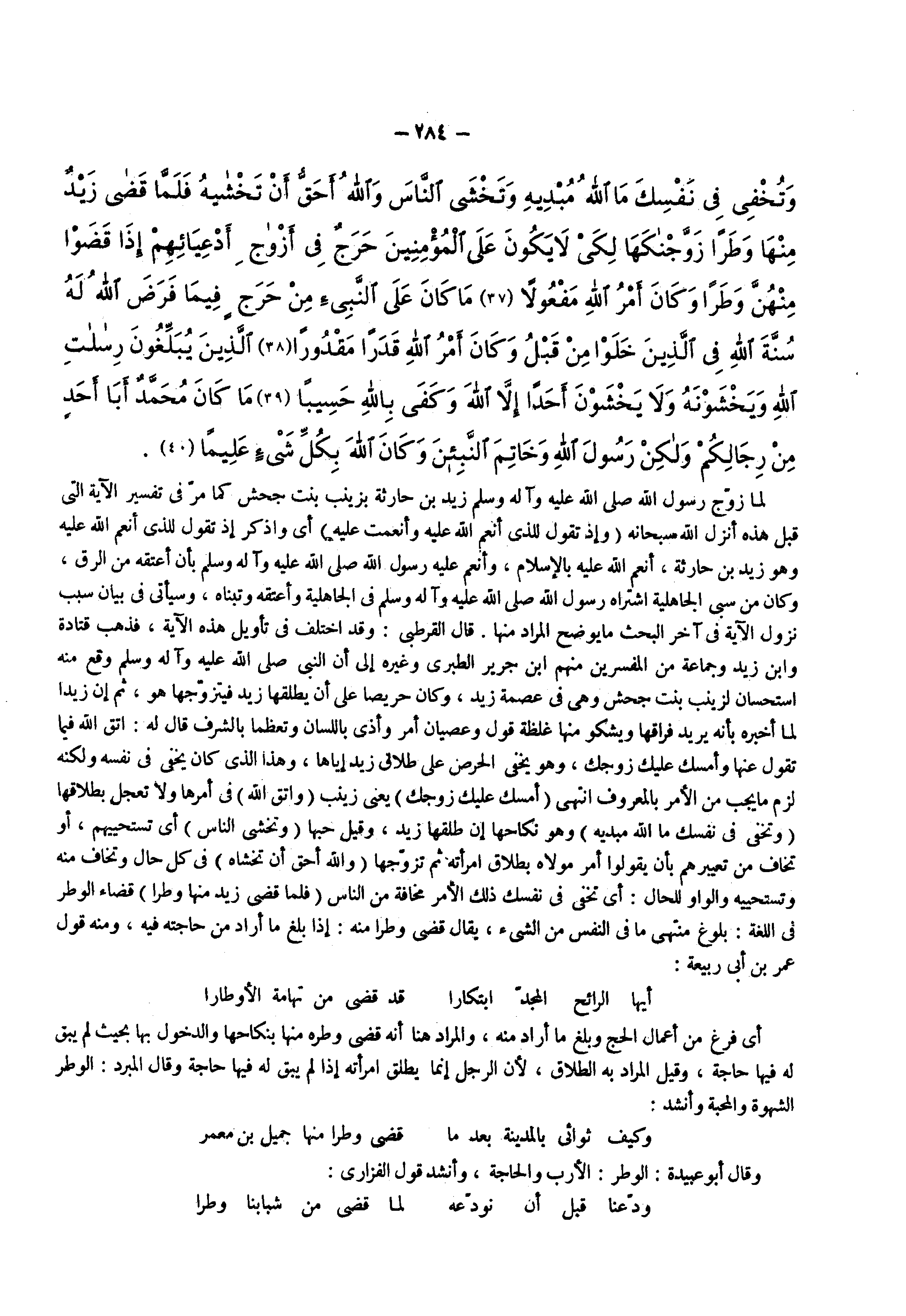 لما زوج رسول الله ( صلى الله عليه وسلم ) زيد بن حارثة بزينب بنت جحش كما مر فى تفسير الآية التى قبل هذه أنزل الله سبحانه ) وإذ تقول للذي أنعم الله عليه وأنعمت عليه ( أى واذكر إذ تقول للذى أنعم الله عليه وهو زيد بن حارثة أنعم الله عليه بالإسلام وأنعم عليه رسول الله ( صلى الله عليه وسلم ) بأن أعتقه من الرق وكان من سبي الجاهلية اشتراه رسول الله ( صلى الله عليه وسلم ) فى الجاهلية وأعتقه وتبناه وسيأتى فى بيان سبب نزول الآية فى آخر البحث مايوضح المراد منها قال القرطبى وقد اختلف فى تأويل هذه الآية فذهب قتادة وابن زيد وجماعة من المفسرين منهم ابن جرير الطبرى وغيره إلى أن النبى ( صلى الله عليه وسلم ) وقع منه استحسان لزينب بنت جحش وهى فى عصمة زيد وكان حريصا على أن يطلقها زيد فيتزوجها هو ثم إن زيدا لما أخبره بأنه يريد فراقها ويشكو منها غلظة قول وعصيان أمر وأذى باللسان وتعظما بالشرف قال له اتق الله فيما تقول عنها وأمسك عليك زوجك وهو يخفى الحرص علي طلاق زيد إياها وهذا الذى كان يخفى فى نفسه ولكنه لزم مايجب من الأمر بالمعروف انتهى ) أمسك عليك زوجك ( يعنى زينب ) واتق الله ( فى أمرها ولاتعجل بطلاقها ) وتخفي في نفسك ما الله مبديه ( وهو نكاحها إن طلقها زيد وقيل حبها ) وتخشى الناس ( أى تستحيهم أو تخاف من تعيبرهم بأن يقولوا أمر مولاه بطلاق امرأته ثم تزوجها ) والله أحق أن تخشاه ( فى كل حال وتخاف منه وتستحييه والواو للحال أى تخفى فى نفسك ذلك الأمر مخافة من الناس ) فلما قضى زيد منها وطرا ( قضاء الوطر فى اللغة بلوغ منتهى ما فى النفس من الشىء يقال وطرا منه إذا بلغ ما أراد من حاجته فيه ومنه قول عمر بن أبى ربيعة أيها الرائح المجد ابتكارا