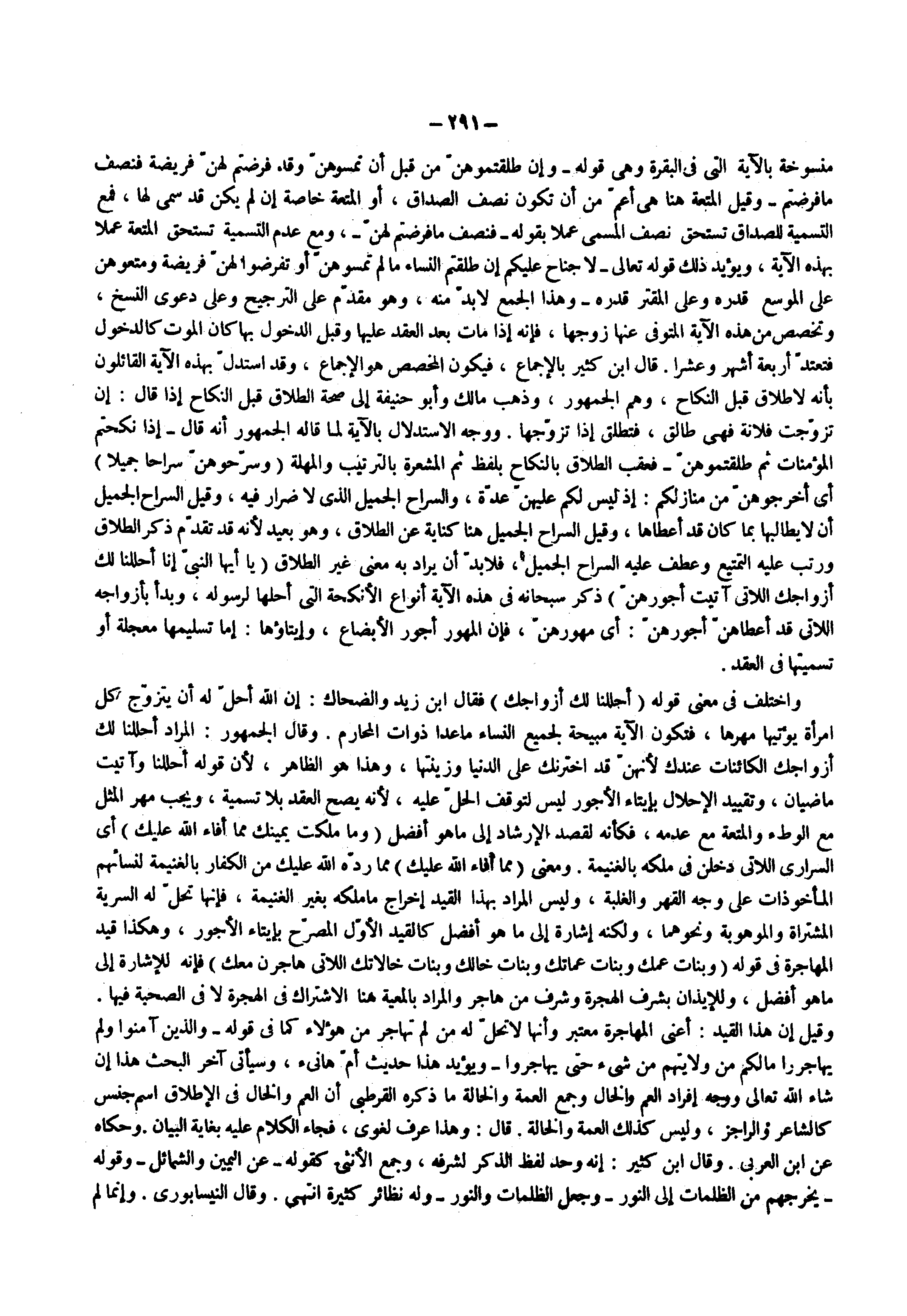 واختلف فى معنى قوله ) أحللنا لك أزواجك ( فقال ابن زيد والضحاك إن الله أحل له أن يتزوج كل امرأة يؤتيها مهرها فتكون الآية مبيحة لجميع النساء ماعدا ذوات المحارم وقال الجمهور المراد أحللنا لك أزواجك الكائنات عندك لأنهن قد اخترنك على الدنيا وزينتها وهذا هو الظاهر لأن قوله أحللنا وآتيت ماضيان وتقييد الإحلال بإيتاء الأجور ليس لتوقف الحل عليه لأنه يصح العقد بلا تسمية ويجب مهر المثل مع الوطء والمتعة مع عدمه فكأنه لقصد الإرشاد إلى ماهو أفضل ) وما ملكت يمينك مما أفاء الله عليك ( أى السرارى اللاتى دخلن فى ملكه بالغنيمة ومعنى ) مما أفاء الله عليك ( مما رده الله عليك من الكفار بالغنيمة لنسائهم المأخوذات على وجه القهر والغلبة وليس المراد بهذا القيد إخراج ماملكه بغير الغنيمة فإنها تحل له السرية المشتراة والموهوبة ونحوهما ولكنه إشارة إلى ماهو أفضل كالقيد الأول المصرح بإيتاء الأجور وهكذا قيد المهاجرة فى قوله ) وبنات عمك وبنات عماتك وبنات خالك وبنات خالاتك اللاتي هاجرن معك ( فإنه للإشارة إلى ماهو أفضل وللإيذان بشرف الهجرة وشرف من هاجر والمراد بالمعية هنا الاشتراك فى الهجرة لا فى الصحبة فيها وقيل إن هذا القيد أعنى المهاجرة معتبر وأنها لاتحل له من لم تهاجر من هؤلاء كما فى قوله ) والذين آمنوا ولم يهاجروا ما لكم من ولايتهم من شيء حتى يهاجروا ( ويؤيد هذا حديث أم هانىء وسيأتى آخر البحث هذا إن شاء الله تعالى ووجه إفراد العم والخال وجمع العمة والخالة ماذكره القرطبى أن العم والخال فى الإطلاق اسم جنس كالشاعر والراجز وليس كذلك العمة والخالة قال وهذا عرف لغوى فجاء الكلام عليه بغاية البيان وحكاه عن ابن العربى وقال ابن كثير إنه وحد لفظ الذكر لشرفه وجمع الأنثى كقوله عن اليمين والشمائل وقوله ) يخرجهم من الظلمات إلى النور ( ) وجعل الظلمات والنور ( وله نظائر كثيرة انتهى وقال النيسابورى وإنما لم