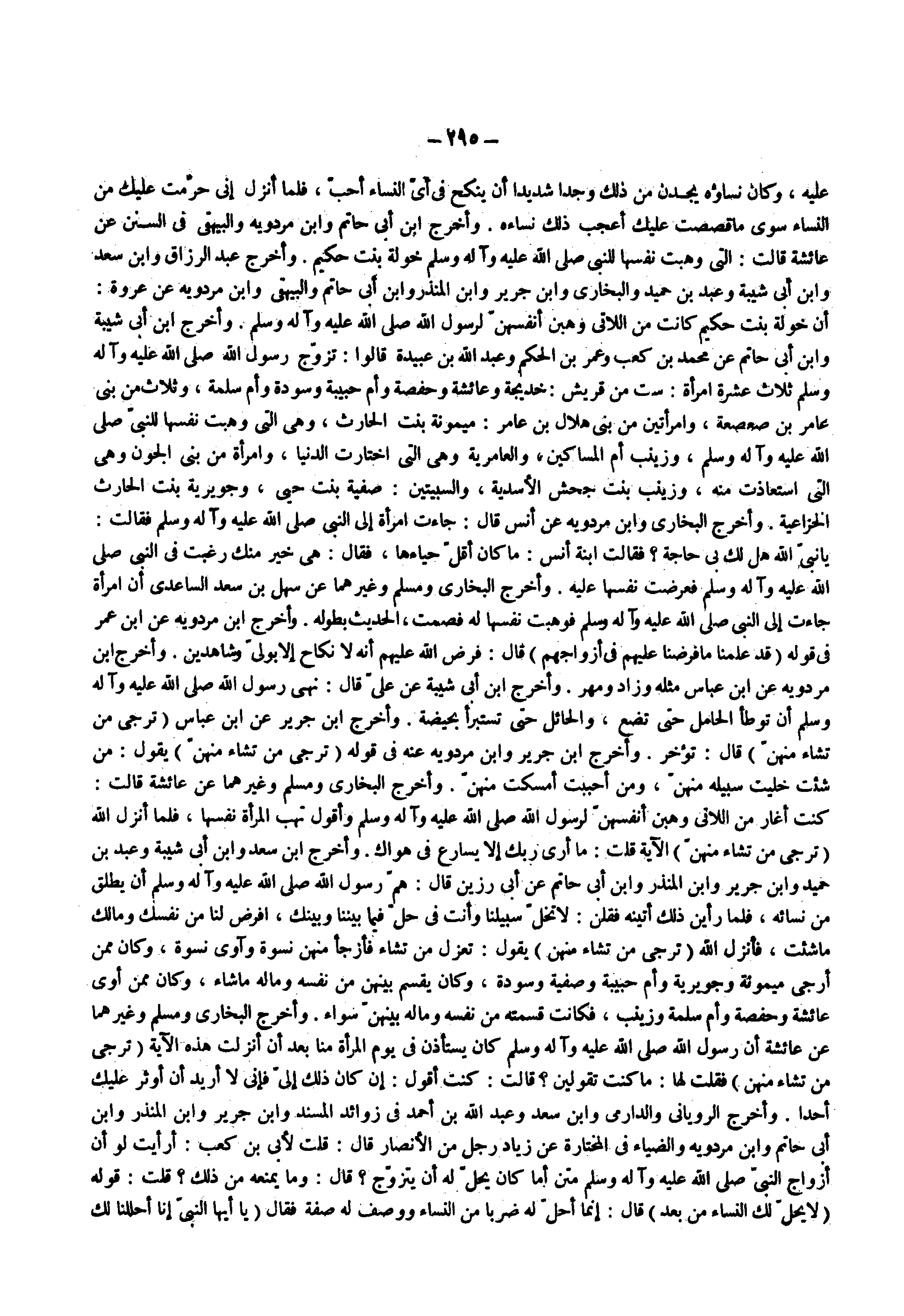 عليه وكان نساوه يجدن من ذلك وجدا شديدا أن ينكح فى أى النساء أحب فلما أنزل إنى حرمت عليك من النساء سوى ماقصصت عليك أعجب ذلك نساءه وأخرج ابن أبى حاتم وابن مردويه والبيهقى فى السنن عن عائشة قالت التي وهبت نفسها للنبى ( صلى الله عليه وسلم ) خولة بنت حكيم وأخرج عبد الرزاق وابن سعد وابن أبى شيبة وعبد بن حميد والبخارى وابن جرير وابن المنذر وابن أبى حاتم والبيهقى وابن مردويه عن عروة أن خولة بنت حكيم كانت من اللاتى وهبن أنفسهن لرسول الله ( صلى الله عليه وسلم ) وأخرج ابن أبى شيبة وابن أبى حاتم عن محمد بن كعب وعمر بن الحكم وعبد الله بن عبيدة قالوا تزوج رسول الله ( صلى الله عليه وسلم ) ثلاث عشرة امرأة ست من قريش خديجة وعائشة وحفصة وأم حبيبة وسودة وأم سلمة وثلاث من بنى عامر بن صعصعة وامرأتين من بنى هلال بن عامر ميمونة بنت الحارث وهى التى وهبت نفسها النبى ( صلى الله عليه وسلم ) وزينب أم المساكين والعامرية وهى التى اختارت الدنيا وامرأة من بنى الجون وهى التى استعاذت منه وزينب بنت جحش الأسدية والسبيتين صفية بنت حيى وجويرية بنت الحارث الخزاعية وأخرج البخارى وابن مردويه عن أنس قال جاءت امرأة إلى النبى ( صلى الله عليه وسلم ) فقالت يانبى الله هل لك بى حاجة فقالت ابنة أنس ما كان أقل حياءها فقال هى خير منك رغبت فى النبى ( صلى الله عليه وسلم ) فعرضت نفسها عليه وأخرج البخارى ومسلم وغيرهما عن سهل بن سعد الساعدي أن امرأة جاءت إلى النبي ( صلى الله عليه وسلم ) فوهبت نفسها له فصمت الحديث بطوله وأخرج ابن مردويه عن ابن عمر فى قوله ) قد علمنا ما فرضنا عليهم في أزواجهم ( قال فرض الله عليهم أنه لا نكاح إلا بولى وشاهدين وأخرج ابن مردويه عن ابن عباس مثله وزاد ومهر وأخرج ابن أبى شيبة عن على قال نهى رسول الله ( صلى الله عليه وسلم ) أن توطأ الحامل حتى تضع والحائل حتى تستبرأ بحيضه وأخرج ابن جرير عن ابن عباس ) ترجي من تشاء منهن ( قال تؤخر وأخرج ابن جرير وابن مردويه عنه فى قوله ) ترجي من تشاء منهن ( يقول من شئت خليت سبيله منهن ومن أحببت أمسكت منهن وأخرج البخارى ومسلم وغيرهما عن عائشة قالت كنت أغار من اللاتى وهبن أنفسهن لرسول الله ( صلى الله عليه وسلم ) وأقول تهب المرأة نفسها فلما أنزل الله ) ترجي من تشاء منهن ( الاية قلت ما أرى ربك إلا يسارع فى هواك وأخرج ابن سعد وابن أبى شيبة وعبد بن حميد وابن جرير وابن المنذر وابن أبى حاتم عن أبى رزين قال هم رسول الله ( صلى الله عليه وسلم ) أن يطلق من نسائه فلما رأين ذلك أتينه فقلن لاتخل سبيلنا وأنت فى حل فيما بيننا وبينك افرض لنا من نفسك ومالك ماشئت فأنزل الله ) ترجي من تشاء منهن ( يقول تعزل من تشاء فأرجأ منهن نسوة وآوى نسوة وكان ممن أرجى ميمونة وجويرية وأم حبيبة وصفية وسودة وكان يقسم بينهن من نفسه وماله ماشاء وكان ممن أوى عائشة وحفصة وأم سلمة وزينب فكانت قسمته من نفسه وماله بينهن سواء وأخرج البخارى ومسلم وغيرهما عن عائشة أن رسول الله ( صلى الله عليه وسلم ) كان يستأذن فى يوم المرأة منا بعد أن أنزلت هذه الآية ) ترجي من تشاء منهن ( فقلت لها ماكنت تقولين قالت كنت أقول إن كان ذلك إلى فإنى لا أريد أن أوثر عليك أحدا وأخرج الرويانى والدرامى وابن سعد وعبد الله بن أحمد فى زوائد المسند وابن جرير وابن المنذر وابن أبى حاتم وابن مردويه والضياء فى المختارة عن زياد رجل من الأنصار قال قلت لأبى بن كعب أرأيت لو أن أزواج النبى ( صلى الله عليه وسلم ) متن أما كان يحل له أن يتزوج قال وما يمنعه من ذلك قلت قوله ) لا يحل لك النساء من بعد ( قال إنما أحل له ضربا من النساء ووصف له صفة فقال ) يا أيها النبي إنا أحللنا لك أزواجك (