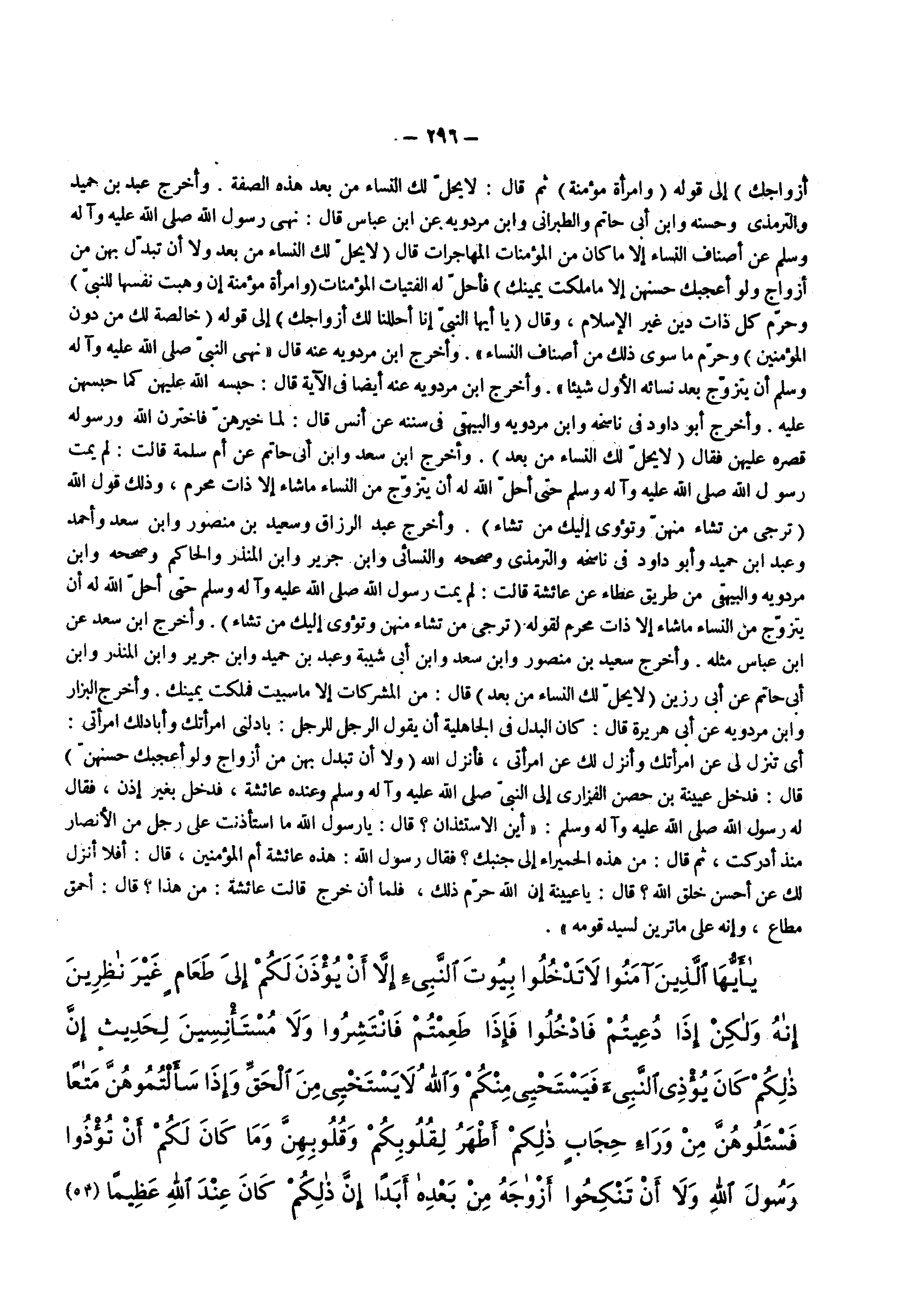 إلى قوله ) وامرأة مؤمنة ( ثم قال لايحل لك النساء من بعد هذه الصفة وأخرج عبد بن حميد والترمذى وحسنه وابن أبى حاتم والطبرانى وابن مردويه عن ابن عباس قال نهى رسول الله ( صلى الله عليه وسلم ) عن أصناف النساء إلا ما كان من المؤمنات المهاجرات قال ) لا يحل لك النساء من بعد ولا أن تبدل بهن من أزواج ولو أعجبك حسنهن إلا ما ملكت يمينك ( فأحل له الفتيات المؤمنات ) وامرأة مؤمنة إن وهبت نفسها للنبي ( وحرم كل ذات دين غير الإسلام وقال ) يا أيها النبي إنا أحللنا لك أزواجك ( إلى قوله ) خالصة لك من دون المؤمنين ( وحرم ماسوى ذلك من أصناف النساء وأخرج ابن مردويه عنه قال نهي النبى ( صلى الله عليه وسلم ) أن يتزوج بعد نسائه الأول شيئا وأخرج ابن مردويه عنه أيضا فى الاية قال حبسه الله عليهن كما حبسهن عليه وأخرج أبو داود فى ناسخه وابن مردويه والبيهقى فى سننه عن أنس قال لما خيرهن فاخترن الله ورسوله قصره عليهن فقال ) لا يحل لك النساء من بعد ( وأخرج ابن سعد وابن أبى حاتم عن أم سلمة قالت لم يمت رسول الله ( صلى الله عليه وسلم ) حتى أحل الله أن يتزوج من النساء ماشاء إلا ذات محرم وذلك قول الله ) ترجي من تشاء منهن وتؤوي إليك من تشاء ( وأخرج عبد الرزاق وسعيد بن منصور وابن سعد وأحمد وعبد ابن حميد وأبو داود فى ناسخه والترمذى وصححه والنسائى وابن جرير وابن المنذر والحاكم وصححه وابن مردويه والبيهقى من طريق عطاء عن عائشة قالت لم يمت رسول الله ( صلى الله عليه وسلم ) حتى أحل الله له أن يتزوج من النساء ماشاء إلا ذات محرم لقوله ) ترجي من تشاء منهن وتؤوي إليك من تشاء ( وأخرج ابن سعد عن ابن عباس مثله وأخرج سعيد بن منصور وابن سعد وابن أبى شيبة وعبد بن حميد وابن جرير وابن المنذر وابن أبى حاتم عن أبى رزين ) لا يحل لك النساء من بعد ( قال من المشركات إلا ماسبيت فملكت يمينك وأخرج البزار وابن مردويه عن أبى هريرة قال كان البدل فى الجاهلية أن يقول الرجل للرجل بادلنى امرأتك وأبادلك امرأتى أى تنزل لى عن امرأتك وأنزل لك عن امرأتى فأنزل الله ) ولا أن تبدل بهن من أزواج ولو أعجبك حسنهن ( قال فدخل عيينة بن حصن الفزارى إلى النبى ( صلى الله عليه وسلم ) وعنده عائشة فدخل بغير إذن فقال له رسول الله ( صلى الله عليه وسلم ) أين الاستئذان قال يا رسول الله ما أستأذنت على رجل من الأنصار منذ أدركت ثم قال من هذه الحميراء إلى جنبك فقال رسول الله هذه عائشة أم المؤمنين قال أفلا أنزل لك عن أحسن خلق الله قال ياعيينة إن الله حرم ذلك فلما أن خرج قالت عائشة من هذا قال أحمق مطاع وإنه على ماترين لسيد قومه
