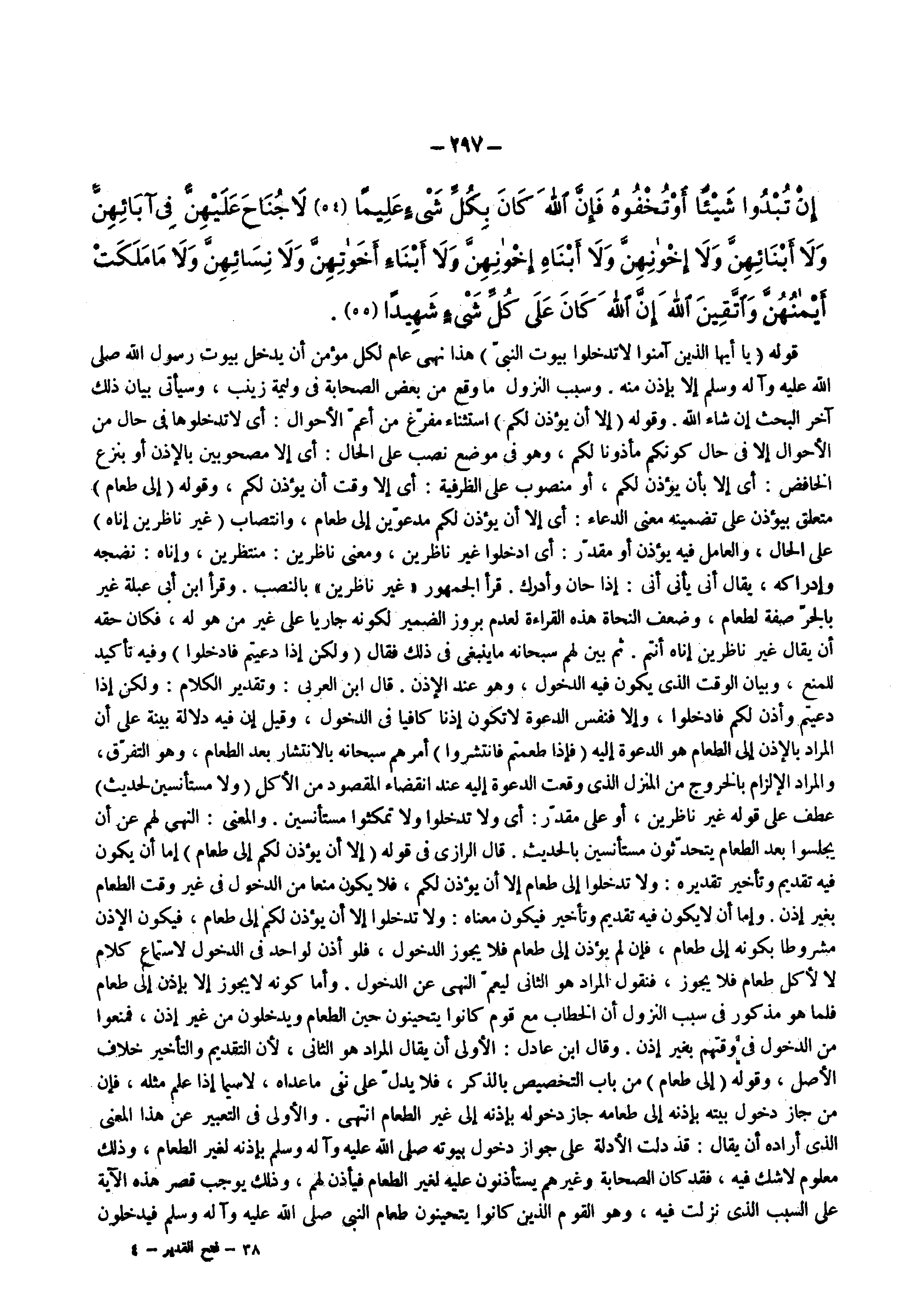 قوله ) يا أيها الذين آمنوا لا تدخلوا بيوت النبي ( هذا نهى عام لكل مؤمن أن يدخل بيوت رسول الله ( صلى الله عليه وسلم ) إلا بإذن منه وسبب النزول ما وقع من بعض الصحابة وليمة زينب وسيأتى بيان ذلك اخر البحث إن شاء الله وقوله ) إلا أن يؤذن لكم ( استثناء مفرغ من أعم الأحوال أى لاتدخلوها فى حال من الأحوال إلا فى حال كونكم مأذونا لكم وهو في موضع نصب علي الحال أى إلا مصحوبين بالإذن أو بنزع الخافض أى إلا يؤذن لكم أو منصوب على الظرفية أى إلا وقت أن يوذن لكم وقوله ) إلى طعام ( متعلق بيؤذن على تضمينه معنى الدعاء أى إلا أن يؤذن لكم مدعوين إلى طعام وانتصاب ) غير ناظرين إناه ( على الحال والعامل فيه يؤذن أومقدر أى ادخلوا غير ناظرين ومعنى ناظرين منتظرين وإناه نضجه وإدراكه يقال أنى يأنى أنى إذا حان وأدرك قرأ الجمهور غير ناظرين بالنصب وقرأ ابن أبى عبلة غير بالجر صفة لطعام وضعف النحاة هذه القراءة لعدم بروز الضمير لكونه جاريا على غير من هو له فكان حقه أن يقال غير ناظرين إناه أنتم ثم بين لهم سبحانه ماينبغى فى ذلك فقال ) ولكن إذا دعيتم فادخلوا ( وفيه تأكيد للمنع وبيان الوقت الذي يكون فيه الدخول وهو عند الإذن قال ابن العربى وتقدير الكلام ولكن إذا دعيتم وأذن لكم فادخلوا وإلا فنفس الدعوة لاتكون إذنا كافيا فى الدخول وقيل إن فيه دلالة بينة على أن المراد بالإذن إلى الطعام هو الدعوة إليه ) فإذا طعمتم فانتشروا ( أمرهم سبحانه بالانتشار بعد الطعام وهو التفرق والمراد الإلزام بالخروج من المنزل الذى وقعت الدعوة إليه عند انقضاء المقصود من الأكل ) ولا مستأنسين لحديث ( عطف علي قوله غير ناظرين أو على مقدر أى ولا تدخلوا ولا تمكثوا مستأنسين والمعنى النهى لهم عن أن يجلسوا بعد الطعام يتحدثون مستأنسين بالحديث قال الرازى فى قوله ) إلا أن يؤذن لكم إلى طعام ( إما أن يكون فيه تقديم وتأخير تقديره ولاتدخلوا إلى طعام إلا أن يؤذن لكم فلا يكون منعا من الدخول فى غير وقت الطعام بغير إذن وإما أن لايكون فيه تقديم وتأخير فيكون معناه ولاتدخلوا إلا أن يؤذن لكم إلي طعام فيكون الإذن مشروطا بكونه إلي طعام فإن لم يؤذن إلى طعام فلا يجوز الدخول فلو أذن لواحد فى الدخول لاستماع كلام لا لأكل طعام فلا يجوز فنقول المراد هو الثانى ليعم النهى عن الدخول وأما كونه لايجوز إلا بإذن إلى طعام فلما هو مذكور فى سبب النزول أن الخطاب مع قوم كانوا يتحينون حين الطعام ويدخلون من غير إذن فمنعوا من الدخول فى وقتهم بغير إذن وقال ابن عادل الأولى أن يقال المراد هو الثانى لأن التقديم والتأخير خلاف الأصل وقوله ) إلى طعام ( من باب التخصيص بالذكر فلا يدل علي نفى ما عداه لاسيما إذا علم مثله فإن من جاز دخول بيته بإذنه إلى طعامه جاز دخوله بإذنه إلي غير الطعام انتهى والأولى فى التعبير عن هذا المعنى الذى أراده أن يقال قد دلت الأدلة على جواز دخول بيوته ( صلى الله عليه وسلم ) بإذنه لغير الطعام وذلك معلوم لاشك فيه فقد كان الصحابة وغيرهم يستأذنون عليه لغير الطعام فيأذن لهم وذلك يوجب قصر هذه الآية على السبب الذى نزلت فيه وهو القوم الذين كانوا يتحينون طعام النبى ( صلى الله عليه وسلم ) فيدخلون