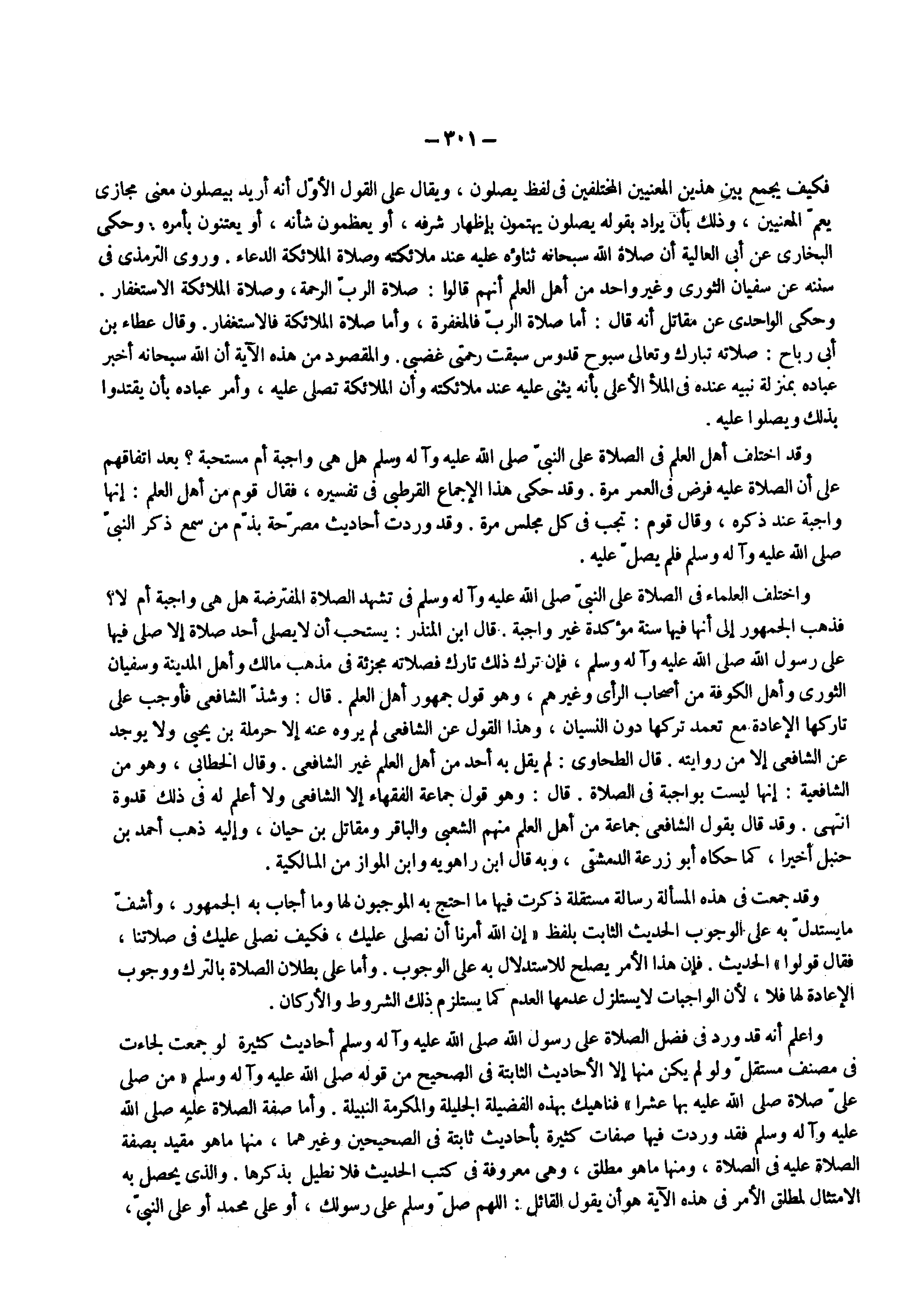 واختلف العلماء فى الصلاة علي النبى ( صلى الله عليه وسلم ) فى تشهد الصلاة المفترضة هل هى واجبة أم لا فذهب الجمهور إلى أنها فيها سنة مؤكدة غير واجبة قال ابن المنذر يستحب أن لايصلى أحد صلاة إلا صلى فيها علي رسول الله ( صلى الله عليه وسلم ) فإن ترك ذلك فصلاته مجزئة فى مذهب مالك وأهل المدينة وسفيان الثورى وأهل الكوفة من أصحاب الرأى وغيرهم وهو قول جمهور أهل العلم قال وشذ الشافعى فأوجب على تاركها الإعادة مع تعمد تركها دون النسيان وهذا القول عن الشافعى لم يروه عنه إلا حرملة بن يحيى ولا يوجد عن الشافعى إلا من روايته قال الطحاوى لم يقل به أحد من أهل العلم غير الشافعى وقال الخطابى وهو من الشافعيه إنها ليست بواجبة فى الصلاة قال وهو قول جماعة الفقهاء إلا الشافعى ولا أعلم له فى ذلك قدوة انتهى وقد قال يقول الشافعى جماعة من أهل العلم منهم الشعبى والباقر ومقاتل بن حيان وإليه ذهب أحمد بن حنبل أخيرا كما حكاه أبو زرعة الدمشقى وبه قال ابن راهويه وابن المواز من المالكية
