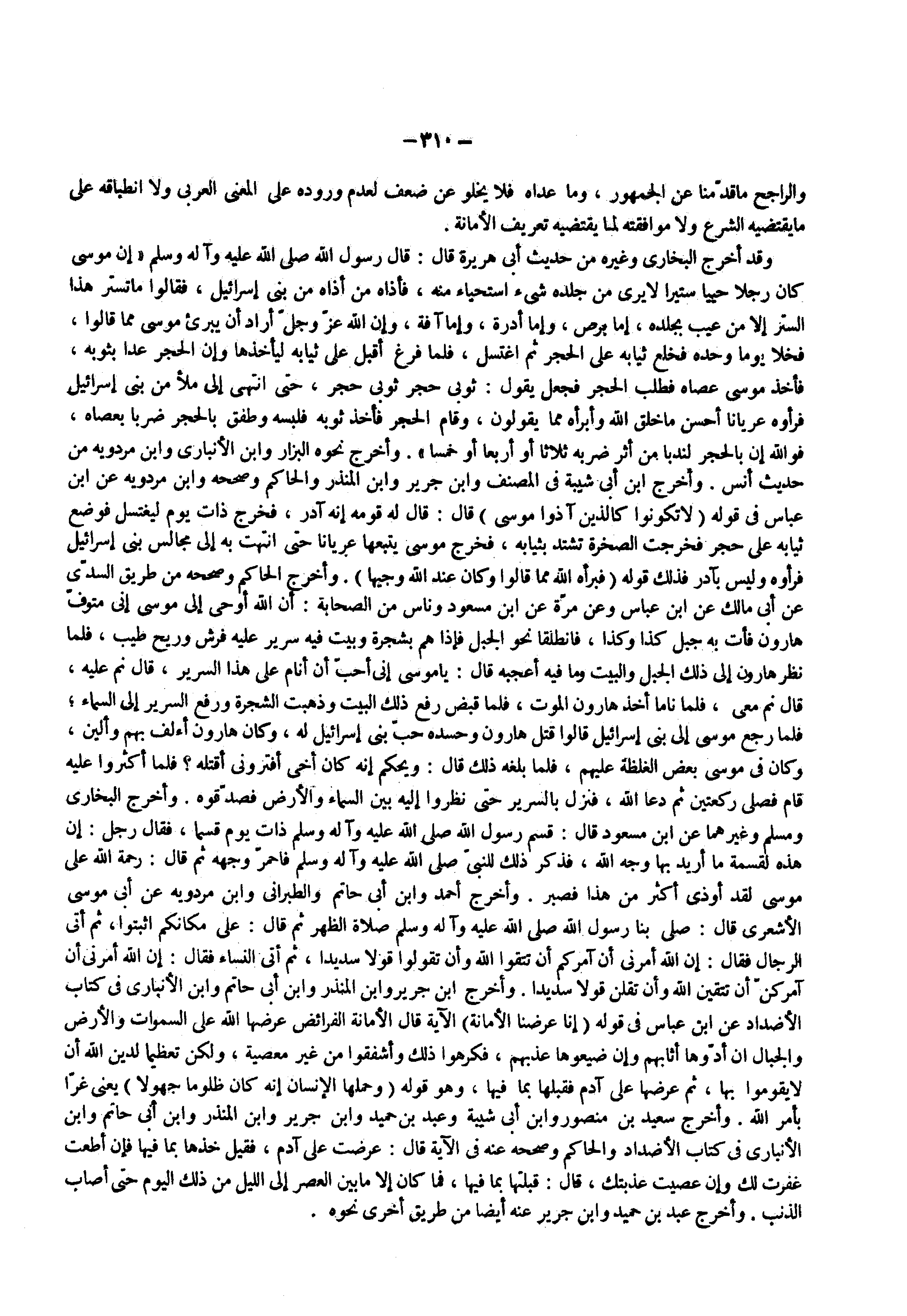 وقد أخرج البخارى وغيره من حديث أبى هريرة قال قال رسول الله ( صلى الله عليه وسلم ) إن موسى كان رجلا حيا ستيرا لايرى من جلده شىء استحياء منه فأذاه من أذاه من بنى إسرائيل فقالوا ماتستر هذا الستر إلا من عيب بجلده إما برص وإما أدرة وإما آفة وإن الله عز وجل أراد أن يبرئ موسى مما قالوا فخلا يوما وحده فخلع ثيابه على الحجر ثم اغتسل فلما فرغ أقبل على ثيابه ليأخذها وإن الحجر عدا بثوبه فأخذ موسى عصاه فطلب الحجر فجعل يقول ثوبى حجر ثوبى حجر حتى انتهى إلى ملأ من بنى إسرائيل فرأوه عريانا أحسن ماخلق الله وأبراه مما يقولون وقام الحجر فأخذ ثوبه فلبسه وطفق بالحجر ضربا بعصاه فوالله إن بالحجر لندبا من أثر ضربه ثلاثا أو أربعا أو خمسا وأخرج نحوه البزار وابن الأنبارى وابن مردويه من حديث أنس وأخرج ابن أبى شيبة في المصنف وابن جرير وابن المنذر والحاكم وصححه وابن مردويه عن ابن عباس فى قوله ) لا تكونوا كالذين آذوا موسى ( قال قال له قومه إنه آدر فخرج ذات يوم ليغتسل فوضع ثيابه على حجر فخرجت الصخرة تشتد بثيابه فخرج موسى يتبعها عريانا حتى انتهت به إلى مجالس بنى إسرائيل فرأوه وليس بآدر فذلك قوله ) فبرأه الله مما قالوا وكان عند الله وجيها ( وأخرج الحاكم وصححه من طريق السدى عن أبى مالك عن ابن عباس وعن مرة عن ابن مسعود وناس من الصحابة أن الله أوحى إلي موسى إنى متوف هارون فأت به جبل كذا وكذا فانطلقا نحو الجبل فإذا هم بشجرة وبيت فيه سرير عليه فرش وريح طيب فلما نظر هارون إلى ذلك الجبل والبيت وما فيه أعجبه قال يا موسى إنى أحب أن أنام على هذا السرير قال نم عليه قال نم معى فلما ناما أخذ هارون الموت فلما قبض رفع ذلك البيت وذهبت الشجرة ورفع السرير إلى السماء فلما رجع موسى إلى بنى إسرائيل قالوا قتل هارون وحسده حب بنى إسرائيل له وكان هارون أءلف بهم وألين وكان في موسى بعض الغلظة عليهم فلما بلغه قال ويحكم إنه كان أخى أفترونى أقتله فلما أكثروا عليه قام فصلى ركعتين ثم دعا الله فنزل بالسرير حتى نظروا إليه بين السماء والأرض فصدقوه وأخرج البخارى ومسلم وغيرهما عن ابن مسعود قال قسم رسول الله ( صلى الله عليه وسلم ) ذات يوم قسما فقال رجل إن هذه لقسمة ما أريد بها وجه الله فذكر ذلك للنبي ( صلى الله عليه وسلم ) فاحمر وجهه ثم قال رحمه الله على موسى لقد أوذى أكثر من هذا فصبر وأخرج أحمد وابن أبى حاتم والطبرانى وابن مردويه عن أبى موسى الأشعرى قال صلى بنا رسول الله ( صلى الله عليه وسلم ) صلاة الظهر ثم قال علي مكانكم اثبتوا ثم أتى الرجال فقال إن الله أمرنى أن آمركم أن تتقوا الله وأن تقولوا قولا سديدا ثم أتى النساء فقال إن الله أمرنى أن امركن أن تتقين الله وأن تقلن قولا سديدا وأخرج ابن جرير وابن المنذر وابن أبى حاتم وابن الأنبارى فى كتاب الأضداد عن ابن عباس فى قوله ) إنا عرضنا الأمانة ( الآية قال الأمانة الفرائض عرضها الله على السموات والأرض والجبال أن أدوها أثابهم وإن ضيعوها عذبهم فكرهوا ذلك وأشفقوا من غير معصية ولكن تعظيما لدين الله أن لايقوموا بها ثم عرضها على آدم فقبلها بما فيها وهو قوله ) وحملها الإنسان إنه كان ظلوما جهولا ( يعنى غرا بأمر الله وأخرج سعيد بن منصور وابن أبى شيبة وعبد بن حميد وابن جرير وابن المنذر وابن أبى حاتم وابن الانبارى فى كتاب الأضداد والحاكم وصححه عنه فى الاية قال عرضت على آدم فقيل خذها بما فيها فرن أطعت غفرت لك وإن عصيت عذبتك قال قبلتها بما فيها فما كان إلا مابين العصرإلى الليل من ذلك اليوم حتى أصاب الذنب وأخرج عبد بن حميد وابن جرير عنه أيضا من طريق أخرى نحوه