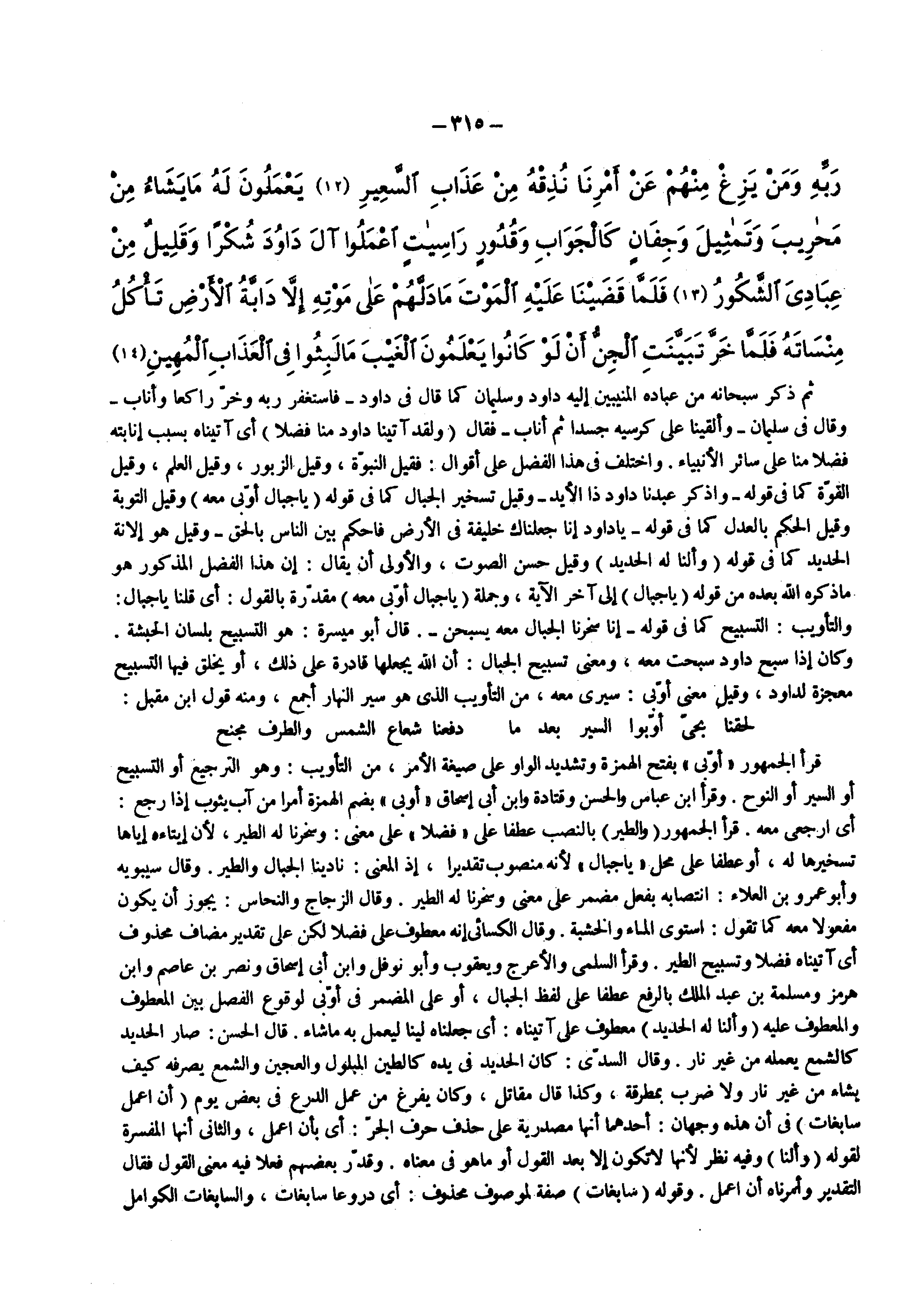 ثم ذكر سبحانه من عباده المنيبين إليه داود وسليمان كما قال فى داود ) فاستغفر ربه وخر راكعا وأناب ( وقال فى سليمان ) وألقينا على كرسيه جسدا ثم أناب ( فقال ) ولقد آتينا داود منا فضلا ( أى آتيناه بسبب إنابته فضلا منا على سائر الأنبياء واختلف فى هذا الفضل على أقوال فقيل النبوة وقيل الزبور وقيل العلم وقيل القوة كما فى قوله ) واذكر عبدنا داود ذا الأيد ( وقيل تسخير الجبال كما فى قوله ) يا جبال أوبي معه ( وقيل التوبة وقيل الحكم بالعدل كما فى قوله ) يا داود إنا جعلناك خليفة في الأرض فاحكم بين الناس بالحق ( وقيل هو إلانة الحديد كما فى قوله ) وألنا له الحديد ( وقيل حسن الصوت والأولى أن يقال إن هذا الفضل المذكور هو ما ذكره الله بعده من قوله يا جبال إلى آخر الآية وجملة ) يا جبال أوبي معه ( مقدرة بالقول أى قلنا يا جبال والتأويب التسبيح كما فى قوله ) إنا سخرنا الجبال معه يسبحن ( قال أبو ميسرة هو التسبيح بلسان الحبشة وكان إذا سبح داود سبحت معه ومعنى تسبيح الجبال أن الله يجعلها قادرة على ذلك أو يخلق فيها التسبيح معجزة لداود وقيل معنى أوبي سيرى معه من التأويب الذي هو سير النهار أجمع ومنه قول ابن مقبل لحقنا بحى أوبوا السير بعد ما