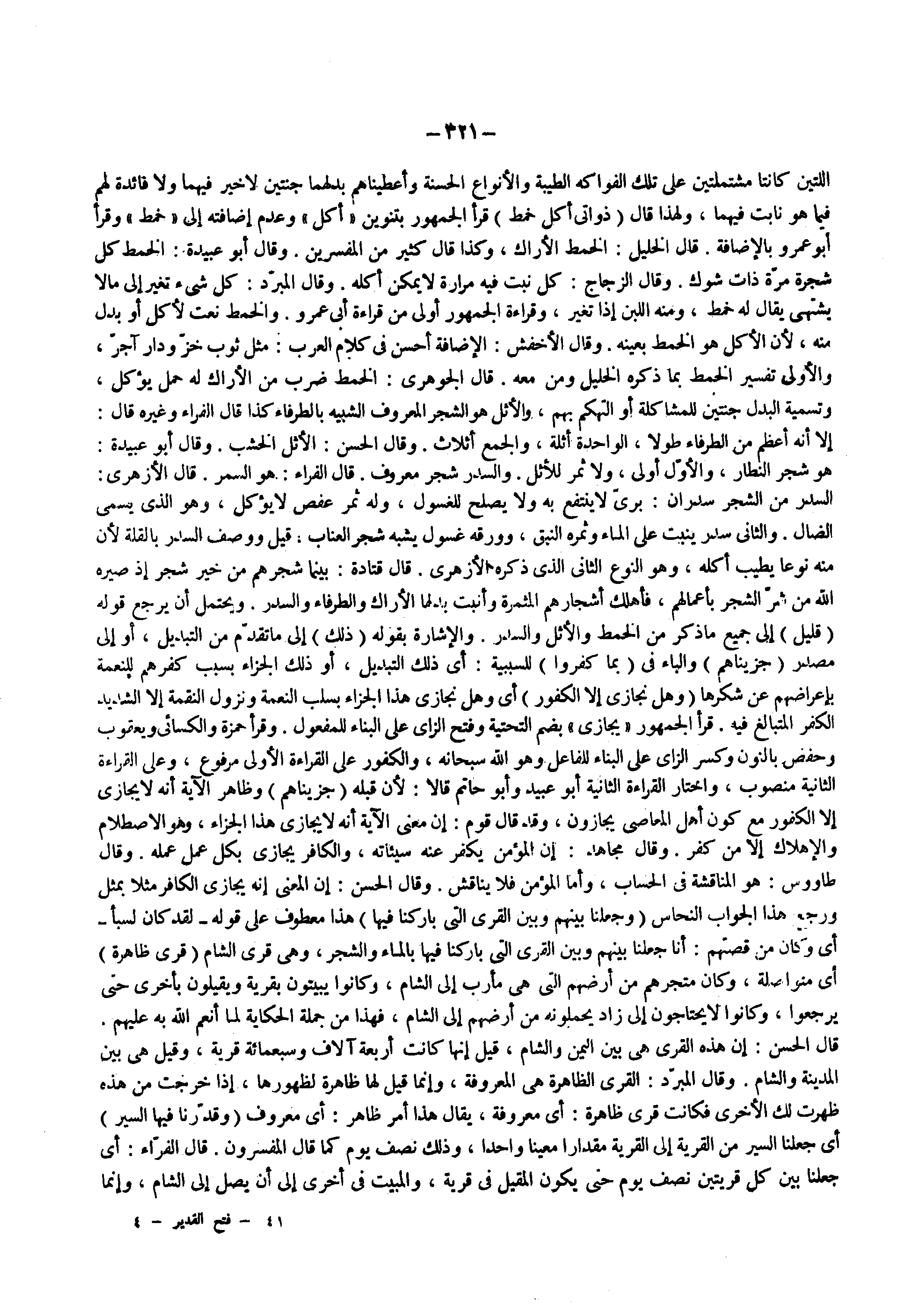 اللتين كانتا مشتملتين على تلك الفواكه الطيبة والأنواع الحسنة وأعطيناهم بدلهما جنتين لا خير فيهما ولا فائدة لهم فيما هو نابت فيهما ولهذا قال ) ذواتي أكل خمط ( قرأ الجمهور بتنوين أكل وعدم إضافته إلى خمط وقرأ أبو عمرو بالإضافة قال الخليل الخمط الأراك وكذا قال كثير من المفسرين وقال أبو عبيدة الخمط كل شجرة مرة ذات شوك وقال الزجاج كل نبت فيه مرارة لا يمكن أكله وقال المبرد كل شىء تغير إلى مالا يشتهى يقال له خمط ومنه اللبن إذا تغير وقراءة الجمهور أولى من قراءة أبى عمرو والخمط نعت لأكل أو بدل منه لأن الأكل هو الخمط بعينه وقال الأخفش الإضافة أحسن في كلام العرب مثل ثوب خز ودار آجر والأولى تفسير الخمط بما ذكره الخليل ومن معه قال الجوهرى الخمط ضرب من الأراك له حمل يؤكل وتسمية البدل جنتين للمشاكلة أو التهكم بهم والأثل هو الشجر المعروف الشبيه بالطرفاء كذا قال الفراء وغيره قال إلا أنه أعظم من الطرفاء طولا الواحدة أثلة والجمع أثلاث وقال الحسن الأثل الخشب وقال أبو عبيدة هو شجر النطار والأول أولى ولا ثمر للأثل والسدر شجر معروف قال الفراء هو السمر قال الأزهرى السدر من الشجر سدران برى لا ينتفع به ولا يصلح للغسول وله ثمر عفص لا يؤكل وهو الذى يسمى الضال والثانى سدر ينبت على الماء وثمره النبق وورقه غسول يشبه شجر العناب قيل ووصف السدر بالقلة لأن منه نوعا يطيب أكله وهو النوع الثاني الذى ذكره الأزهرى قال قتادة بينما شجرهم من خير شجر إذ صيره الله من ثمر الشجر بأعمالهم فأهلك أشجارهم المثمرة وأنبت بدلها الآراك والطرفاء والسدر ويحتمل أن يرجع قوله قليل إلى جميع ما ذكر من الخمط والأثل والسدر
