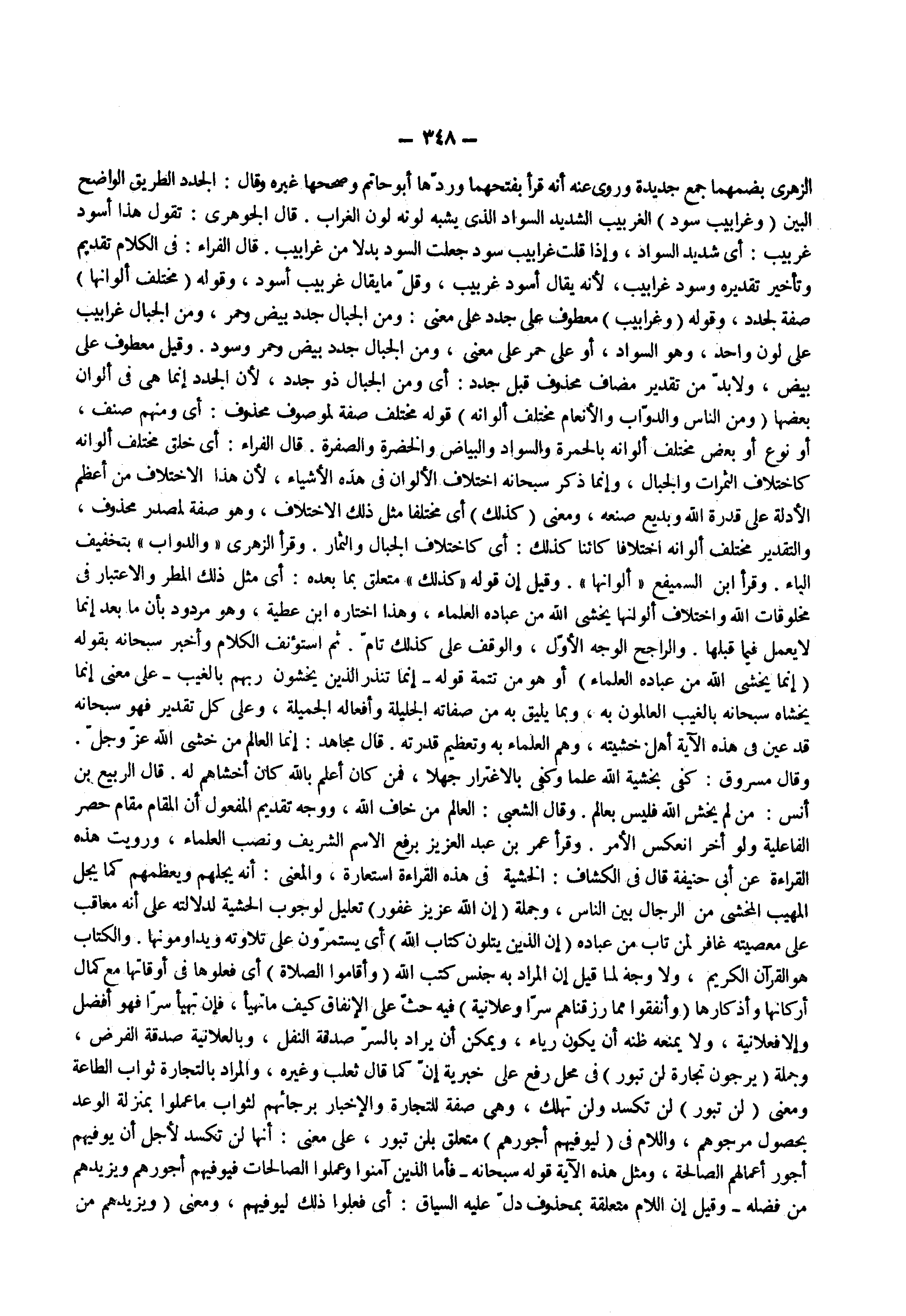 الزهرى بضمهما جمع جديدة وروى عنه أنه قرأ بفتحهما وردها أبو حاتم وصححها غيره وقال الجدد الطريق الواضح البين وغرابيب سود الغربيب الشديد السواد الذى يشبه لونه لون الغراب قال الجوهرى تقول هذا أسود غربيب أى شديد السواد وإذا قلت غرابيب سود جعلت السود بدلا من غرابيب قال الفراء فى الكلام تقديم وتأخير تقديره وسود غرابيب لأنه يقال أسود غربيب وقل ما يقال غربيب أسود وقوله ) مختلف ألوانها ( صفة لجدد وقوله ) وغرابيب ( معطوف على جدد على معنى ومن الجبال جدد بيض وحمر ومن الجبال غرابيب على لون واحد وهوالسواد أو على حمر على معنى ومن الجبال جدد بيض وحمر وسود وقيل معطوف على بيض ولا بد من تقدير مضاف محذوف قبل جدد أى ومن الجبال ذو جدد لأن الجدد إنما هى فى ألوان بعضها