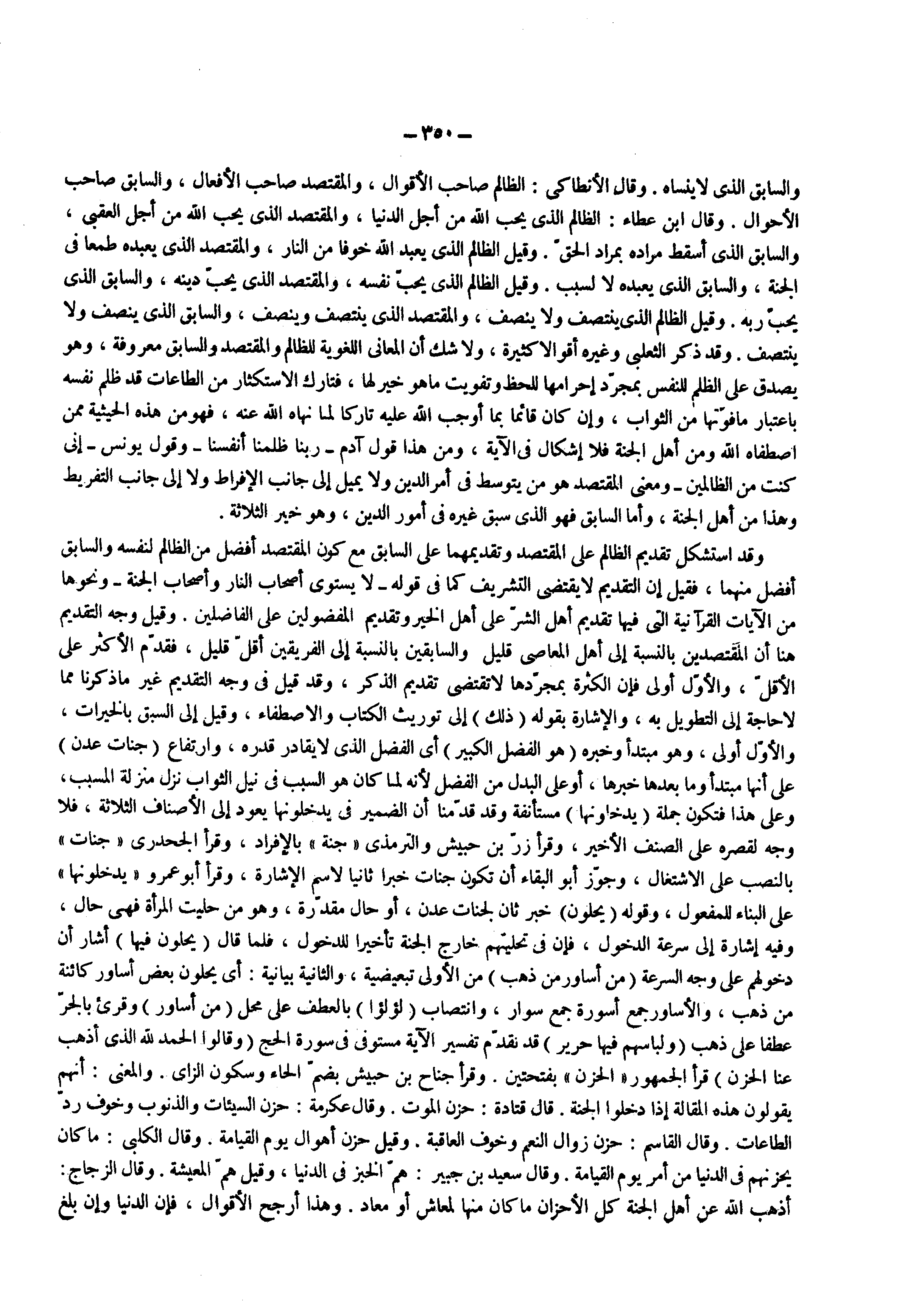 والسابق الذى لا ينساه وقال الأنطاكى الظالم صاحب الأقوال والمقتصد صاحب الأفعال والسابق صاحب الأحوال وقال ابن عطاء الظالم الذى يحب الله من أجل الدنيا والمقتصد الذى يحب الله من أجل العقبى والسابق الذى أسقط مراده بمراد الحق وقيل الظالم الذى يعبد الله خوفا من النار والمقتصد الذى يعبده طمعا فى الجنة والسابق الذى يعبده لا لسبب وقيل الظالم الذى يحب نفسه والمقتصد الذى يحب دينه والسابق الذى يحب ربه وقيل الظالم الذى ينتصف ولا ينصف والمقتصد الذى ينتصف وينصف والسابق الذي ينصف ولا ينتصف وقد ذكر الثعلبي وغيره أقوالا كثيرة ولا شك أن المعاني اللغوية للظالم والمقتصد والسابق معروفة وهو يصدق على الظلم للنفس بمجرد إحرامها للحظ وتفويت ما هو خير لها فتارك الاستكثار من الطاعات قد ظلم نفسه باعتبار ما فوتها من الثواب وإن كان قائما بما أوجب الله عليه تاركا لما نهاه الله عنه فهو من هذه الحيثيثة ممن اصطفاه الله ومن أهل الجنة فلا إشكال فى الآية ومن هذا قول آدم ربنا ظلمنا أنفسنا وقول يونس إنى كنت من الظالمين ومعنى المقتصد هو من يتوسط فى أمر الدين ولا يميل إلى جانب الإفراط ولا إلى جانب التفريط وهذا من أهل الجنة وأما السابق فهو الذى سبق غيره فى أمور الدين وهو خير الثلاثة