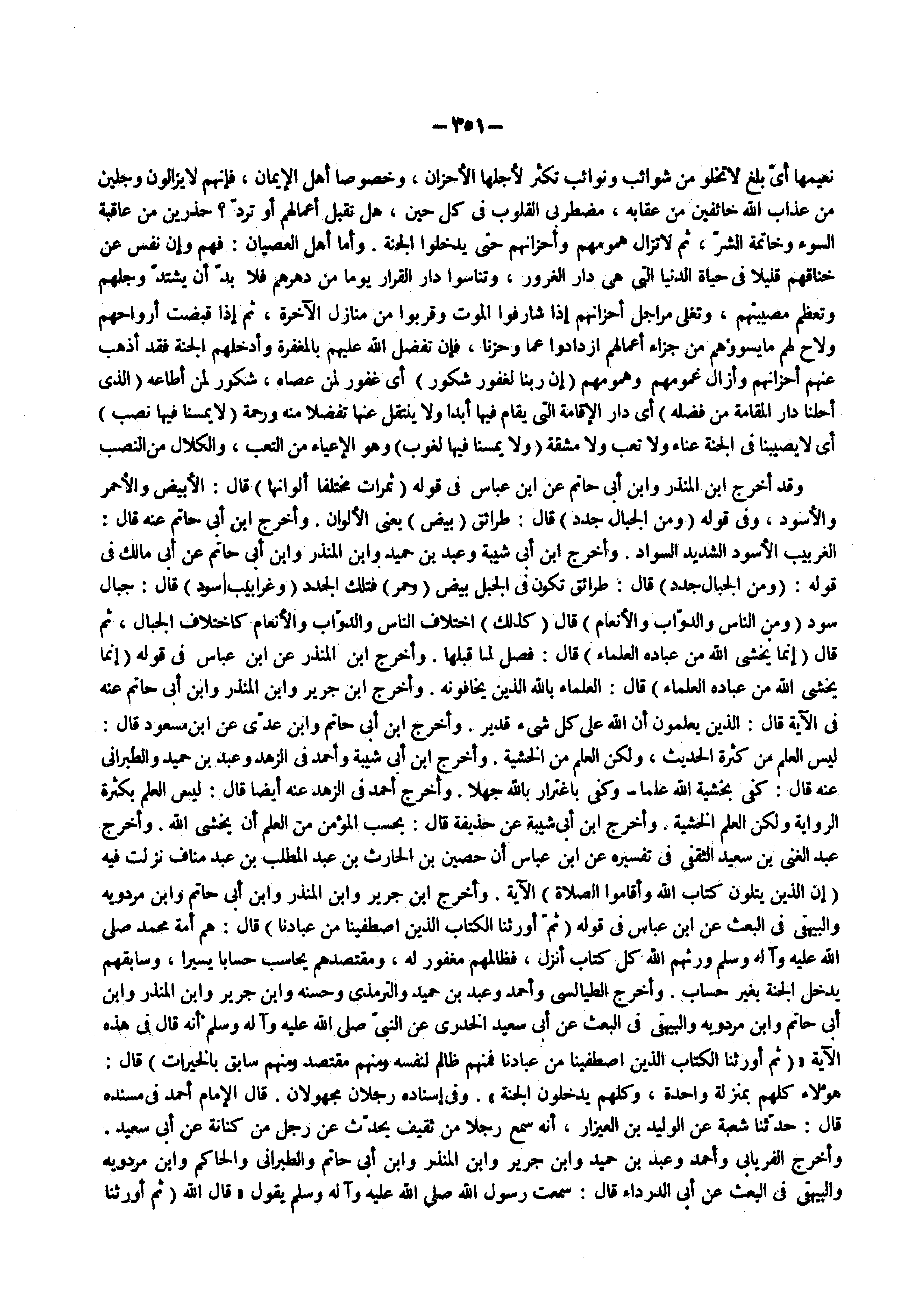 وقد أخرج ابن المنذر وابن أبى حاتم عن ابن عباس فى قوله ) ثمرات مختلفا ألوانها ( قال الأبيض والأحمر والأسود وفى قوله ) ومن الجبال جدد ( قال طرائق بيض يعنى الألوان وأخرج ابن أبى حاتم عنه قال الغربيب الأسود الشديد السواد وأخرج ابن أبى شيبة وعبد بن حميد وابن المنذر وابن أبى حاتم عن أبى مالك فى قوله ومن الجبال جدد قال طرائق تكون فى الجبل بيض وحمر فتلك الجدد وغرابيب سود قال جبال سود ) ومن الناس والدواب والأنعام ( قال كذلك اختلاف الناس والدواب والأنعام كاختلاف الجبال ثم قال ) إنما يخشى الله من عباده العلماء ( قال فصل لما قبلها وأخرج ابن المنذر عن ابن عباس فى قوله ) إنما يخشى الله من عباده العلماء ( قال العلماء بالله الذين يخافونه وأخرج ابن جرير وابن المنذر وابن أبى حاتم عنه في الآية قال الذين يعلمون أن الله على كل شىء قدير وأخرج ابن أبى حاتم وابن عدى عن ابن مسعود قال ليس العلم من كثرة الحديث ولكن العلم من الخشية وأخرج ابن أبى شيبة وأحمد فى الزهد وعبد بن حميد والطبرانى عنه قال كفى بخشية الله علما وكفى باغترار بالله جهلا وأخرج أحمد فى الزهد عنه أيضا قال ليس العلم بكثرة الرواية ولكن العلم الخشية وأخرج ابن أبى شيبة عن حذيفة قال بحسب المؤمن من العلم أن يخشى الله وأخرج عبد الغنى بن سعيد الثقفى فى تفسيره عن ابن عباس أن حصين بن الحارث بن عبد المطلب بن عبد مناف نزلت فيه ) إن الذين يتلون كتاب الله وأقاموا الصلاة ( الآية وأخرج ابن جرير وابن المنذر وابن أبى حاتم وابن مردويه والبيهقى فى البعث عن ابن عباس فى قوله ) ثم أورثنا الكتاب الذين اصطفينا من عبادنا ( قال هم أمة محمد ( صلى الله عليه وسلم ) ورثهم الله كل كتاب أنزل فظالمهم مغفور له ومقتصدهم يحاسب حسابا يسيرا وسابقهم يدخل الجنة بغير حساب وأخرج الطيالسى وأحمد وعبد بن حميد والترمذي وحسنه وابن جرير وابن المنذر وابن أبى حاتم وابن مردويه والبيهقى فى البعث عن أبى سعيد الخدرى عن النبى ( صلى الله عليه وسلم ) أنه قال فى هذه الآية ) ثم أورثنا الكتاب الذين اصطفينا من عبادنا فمنهم ظالم لنفسه ومنهم مقتصد ومنهم سابق بالخيرات ( قال هؤلاء كلهم بمنزلة واحدة وكلهم يدخلون الجنة وفى إسناده رجلان مجهولان قال الإمام أحمد فى مسنده قال حدثنا شعبة عن الوليد بن العيزار أنه سمع رجلا من ثقيف يحدث عن رجل من كنانة عن أبى سعيد وأخرج الفريابى وأحمد وعبد بن حميد وابن جرير وابن المنذر وابن أبى حاتم والطبرانى والحاكم وابن مردويه والبيهقى فى البعث عن أبى الدرداء قال سمعت رسول الله ( صلى الله عليه وسلم ) يقول قال الله ) ثم أورثنا الكتاب الذين اصطفينا من عبادنا فمنهم ظالم لنفسه ومنهم مقتصد ومنهم سابق بالخيرات بإذن الله (