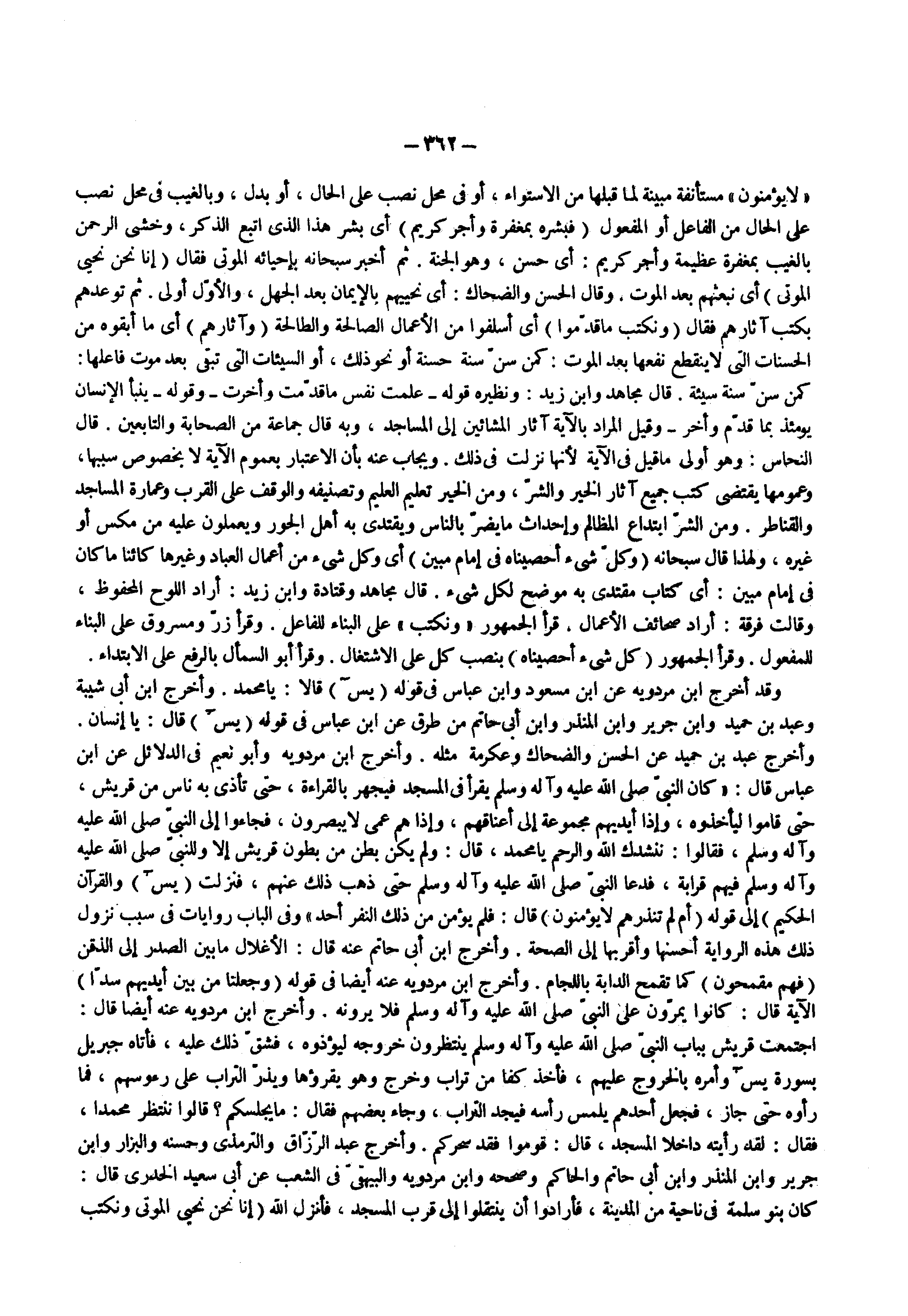 وقد أخرج ابن مردويه عن ابن مسعود وابن عباس قوله ) يس ( قالا يا محمد وأخرج ابن أبى شيبة وعبد بن حميد وابن جرير وابن المنذر وابن أبى حاتم من طرق عن ابن عباس فى قوله ) يس ( قال يا إنسان وأخرج عبد بن حميد عن الحسن والضحاك وعكرمة مثله وأخرج ابن مردويه وأبو نعيم فى الدلائل عن ابن عباس قال كان النبى ( صلى الله عليه وسلم ) يقرأ فى المسجد فيجهر بالقراءة حتى تأذى به ناس من قريش حتى قاموا ليأخذوه وإذا أيديهم مجموعة إلى أعناقهم وإذا هم عمى لا يبصرون فجاءوا إلى النبى ( صلى الله عليه وسلم ) فقالوا ننشدك الله والرحم يا محمد قال ولم يكن بطن من بطون قريش إلا وللنبى ( صلى الله عليه وسلم ) فيهم قرابة فدعا النبى ( صلى الله عليه وسلم ) حتى ذهب ذلك عنهم فنزلت ) يس ( ) والقرآن الحكيم ( إلى قوله ) أم لم تنذرهم لا يؤمنون ( قال فلم يؤمن من ذلك النفر أحد وفى الباب روايات فى سبب نزول ذلك هذه الرواية أحسنها وأقربها إلى الصحة وأخرج ابن أبى حاتم عنه قال الأغلال ما بين الصدر إلى الذقن ) فهم مقمحون ( كما تقمح الدابة باللجام وأخرج ابن مردويه عنه أيضا فى قوله ) وجعلنا من بين أيديهم سدا ( الآية قال كانوا يمرون على النبى ( صلى الله عليه وسلم ) فلا يرونه وأخرج ابن مردويه عنه أيضا قال اجتمعت قريش بباب النبى ( صلى الله عليه وسلم ) ينتظرون خروجه ليؤذوه فشق ذلك عليه فأتاه جبريل بسورة يس وأمره بالخروج عليهم فأخذ كفا من تراب وخرج وهو يقرؤها ويذر التراب على رءوسهم فما رأوه حتى جاز فجعل أحدهم يلمس رأسه فيجد التراب وجاء بعضهم فقال ما يجلسكم قالوا ننتظر محمدا فقال لقد رأيته داخلا المسجد قال قوموا فقد سحركم وأخرج عبد الرزاق والترمذى وحسنه والبزار وابن جرير وابن المنذر وابن أبى حاتم والحاكم وصححه وابن مردويه والبيهقى فى الشعب عن أبى سعيد الخدرى قال كان بنو سلمة فى ناحية من المدينة فأرادوا أن ينتقلوا إلى قرب المسجد فأنزل الله ) إنا نحن نحيي الموتى ونكتب ما قدموا وآثارهم (