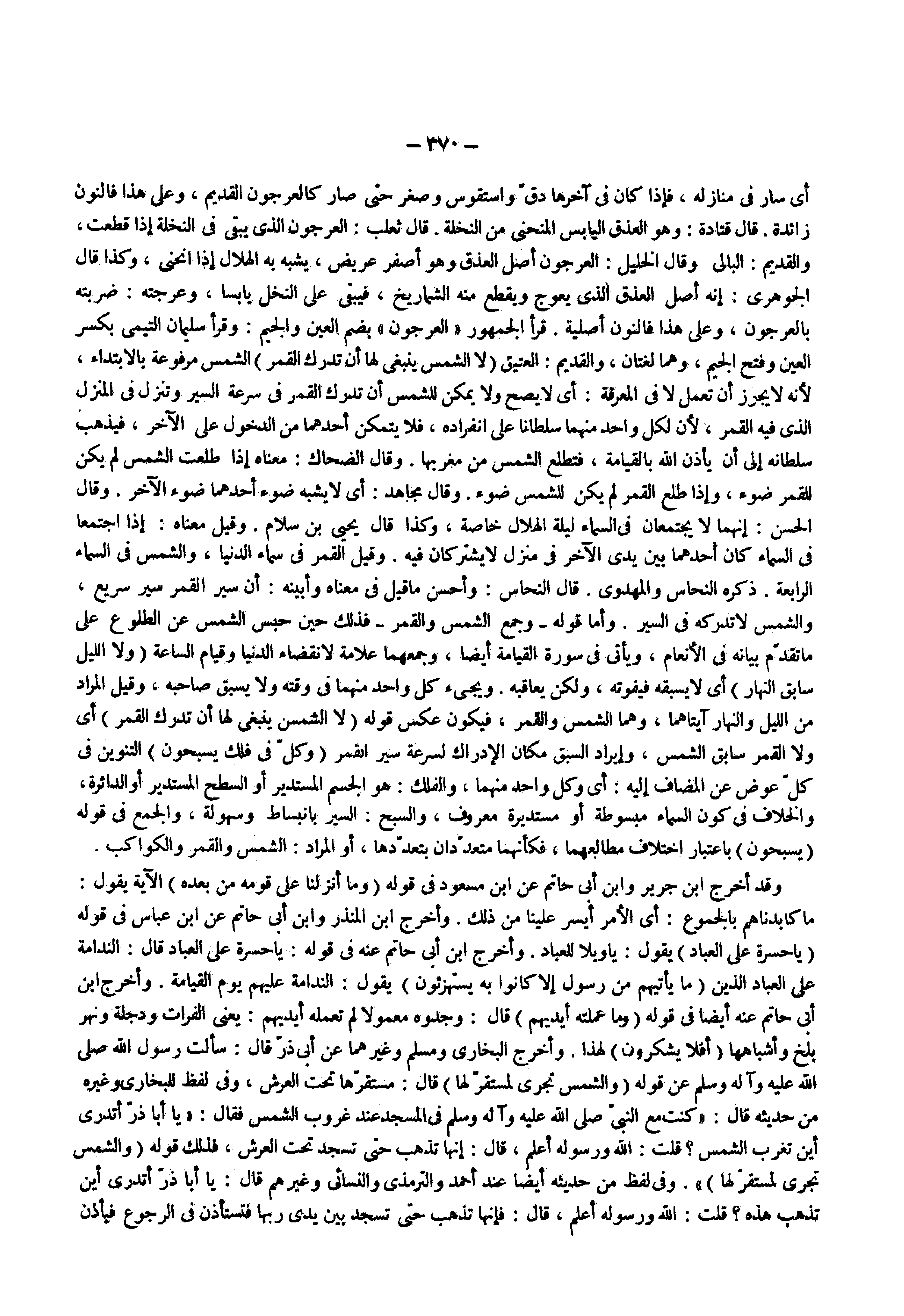 وقد أخرج ابن جرير وابن أبى حاتم عن ابن مسعود فى قوله ) وما أنزلنا على قومه من بعده ( الآية يقول ما كابدناهم بالجموع أى الأمر أيسر علينا من ذلك وأخرج ابن المنذر وابن أبى حاتم عن ابن عباس فى قوله ) يا حسرة على العباد ( يقول يا ويلا للعباد وأخرج ابن أبى حاتم عنه فى قوله يا حسرة على العباد قال الندامة على العباد الذين ) وما يأتيهم من رسول إلا كانوا به يستهزؤون ( يقول الندامة عليهم يوم القيامة وأخرج ابن أبى حاتم عنه أيضا فى قوله ) وما عملته أيديهم ( قال وجدوه معمولا لم تعمله أيديهم يعنى الفرات ودجلة ونهر بلخ وأشباهها ) أفلا يشكرون ( لهذا وأخرج البخارى ومسلم وغيرهما عن أبى ذر قال سألت رسول الله ( صلى الله عليه وسلم ) عن قوله ) والشمس تجري لمستقر لها ( قال مستقرها تحت العرش وفى لفظ للبخارى وغيره من حديثه قال كنت مع النبى ( صلى الله عليه وسلم ) فى المسجد عند غروب الشمس فقال يا أبا ذر أتدرى أين تغرب الشمس قلت الله ورسوله أعلم قال إنها تذهب حتى تسجد تحت العرش فذلك قوله ) والشمس تجري لمستقر لها ( وفى لفظ من حديثه أيضا عند أحمد والترمذي والنسائى وغيرهم قال يا أبا ذر أتدرى أين تذهب هذه قلت الله ورسوله أعلم قال فإنها تذهب حتى تسجد بين يدى ربها فتستأذن فى الرجوع فيأذن