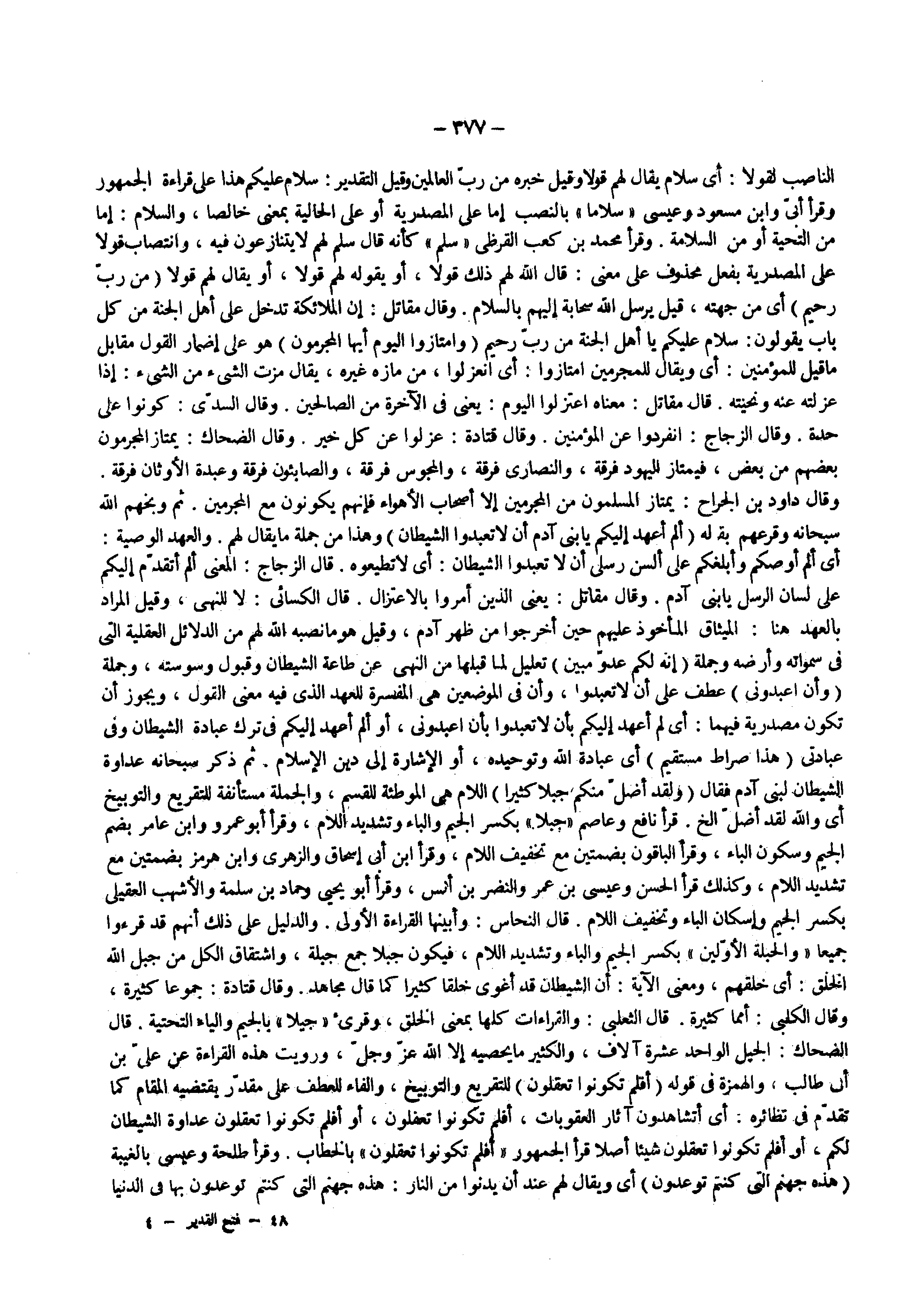 ثم ذكر سبحانه عداوة الشيطان لبنى آدم فقال ) ولقد أضل منكم جبلا كثيرا ( اللام هى الموطئة للقسم والجملة مستأنفة للتقريع والتوبيخ أى والله لقد أضل الخ قرأ نافع وعاصم جبلا بكسر الجيم والباء وتشديد اللام وقرأ أبو عمرو وابن عامر بضم الجيم وسكون الباء وقرأ الباقون بضمتين مع تخفيف اللام وقرأ ابن أبى إسحاق والزهرى وابن هرمز بضمتين مع تشديد اللام وكذلك قرأ الحسن وعيسى بن عمر والنضر بن أنس وقرأ أبو يحيى وحماد بن سلمة والأشهب العقيلى بكسر الجيم وإسكان الباء وتخفيف اللام قال النحاس وأبينها القراءة الأولى والدليل على ذلك أنهم قد قرءوا جميعا والجبلة الأولين بكسر الجيم والباء وتشديد اللام فيكون جبلا جمع جبلة واشتقاق الكل من جبل الله الخلق أى خلقهم ومعنى الآية أن الشيطان قد أغوى خلقا كثيرا كما قال مجاهد وقال قتادة جموعا كثيرة وقال الكلبى أمما كثيرة قال الثعلبى والقراءات كلها بمعنى الخلق وقرىء جيلا بالجيم والياء التحتية قال الضحاك الجيل الواحد عشرة آلاف والكثير ما يحصيه إلا الله عز وجل ورويت هذه القراءة عن على بن أبى طالب والهمزة فى قوله ? فلم تكونوا تعقلون ? للتقريع والتوبيخ والفاء للعطف على مقدر يقتضيه المقام كما تقدم فى نظائره أى أتشاهدون آثار العقوبات أفلم تكونوا تعقلون أو أفلم تكونوا تعقلون عداوة الشيطان لكم أو أفلم تكونوا تعقلون شيئا أصلا قرأ الجمهور ) أفلم تكونوا تعقلون ( بالخطاب وقرأ طلحة وعيسى بالغيبة