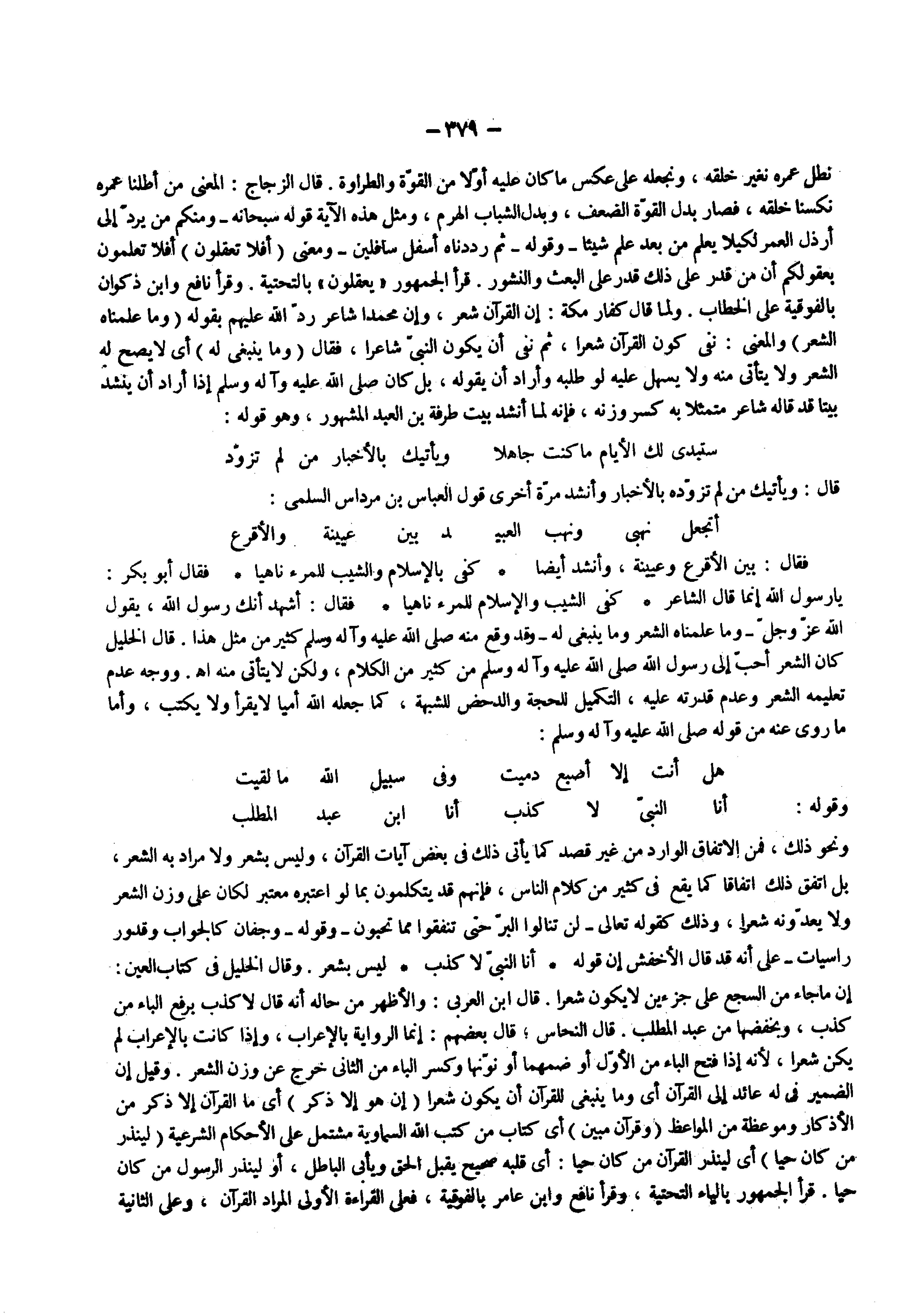ونحو ذلك فمن الاتفاق الوارد من غير قصد كما يأتى ذلك فى بعض آيات القرآن وليس بشعر ولا مراد به الشعر بل اتفق ذلك اتفاقا كما يقع فى كثير من كلام الناس فإنهم قد يتكلمون بما لو اعتبره معتبر لكان على وزن الشعر ولا يعدونه شعرا وذلك كقوله تعالى ) لن تنالوا البر حتى تنفقوا مما تحبون ( وقوله ) وجفان كالجواب وقدور راسيات ( على أنه قد قال الأخفش إن قوله أنا النبى لا كذب ليس بشعر وقال الخليل فى كتاب العين إن ما جاء من السجع على جزءين لا يكون شعرا قال ابن العربى والأظهر من حاله أنه قال لا كذب برفع الباء من كذب وبخفضها من عبد المطلب قال النحاس قال بعضهم إنما الرواية بالإعراب وإذا كانت بالإعراب لم يكن شعرا لأنه إذا فتح الباء من الأول أو ضمهما أو نونها وكسر الباء من الثانى خرج عن وزن الشعر وقيل إن الضمير فى له عائد إلى القرآن أى وما ينبغى للقرآن أن يكون شعرا ) إن هو إلا ذكر ( أى ما القرآن إلا ذكر من الأذكار وموعظة من المواعظ ) وقرآن مبين ( أى كتاب من كتب الله السماوية مشتمل على الأحكام الشرعية