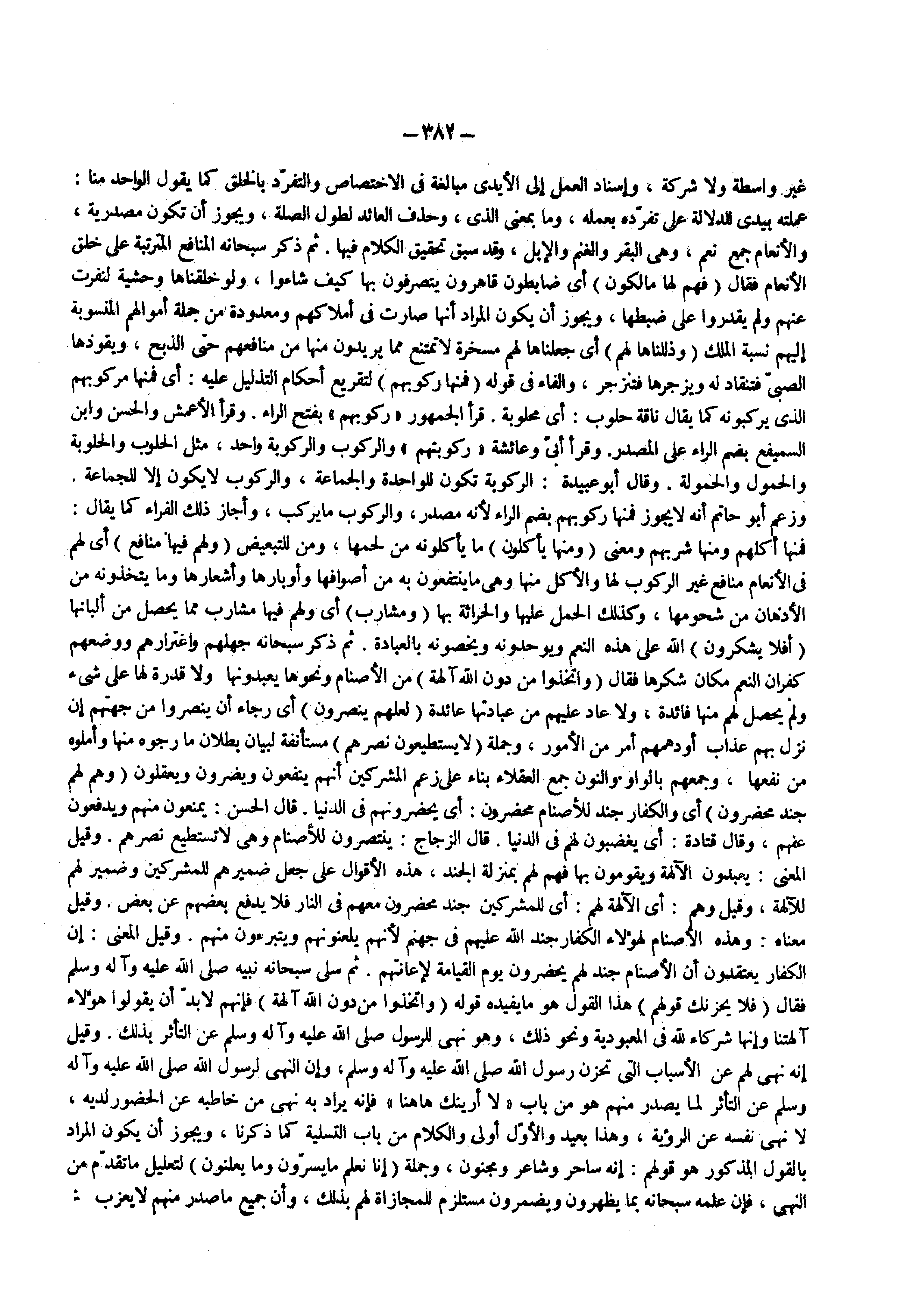 ) ولهم فيها منافع ( أى لهم فى الأنعام منافع غير الركوب لها والأكل منها وهى ما ينتفعون به من أصوافها وأوبارها وأشعارها وما يتخذونه من الأدهان من شحومها وكذلك الحمل عليها والحراثة بها ) ومشارب ( أى ولهم فيها مشارب مما يحصل من ألبانها ) أفلا يشكرون ( الله على هذه النعم ويوحدونه ويخصونه بالعبادة