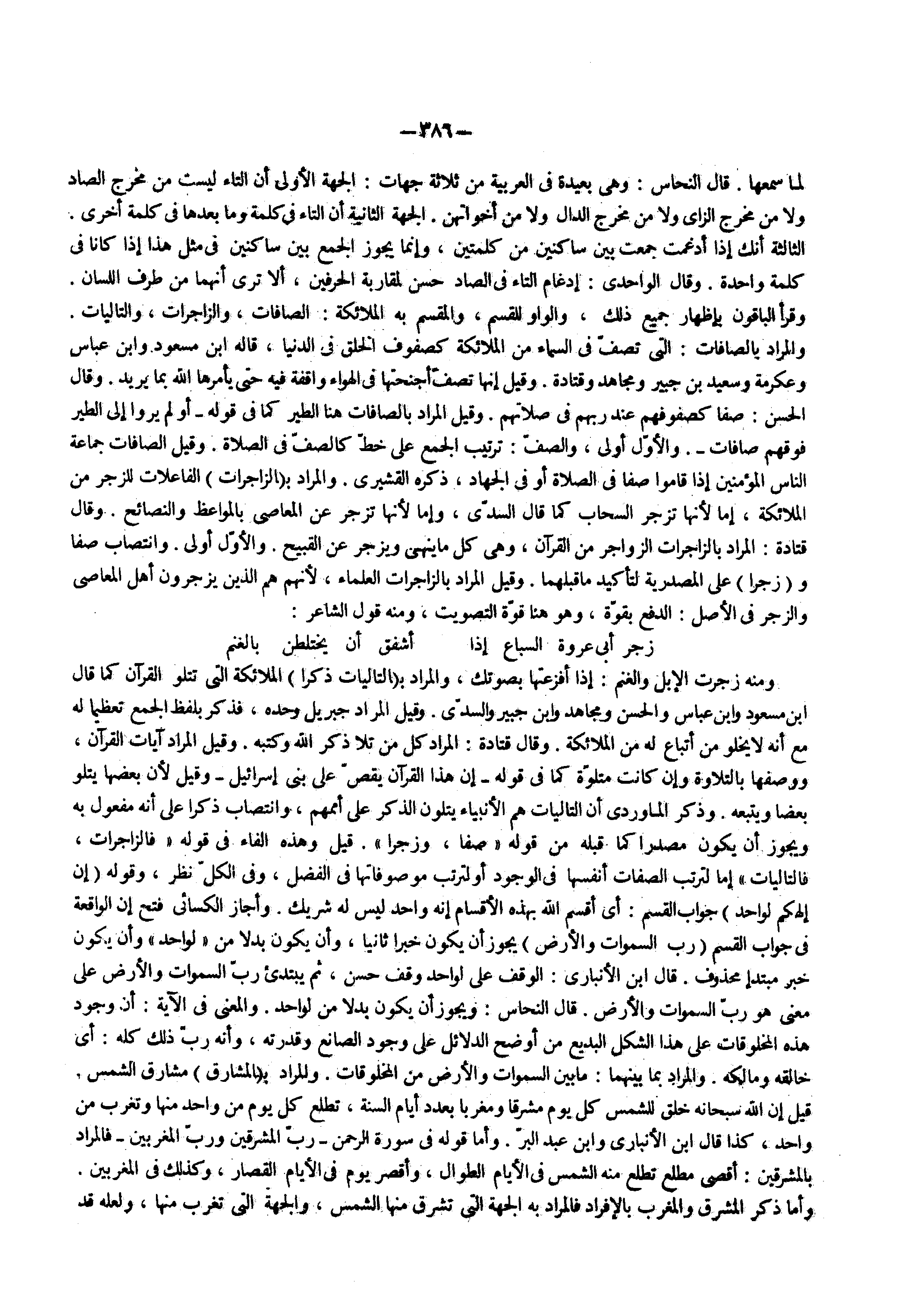 لما سمعها قال النحاس وهى بعيدة فى العربية من ثلاث جهات الجهة الأولى أن التاء ليست من مخرج الصاد ولا من مخرج الزاى ولا من مخرج الدال ولا من أخواتهن الجهة الثانية أن التاء فى كلمة وما بعدها فى كلمة أخرى الثالثة أنك إذا أدغمت جمعت بين ساكنين من كلمتين وإنما يجوز الجمع بين ساكنين فى مثل هذا إذا كانا فى كلمة واحدة وقال الواحدى إدغام التاء فى الصاد حسن لمقاربة الحرفين ألا ترى أنهما من طرف اللسان وقرأ الباقون بإظهار جميع ذلك والواو للقسم والمقسم به الملائكة الصافات والزاجرات والتاليات والمراد بالصافات التى تصف فى السماء من الملائكة كصفوف الخلق فى الدنيا قاله ابن مسعود وابن عباس وعكرمة وسعيد بن جبير ومجاهد وقتادة وقيل إنها تصف أجنحتها فى الهواء واقفة فيه حتى يأمرها الله بما يريد وقال الحسن صفا كصفوفهم عند ربهم فى صلاتهم وقيل المراد بالصافات هنا الطير كما فى قوله ) أولم يروا إلى الطير فوقهم صافات ( والأول أولى والصف ترتيب الجمع على خط كالصف فى الصلاة وقيل الصافات جماعة الناس المؤمنين إذا قاموا صفا فى الصلاة أو فى الجهاد ذكره القشيرى