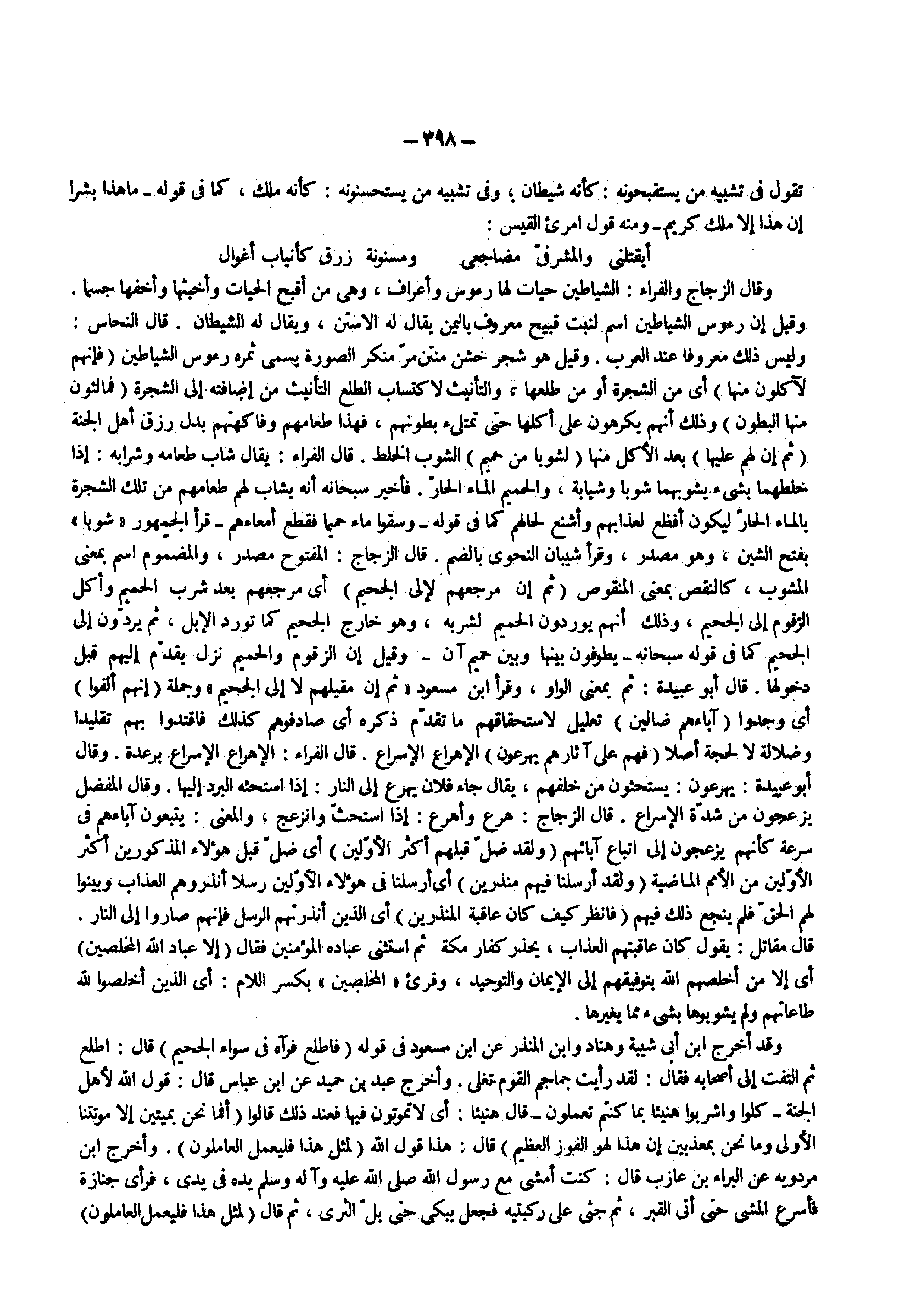 وقال الزجاج والفراء الشياطين حيات لها رءوس وأعراف وهى من أقبح الحيات وأخبثها وأخفها جسما وقيل إن رءوس الشياطين اسم لنبت قبيح معروف باليمن يقال له الاستن ويقال له الشيطان قال النحاس وليس ذلك معروفا عند العرب وقيل هو شجر خشن منتن مر منكر الصورة يسمى ثمره رءوس الشياطين