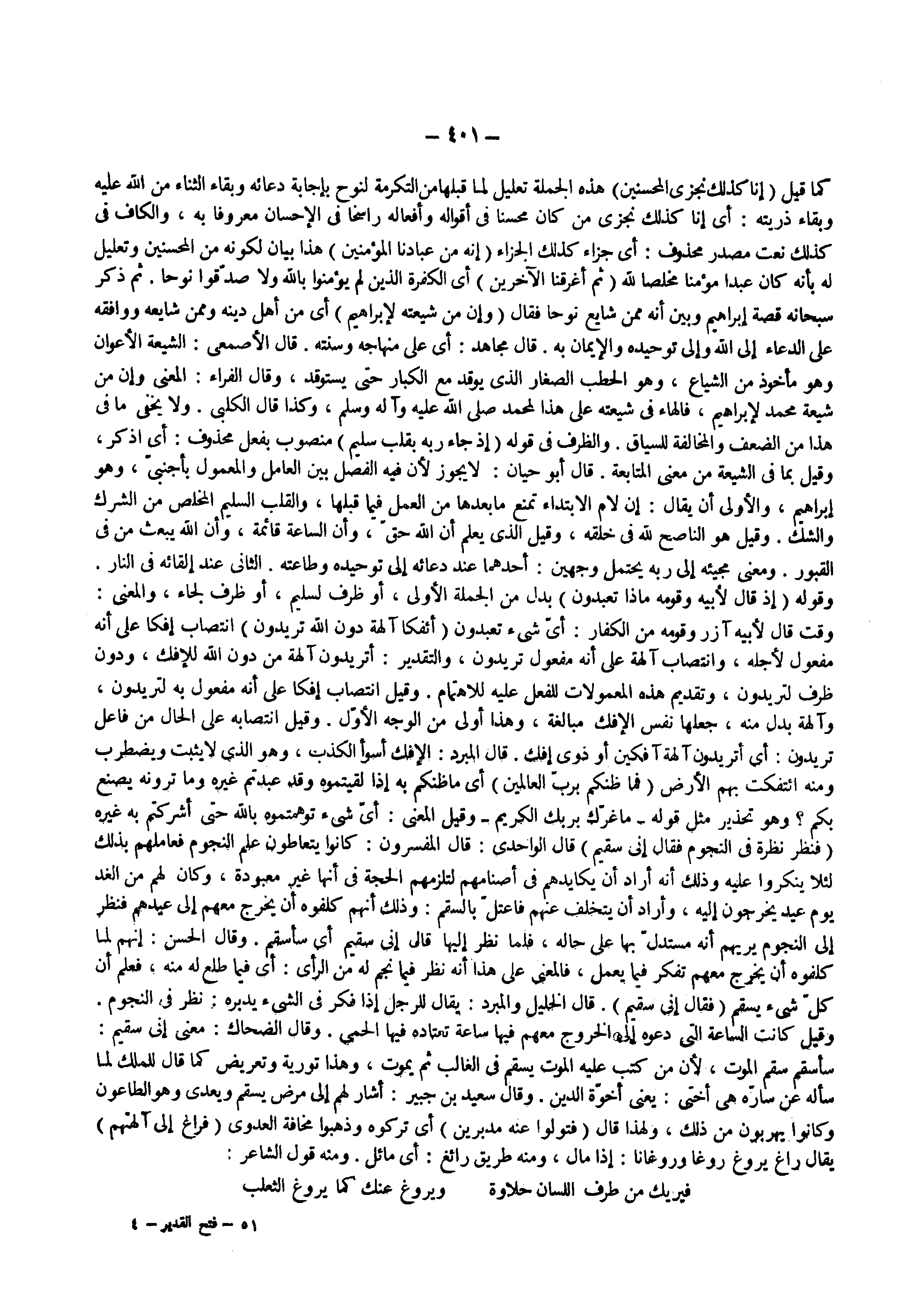 ) فنظر نظرة في النجوم فقال إني سقيم ( ) قال الواحدى قال المفسرون كانوا يتعاطون علم النجوم فعاملهم بذلك لئلا ينكروا عليه وذلك أنه أراد أن يكايدهم فى أصنامهم لتلزمهم الحجة فى أنها غير معبودة وكان لهم من الغد يوم عيد يخرجون إليه وأراد أن يتخلف عنهم فاعتل بالسقم وذلك أنهم كلفوه أن يخرج معهم إلى عيدهم فنظر إلى النجوم يريهم أنه مستدل بها على حاله فلما نظر إليها قال إنى سقيم أي سأسقم وقال الحسن إنهم لما كلفوه أن يخرج معهم تفكر فيما يعمل فالمعنى على هذا أنه نظر فيما نجم له من الرأى أي فيما طلع له منه فعلم أن كل شىء يسقم ) فقال إني سقيم ( قال الخليل والمبرد يقال للرجل إذا فكر فى الشىء يدبره نظر فى النجوم وقيل كانت الساعة التى دعوه إلى الخروج معهم فيها ساعة تعتاده فيها الحمى وقال الضحاك معنى إنى سقيم سأسقم سقم الموت لأن من كتب عليه الموت يسقم فى الغالب ثم يموت وهذا تورية وتعريض كما قال للملك لما سأله عن ساره هى أختى يعنى أخوة الدين وقال سعيد بن جبير أشار لهم إلى مرض يسقم ويعدى وهو الطاعون وكانوا يهربون من ذلك