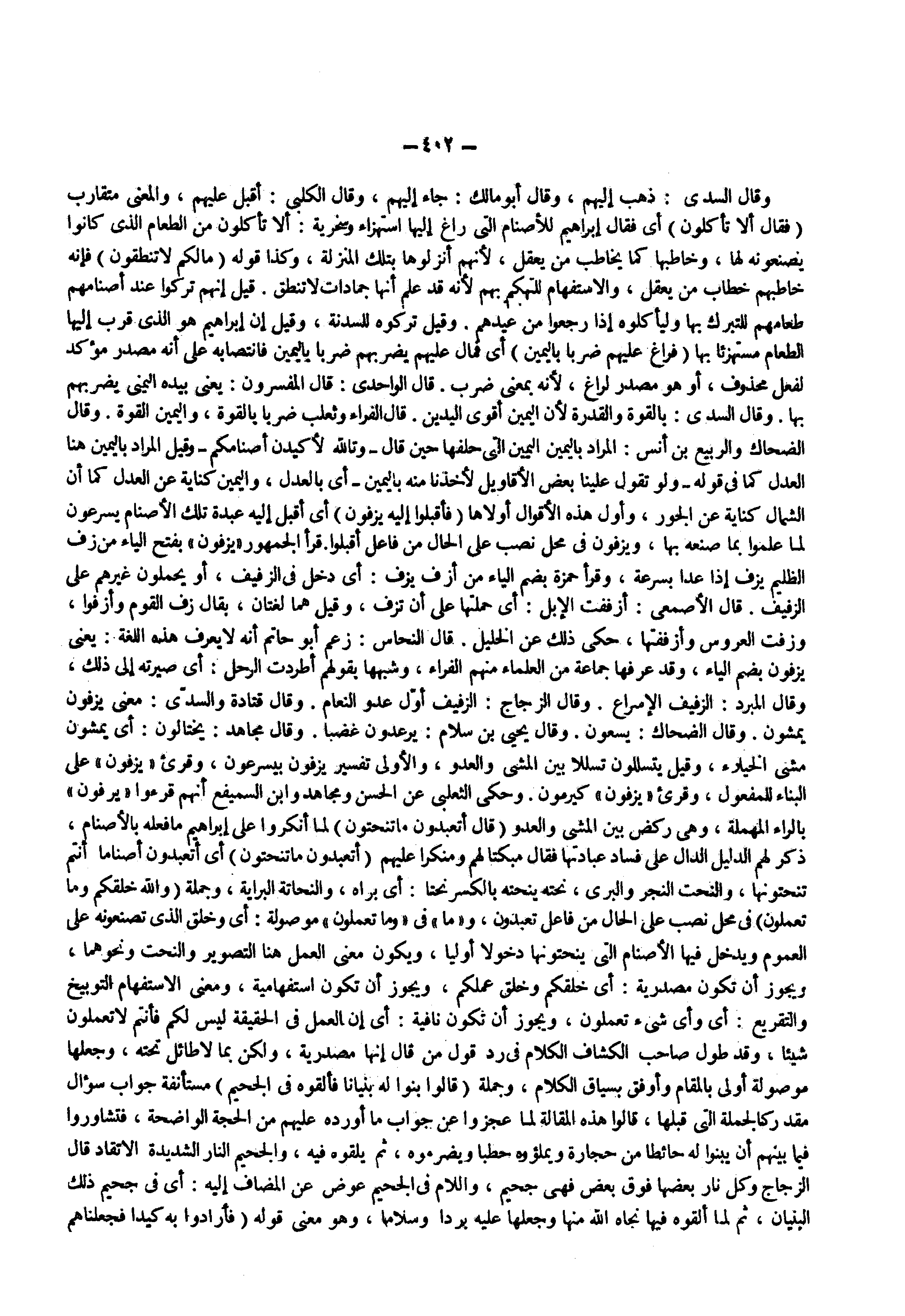 ) فأقبلوا إليه يزفون ( أى أقبل إليه عبدة تلك الأصنام يسرعون لما علموا بما صنعه بها ويزفون فى محل نصب على الحال من فاعل أقبلوا قرأ الجمهور يزفون بفتح الياء من زف الظليم يزف إذا عدا بسرعة وقرأ حمزة بضم الياء من أزف يزف أي دخل فى الزفيف أو يحملون غيرهم على الزفيف قال الأصمعى أزففت الإبل أى حملتها على أن تزف وقيل هما لغتان يقال زف القوم وأزفوا وزفت العروس وأزففتها حكى ذلك عن الخليل قال النحاس زعم أبو حاتم أنه لا يعرف هذه اللغة يعنى يزفون بضم الياء وقد عرفها جماعة من العلماء منهم الفراء وشببها بقولهم أطردت الرحل أي صيرته إلى ذلك وقال المبرد الزفيف الإسراع وقال الزجاج الزفيف أول عدو النعام وقال قتادة والسدى معنى يزفون يمشون وقال الضحاك يسعون وقال يحيى بن سلام يرعدون غضبا وقال مجاهد يختالون أى يمشون مشى الخيلاء وقيل يتسللون تسللا بين المشى والعدو والأولى تفسير يزفون بيسرعون وقرىء يزفون على البناء للمفعول وقرىء يزفون كيرمون وحكى الثعلبى عن الحسن ومجاهد وابن السميفع أنهم قرءوا يرفون بالراء المهملة وهى ركض بين المشى والعدو