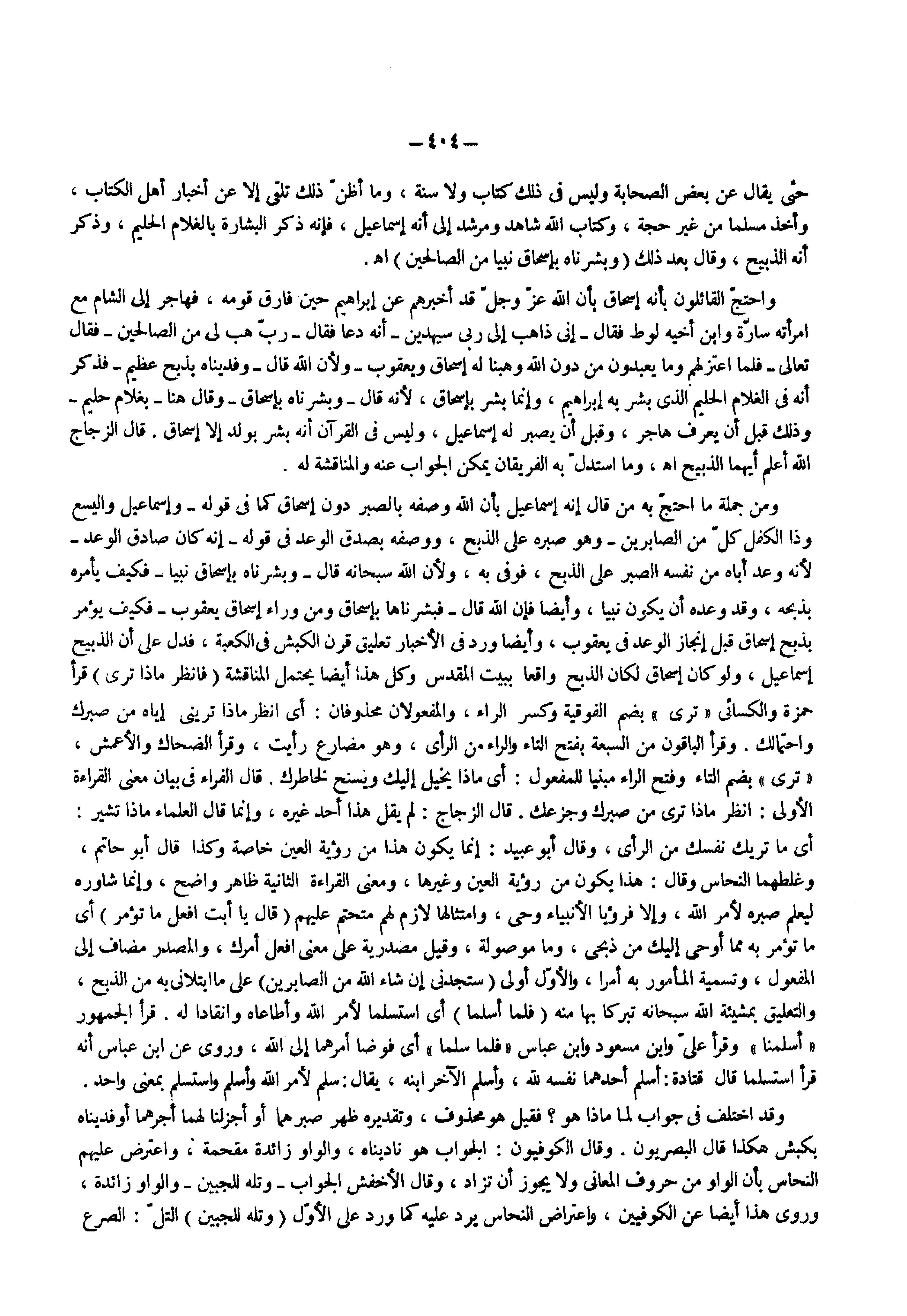 حتى يقال عن بعض الصحابة وليس فى ذلك كتاب ولا سنة وما أظن ذلك تلقى إلا عن أخبار أهل الكتاب وأخذ مسلما من غير حجة وكتاب الله شاهد ومرشد إلى أنه إسماعيل فإنه ذكر البشارة بالغلام الحليم وذكر أنه الذبيح وقال بعد ذلك ) وبشرناه بإسحاق نبيا من الصالحين (