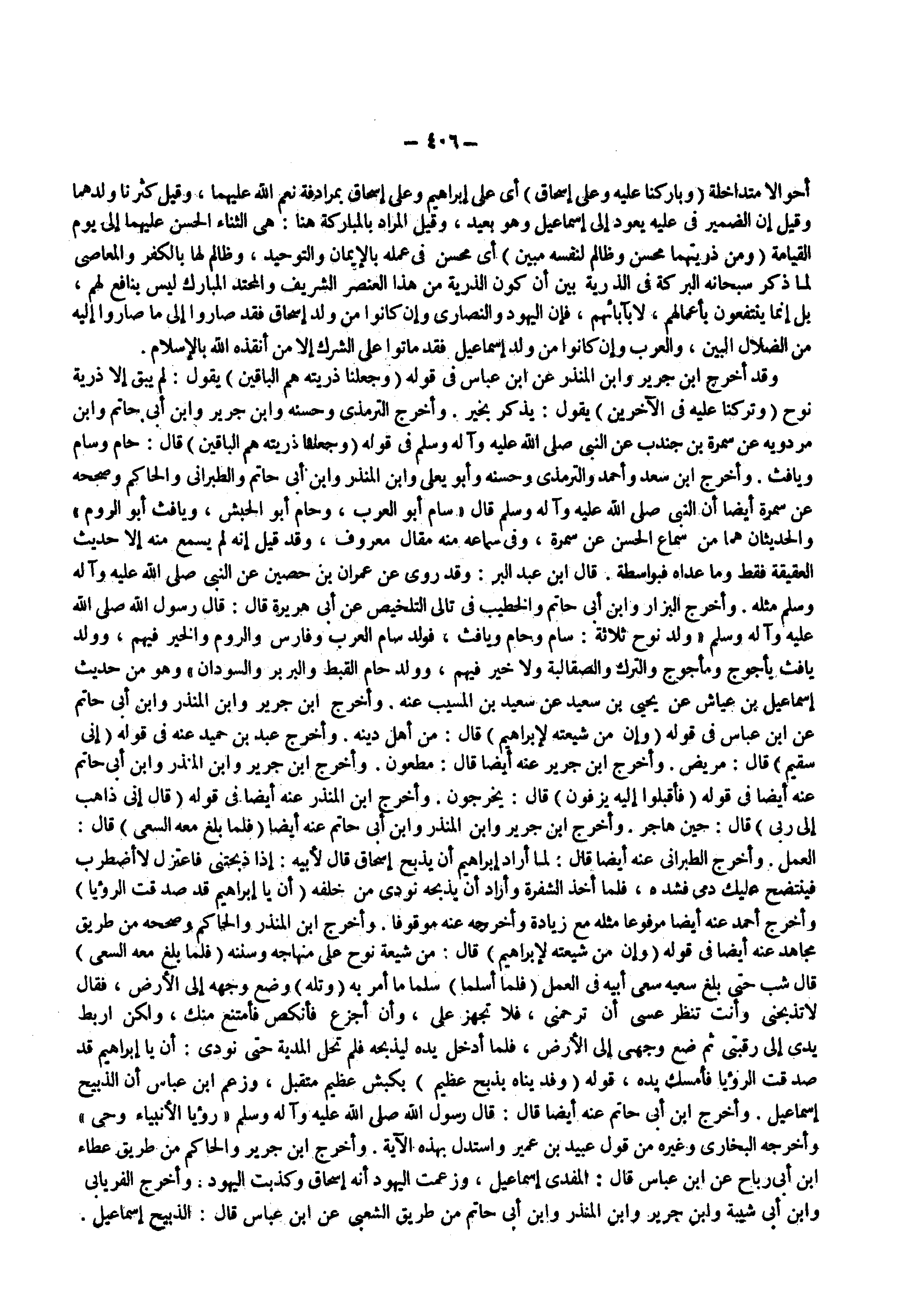 وقد أخرج ابن جرير وابن المنذر عن ابن عباس فى قوله ) وجعلنا ذريته هم الباقين ( يقول لم يبق إلا ذرية نوح ) وتركنا عليه في الآخرين ( يقول يذكر بخير وأخرج الترمذى وحسنة وابن جرير وابن أبى حاتم وابن مردويه عن سمرة بن جندب عن النبى ( صلى الله عليه وسلم ) فى قوله ) وجعلنا ذريته هم الباقين ( قال حام وسام ويافث وأخرج ابن سعد وأحمد والترمذى وحسنة وأبو يعلى وابن المنذر وابن أبى حاتم والطبرانى والحاكم وصححه عن سمرة أيضا أن النبى صى الله عليه وآله وسلم قال سام أبو العرب وحام أبو الحبش ويافث أبو الروم والحديثان هما من سماع الحسن عن سمرة وفى سماعه منه مقال معروف وقد قيل إنه لم يسمع منه إلا حديث العقيقة فقط وما عداه فبواسطة قال ابن عبد البر وقد روى عن عمران بن حصين عن النبى ( صلى الله عليه وسلم ) مثله وأخرج البزار وابن أبى حاتم والخطيب فى تالى التلخيص عن أبى هريرة قال قال رسول الله ( صلى الله عليه وسلم ) ولد نوح ثلاثة سام وحام ويافث فولد سام العرب وفارس والروم والخير فيهم وولد يافث يأجوج ومأجوج والترك والصقالبة ولا خير فيهم وولد حام القبط والبربر والسودان وهو من حديث إسماعيل بن عياش عن يحيى بن سعيد عن سعيد بن المسيب عنه وأخرج ابن جرير وابن المنذر وابن أبى حاتم عن ابن عباس فى قوله ) وإن من شيعته لإبراهيم ( قال من أهل دينه وأخرج عبد بن حميد عنه فى قوله ) إني سقيم ( قال مريض وأخرج ابن جرير عنه أيضا قال مطعون وأخرج ابن جرير وابن المنذر وابن أبى حاتم عنه أيضا في قوله ) فأقبلوا إليه يزفون ( قال يخرجون وأخرج ابن المنذر عنه أيضا فى قوله ) وقال إني ذاهب إلى ربي ( قال حين هاجر وأخرج ابن جرير وابن المنذر وابن أبى حاتم عنه أيضا ) فلما بلغ معه السعي ( قال العمل وأخرج الطبرانى عنه أيضا قال لما أراد إبراهيم أن يذبح إسحاق قال لأبيه إذا ذبحتنى فاعتزل لا أضطرب فينتضح عليك دمى فشده فلما أخذ الشفرة وأراد أن يذبحه نودى من خلفه ) أن يا إبراهيم قد صدقت الرؤيا ( وأخرج أحمد عنه أيضا مرفوعا مثله مع زيادة وأخرجه عنه موقوفا وأخرج ابن المنذر والحاكم وصححه من طريق مجاهد عنه أيضا فى قوله ) وإن من شيعته لإبراهيم ( قال من شيعة نوح على منهاجه وسننه ) فلما بلغ معه السعي ( قال شب حتى بلغ سعيه سعى أبيه فى العمل ) فلما أسلما ( سلما ما أمر به ) وتله ( وضع وجهه إلى الأرض فقال لا تذبحنى وأنت تنظر عسى أن ترحمنى فلا تجهز على وأن أجزع فأنكص فأمتنع منك ولكن اربط يدى إلى رقبتى ثم ضع وجهى إلى الأرض فلما أدخل يده ليذبحه فلم تحل المدية حتى نودى أن يا إبراهيم قد صدقت الرؤيا فأمسك يده قوله ) وفديناه بذبح عظيم ( بكبش عظيم متقبل وزعم ابن عباس أن الذبيح إسماعيل وأخرج ابن أبى حاتم عنه أيضا قال قال رسول الله ( صلى الله عليه وسلم ) رؤيا الأنبياء وحى وأخرجه البخارى وغيره من قول عبيد بن عمير واستدل بهذه الآية وأخرج ابن جرير والحاكم من طريق عطاء ابن أبى رباح عن ابن عباس قال المفدى إسماعيل وزعمت اليهود أنه إسحاق وكذبت اليهود وأخرج الفريابى وابن أبى شيبة وابن جرير وابن المنذر وابن أبى حاتم من طريق الشعبى عن ابن عباس قال الذبيح إسماعيل