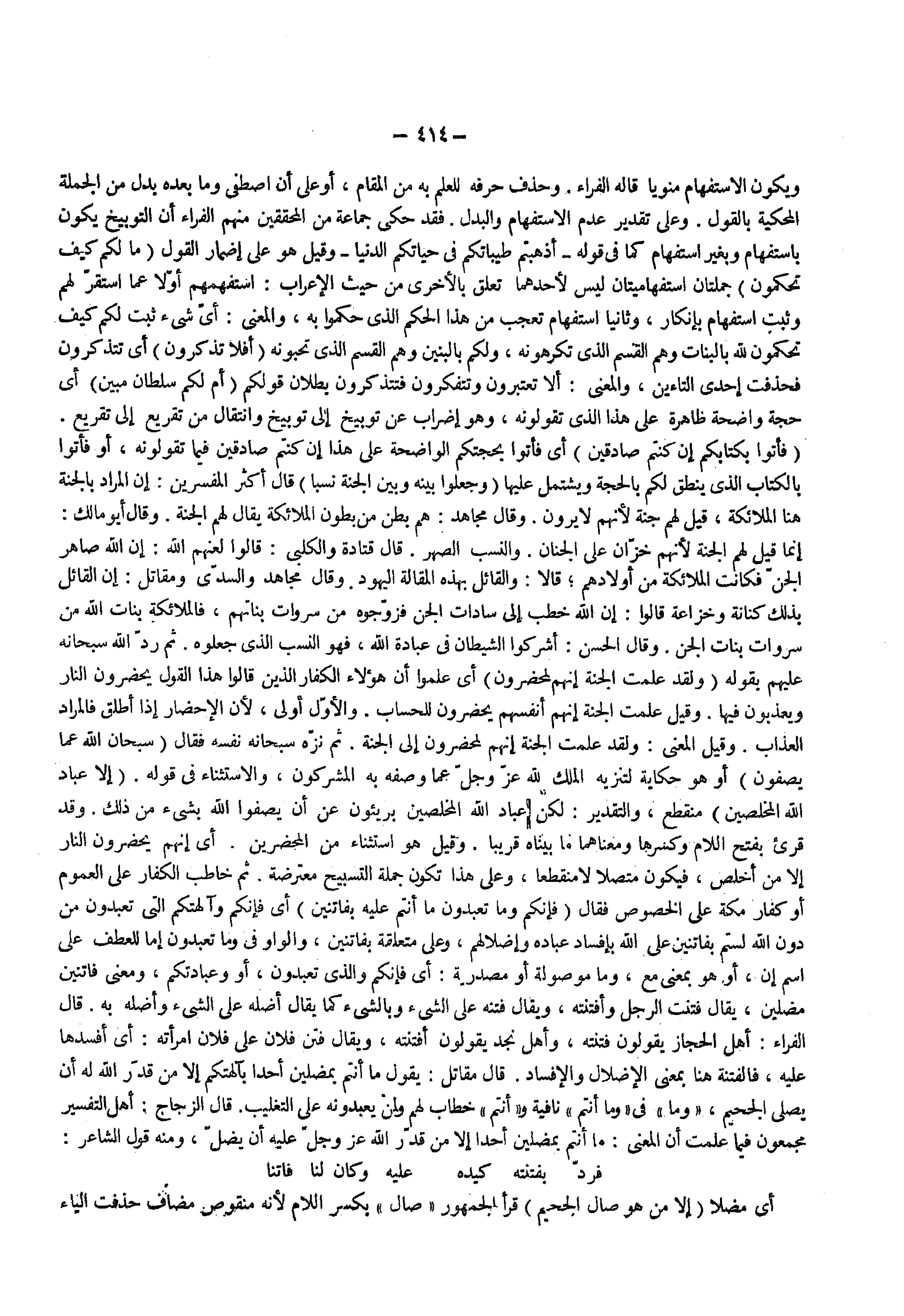 بالكتاب الذى ينطق لكم بالحجة ويشتمل عليها ) وجعلوا بينه وبين الجنة نسبا ( قال أكثر المفسرين إن المراد بالجنة هنا الملائكة قيل لهم جنة لأنهم لا يرون وقال مجاهد هم بطن من بطون الملائكة يقال لهم الجنة وقال أبو مالك إنما قيل لهم الجنة لأنهم خزان على الجنان والنسب الصهر قال قتادة والكلبى قالوا لعنهم الله إن الله صاهر الجن فكانت الملائكة من أولادهم قالا والقائل بهذه المقالة اليهود وقال مجاهد والسدى ومقاتل إن القائل بذلك كنانة وخزاعة قالوا إن الله خطب إلى سادات الجن فزوجوه من سروات بناتهم فالملائكة بنات الله من سروات بنات الجن وقال الحسن أشركوا الشيطان فى عبادة الله فهو النسب الذى جعلوه