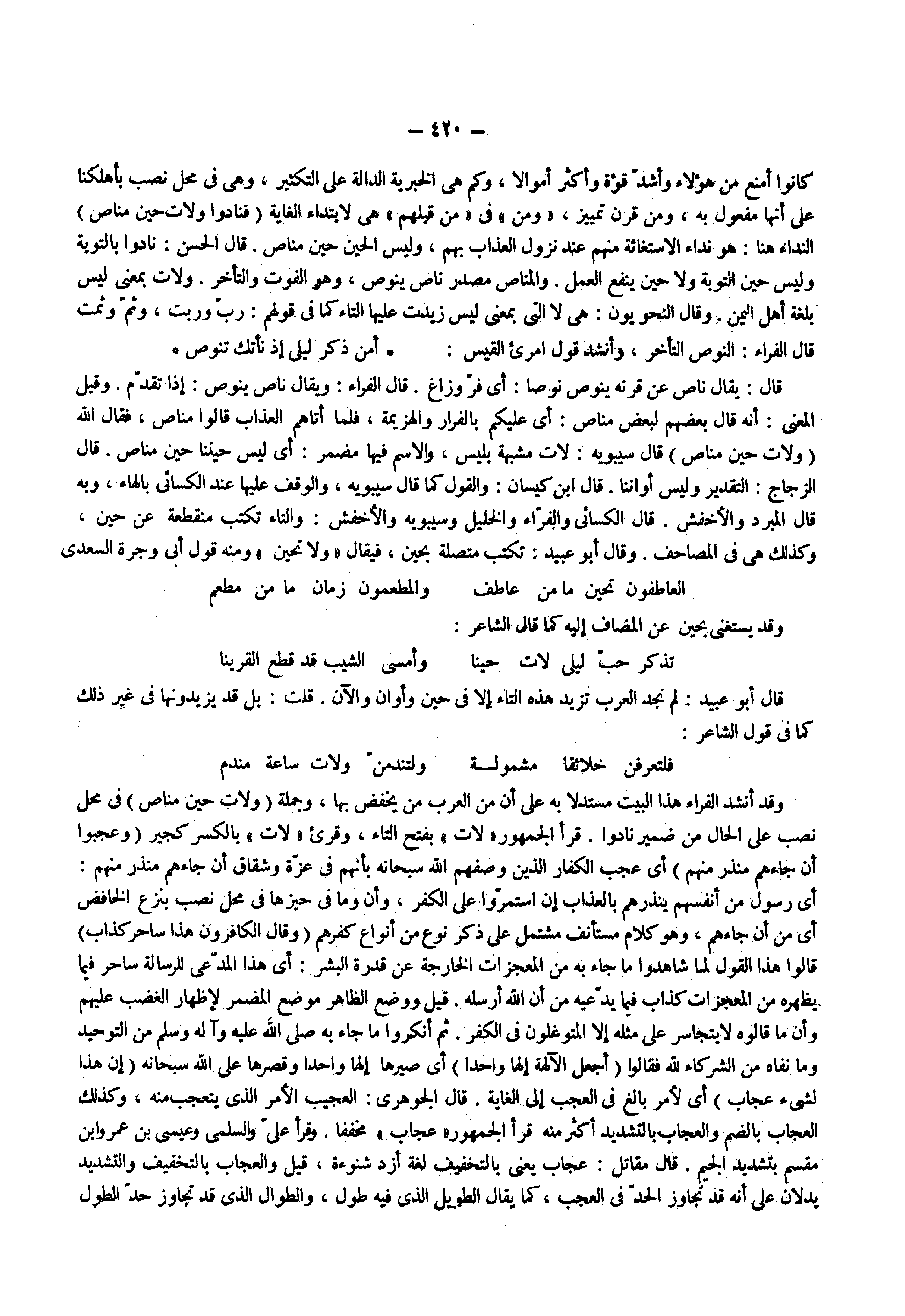 قال يقال ناص عن قرنه ينوص نوصا أي فر وزاغ قال الفراء ويقال ناص ينوص إذا تقدم وقيل المعنى أنه قال بعضهم لبعض مناص أى عليكم بالفرار والهزيمة فلما أتاهم العذاب قالوا مناص فقال الله ) ولات حين مناص ( قال سيبويه لات مشبهة بليس والاسم فيها مضمر أى ليس حيننا حين مناص قال الزجاج التقدير وليس أواننا قال ابن كيسان والقول كما قال سيبويه والوقف عليها عند الكسائى بالهاء وبه قال المبرد والأخفش قال الكسائى والفراء والخليل وسيبويه والأخفش والتاء تكتب منقطعة عن حين وكذلك هى في المصاحف وقال أبو عبيد تكتب متصلة بحين فيقال ولا تحين ومنه قول أبى وجرة السعدى