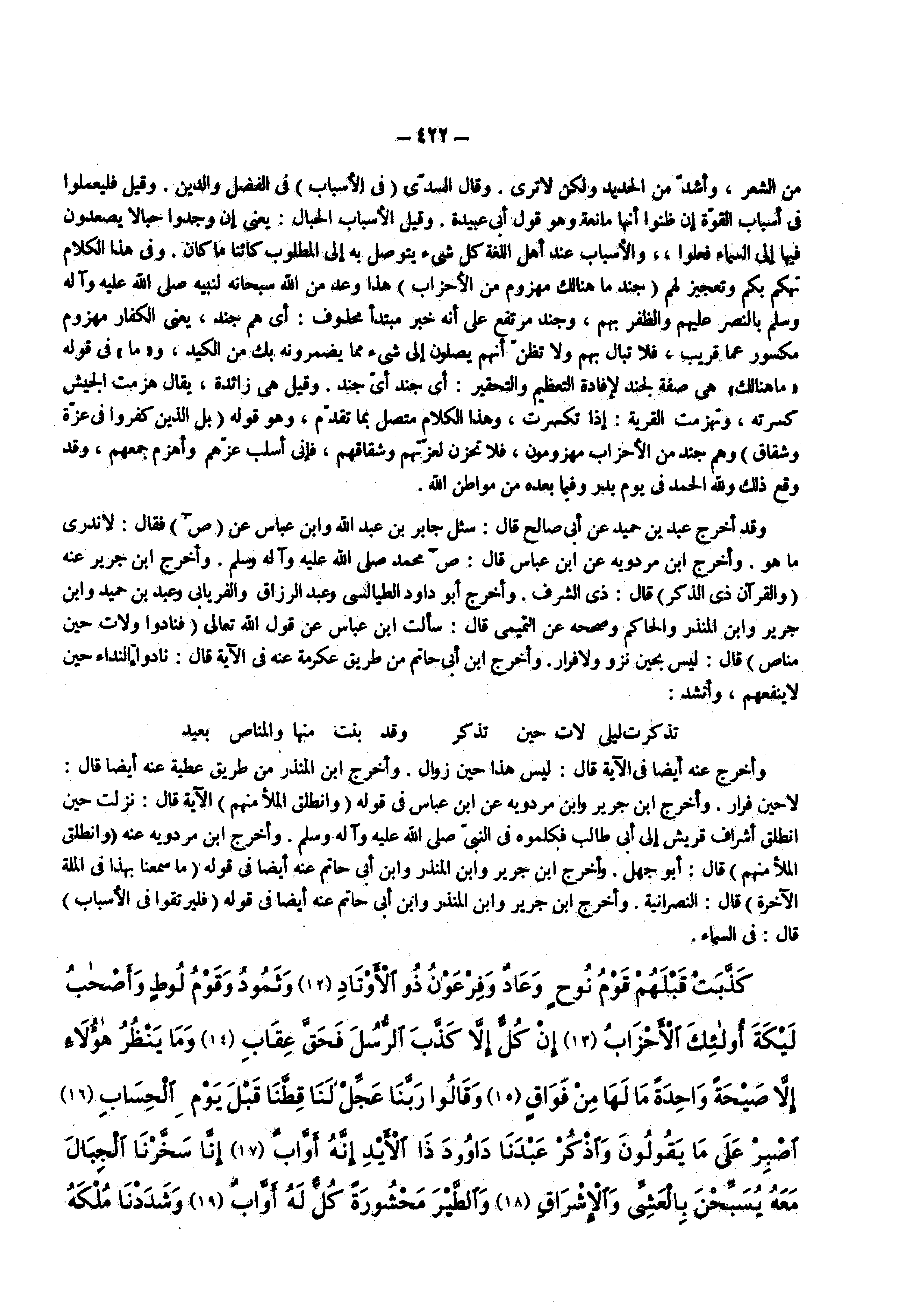 وقد أخرج عبد بن حميد عن أبى صالح قال سئل جابر بن عبد الله وابن عباس عن ) ص ( فقال لا ندرى ما هو وأخرج ابن مردويه عن ابن عباس قال ص محمد ( صلى الله عليه وسلم ) وأخرج ابن جرير عنه ) والقرآن ذي الذكر ( قال ذى الشرف وأخرج أبو داود الطيالسى وعبد الرزاق والفريابى وعبد بن حميد وابن جرير وابن المنذر والحاكم وصححه عن التميمى قال سألت ابن عباس عن قول الله تعالى ) فنادوا ولات حين مناص ( قال ليس بحين نزو ولا فرار وأخرج ابن أبى حاتم من طريق عكرمة عنه فى الآية قال نادوا النداء حين لا ينفعهم وأنشد تذكرت ليلى لات حين تذكر