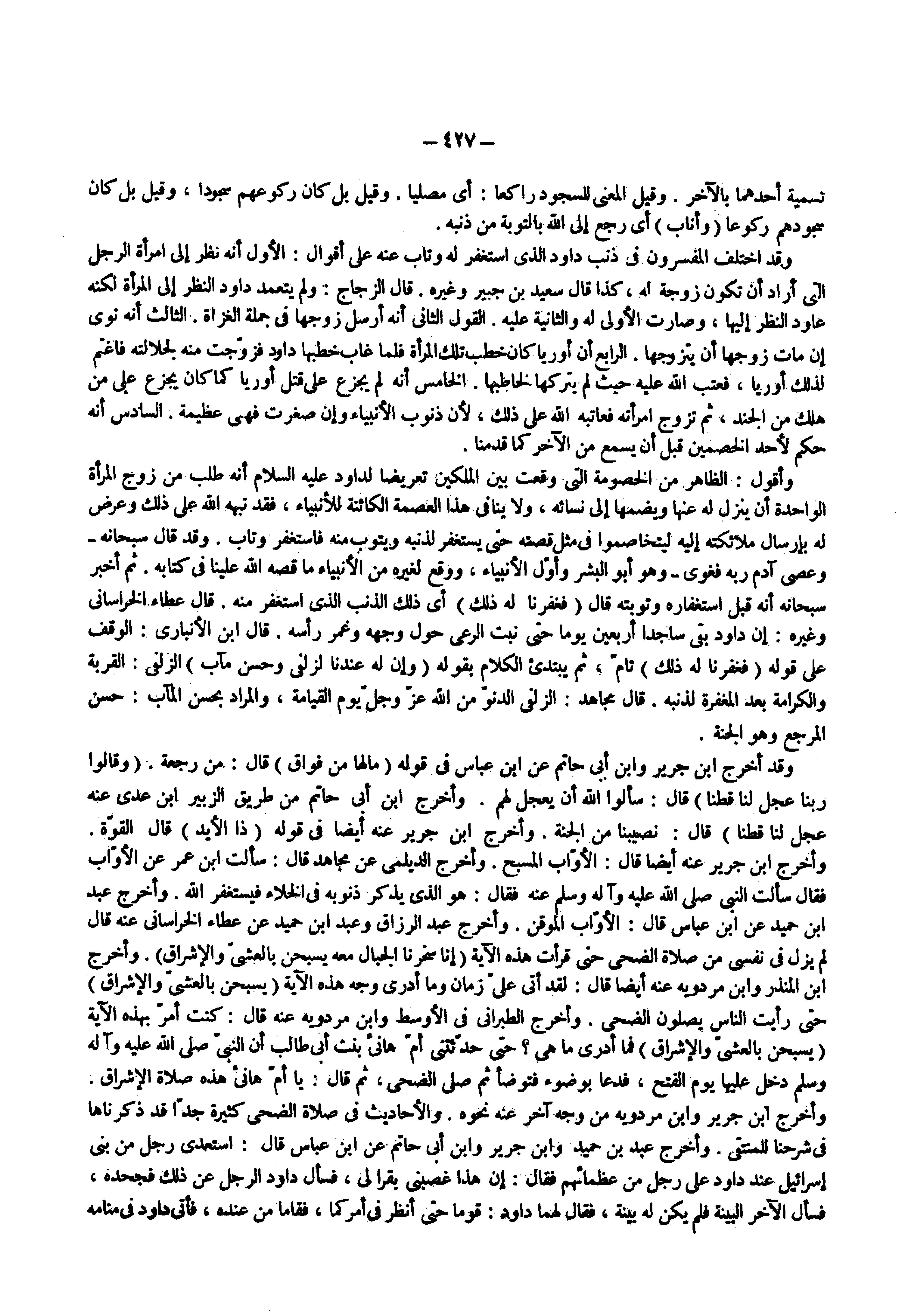 وقد اختلف المفسرون فى ذنب داود الذى استغفر له وتاب عنه على أقوال الأول أنه نظر إلى امرأة الرجل التى أراد أن تكون زوجة له كذا قال سعيد بن جبير وغيره قال الزجاج ولم يتعمد داود النظر إلى المرأة لكنه عاود النظر إليها وصارت الأولى له والثانية عليه القول الثانى أنه أرسل زوجها فى جملة الغزاة الثالث أنه نوى إن مات زوجها أن يتزوجها الرابع أن أوريا كان خطب تلك المرأة فلما غاب خطبها داود فزوجت منه لجلالته فاغتم لذلك أوريا فعتب الله عليه حيث لم يتركها لخاطبها الخامس أنه لم يجزع على قتل أوريا كما كان يجزع على من هلك من الجند ثم تزوج امرأته فعاتبه الله على ذلك لأن ذنوب الأنبياء وإن صغرت فهى عظيمة السادس أنه حكم لأحد الخصمين قبل أن يسمع من الآخر كما قدمنا