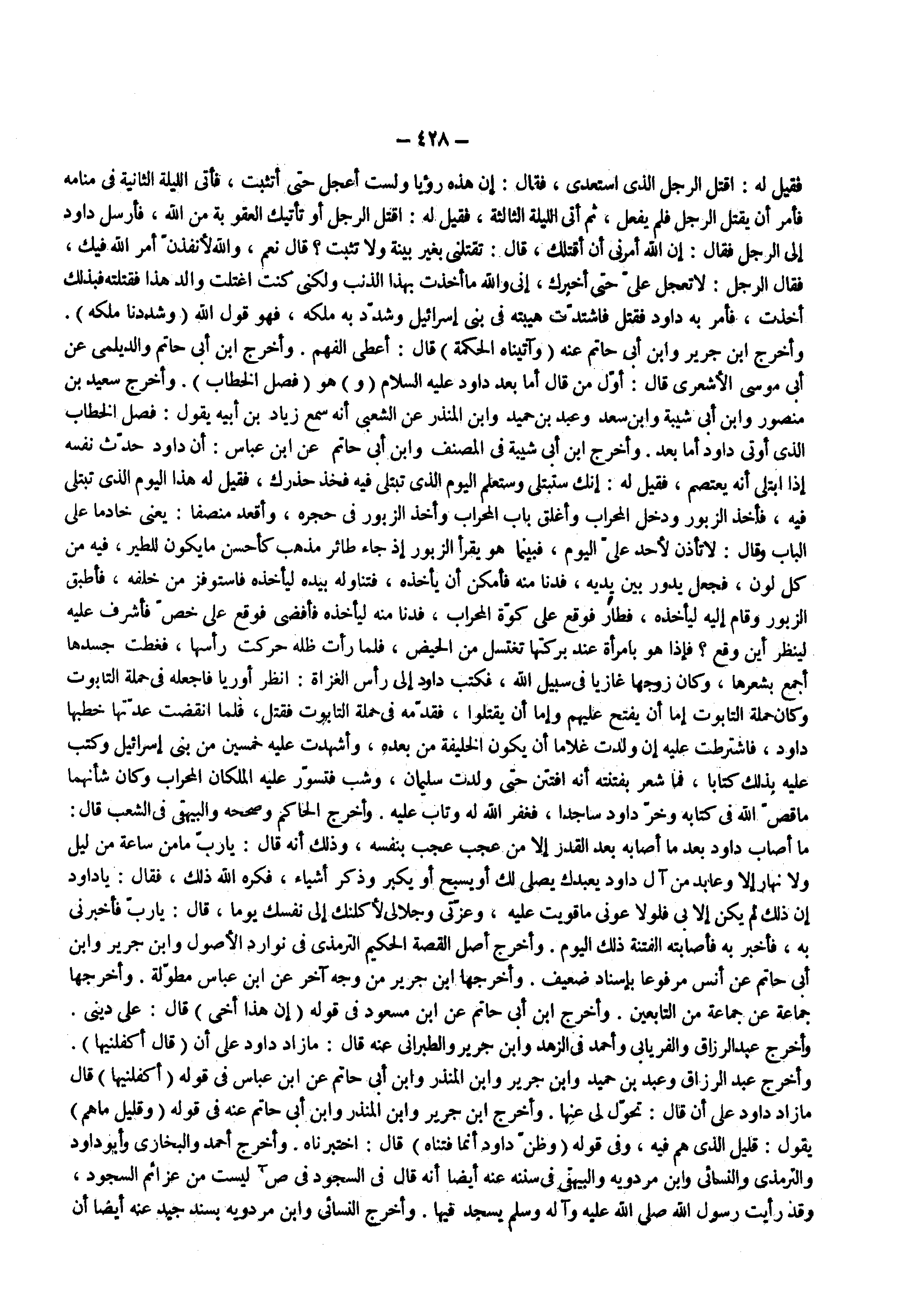 فقيل له اقتل الرجل الذى استعدى فقال إن هذه رؤيا ولست أعجل حتى أتثبت فأتى الليلة الثانية فى منامه فأمر أن يقتل الرجل فلم يفعل ثم أتى الليلة الثالثة فقيل له اقتل الرجل أو تأتيك العقوبة من الله فأرسل داود إلى الرجل فقال إن الله أمرنى أن أقتلك قال تقتلنى بغير بينة ولا تثبت قال نعم والله لأنفذن أمر الله فيك فقال الرجل لا تعجل على حتى أخبرك إنى والله ما أخذت بهذا الذنب ولكنى كنت اغتلت والد هذا فقتلته فبذلك أخذت فأمر به داود فقتل فاشتدت هيبته فى بنى إسرائيل وشدد به ملكه فهو قول الله ) وشددنا ملكه ( وأخرج ابن جرير وابن أبى حاتم عنه ) وآتيناه الحكمة ( قال أعطى الفهم وأخرج ابن أبى حاتم والديلمى عن أبى موسى الأشعرى قال أول من قال أما بعد داود عليه السلام و هو فصل الخطاب وأخرج سعيد بن منصور وابن أبى شيبة وابن سعد وعبد بن حميد وابن المنذر عن الشعبى أنه سمع زياد بن أبيه يقول فصل الخطاب الذى أوتى داود أما بعد وأخرج ابن أبى شيبة فى المصنف وابن أبى حاتم عن ابن عباس أن داود حدث نفسه إذا ابتلى أنه يعتصم فقيل له إنك ستبتلى وستعلم اليوم الذى تبتلى فيه فخذ حذرك فقيل له هذا اليوم الذى تبتلى فيه فأخذ الزبور ودخل المحراب وأغلق باب المحراب وأخذ الزبور فى حجره وأقعد منصفا يعنى خادما على الباب وقال لا تأذن لأحد على اليوم فبينما هو يقرأ الزبور إذ جاء طائر مذهب كأحسن ما يكون للطير فيه من كل لون فجعل يدور بين يديه فدنا منه فأمكن أن يأخذه فتناوله بيده ليأخذه فاستوفز من خلفه فأطبق الزبور وقام إليه ليأخذه فطار فوقع على كوة المحراب فدنا منه ليأخذه فأفضى فوقع على خص فأشرف عليه لينظر أين وقع فإذا هو بامرأة عند بركتها تغتسل من الحيض فلما رأت ظله حركت رأسها فغطت جسدها أجمع بشعرها وكان زوجها غازيا فى سبيل الله فكتب داود إلى رأس الغزاة انظر أوريا فاجعله فى حملة التابوت وكان حملة التابوت إما أن يفتح عليهم وإما أن يقتلوا فقدمه فى حملة التابوت فقتل فلما انقضت عدتها خطبها داود فاشترطت عليه إن ولدت غلاما أن يكون الخليفة من بعده وأشهدت عليه خمسين من بنى إسرائيل وكتب عليه بذلك كتابا فلما شعر بفتنته أنه أفتتن حتى ولدت سليمان وشب فتسور عليه الملكان المحراب وكان شأنهما ما قص الله فى كتابه وخر داود ساجدا فغفر الله له وتاب عليه وأخرج الحاكم وصححه والبيهقى فى الشعب قال ما أصاب داود بعد ما أصابه بعد القدر إلا من عجب عجب بنفسه وذلك أنه قال يا رب ما من ساعة من ليل ولا نهار إلا وعابد من آل داود يعبدك يصلى لك أو يسبح أو يكبر وذكر أشياء فكره الله ذلك فقال يا داود إن ذلك لم يكن إلا بى فلولا عونى ما قويت عليه وعزتى وجلالى لأكلنك إلى نفسك يوما قال يا رب فأخبرنى به فأخبر به فأصابته الفتنة ذلك اليوم وأخرج أصل القصة الحكيم والترمذى فى نوارد الأصول وابن جرير وابن أبى حاتم عن أنس مرفوعا بإسناد ضعيف وأخرجها ابن جرير من وجه آخر عن ابن عباس مطولة وأخرجها جماعة عن جماعة من التابعين وأخرج ابن أبى حاتم عن ابن مسعود فى قوله ) إن هذا أخي ( قال على دينى وأخرج عبد الرزاق والفريابى وأحمد فى الزهد وابن جرير والطبرانى عنه قال ما زاد داود على أن ) فقال أكفلنيها ( وأخرج عبد الرزاق وعبد بن حميد وابن جرير وابن المنذر وابن أبى حاتم عن ابن عباس فى قوله ) أكفلنيها ( قال ما زاد داود على أن قال تحول لى عنها وأخرج ابن جرير وابن المنذر وابن أبى حاتم عنه فى قوله ) وقليل ما هم ( يقول قليل الذى هم فيه وفى قوله ) وظن داود أنما فتناه ( قال اختبرناه وأخرج أحمد والبخارى وأبو داود والترمذى والنسائى وابن مردويه والبيهقى فى سننه عنه أيضا أنه قال فى السجود فى ص ليست من عزائم السجود وقد رأيت رسول الله ( صلى الله عليه وسلم ) يسجد فيها وأخرج النسائى وابن مردويه بسند جيد عنه أيضا أن