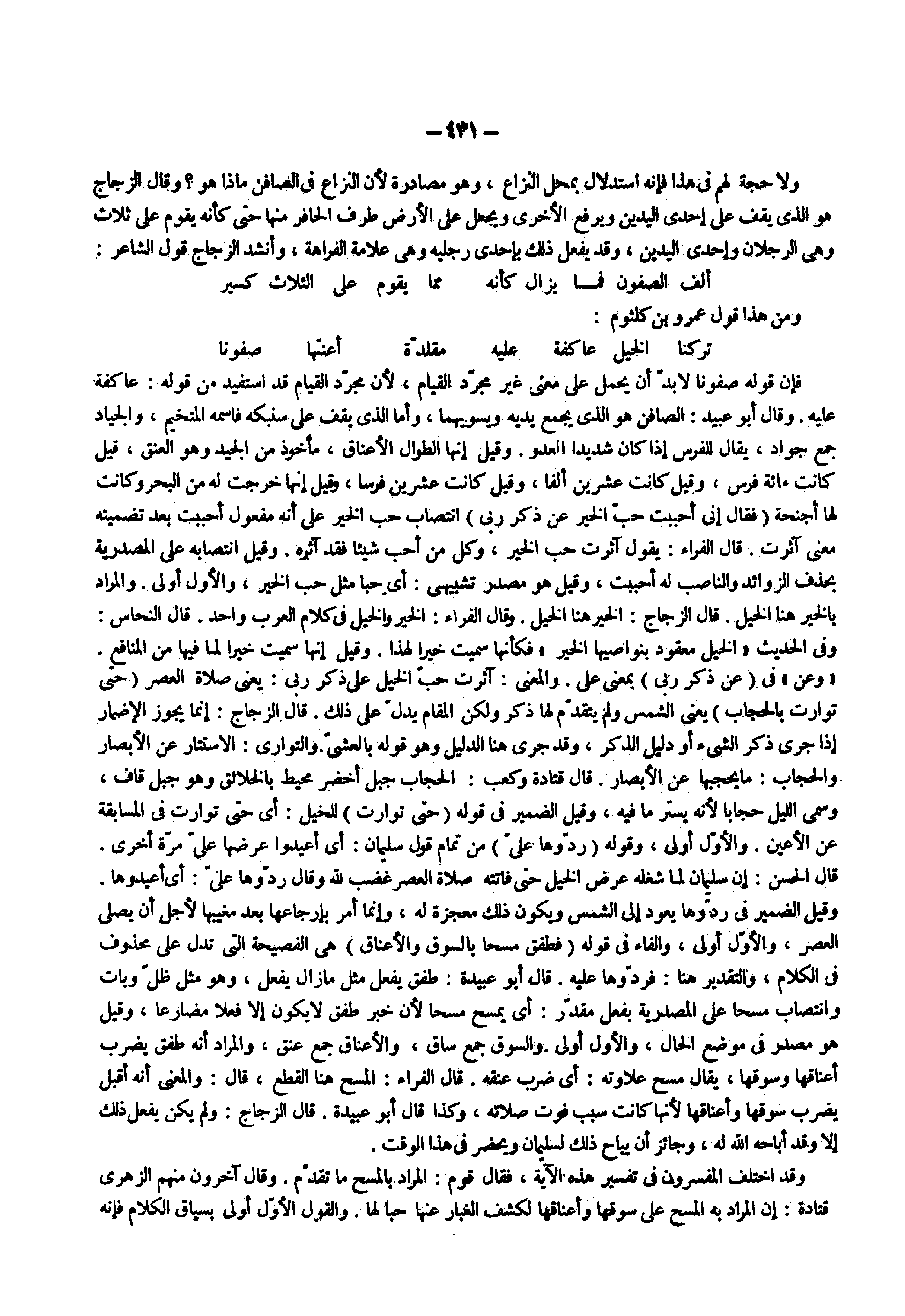 وقد اختلف المفسرون فى تفسير هذه الآية فقال قوم المراد بالمسح ما تقدم وقال آخرون منهم الزهرى وقتادة إن المراد به المسح على سوقها وأعناقها لكشف الغبار عنها حبا لها والقول الأول أولى بسياق الكلام فإنه
